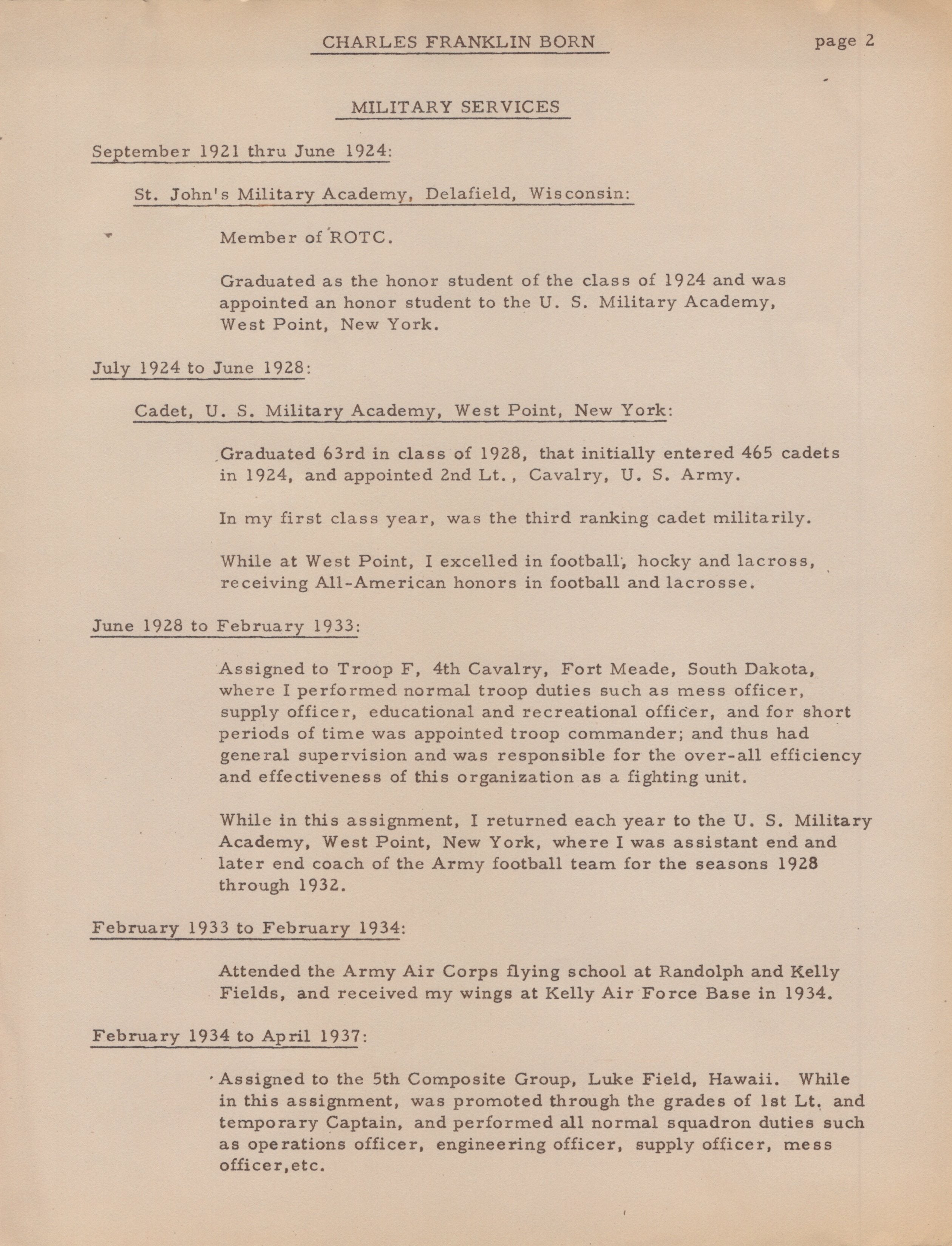 - Binder of original documents including Born’s official Military Services record, 9 pages detailing all of the work he conducted during his time in the military. It also notes every award he received with his own added annotations. Also in this binder are documents with his awards listed, an envelope with small pieces of paper listing every award he received, and several printed photos of Born and pages from his Wikipedia, along with Wikipedia pages of the awards he was awarded.