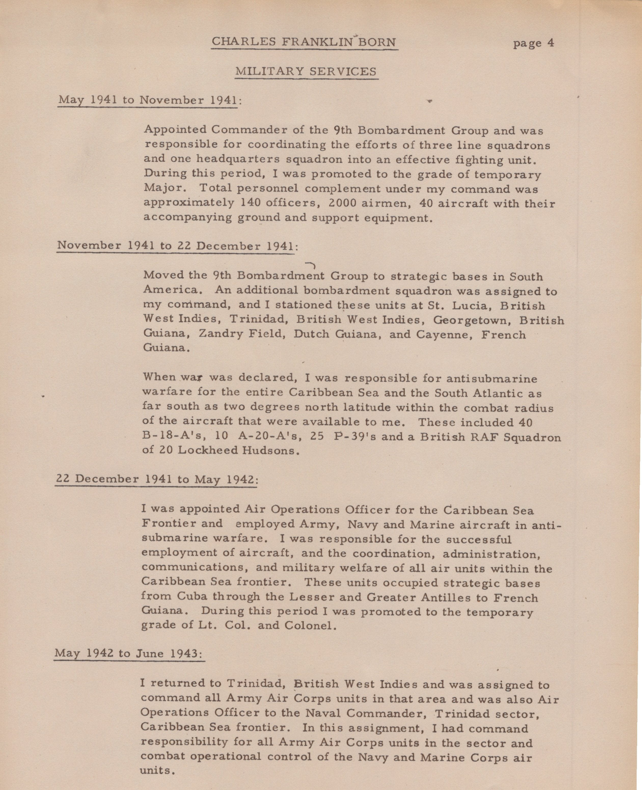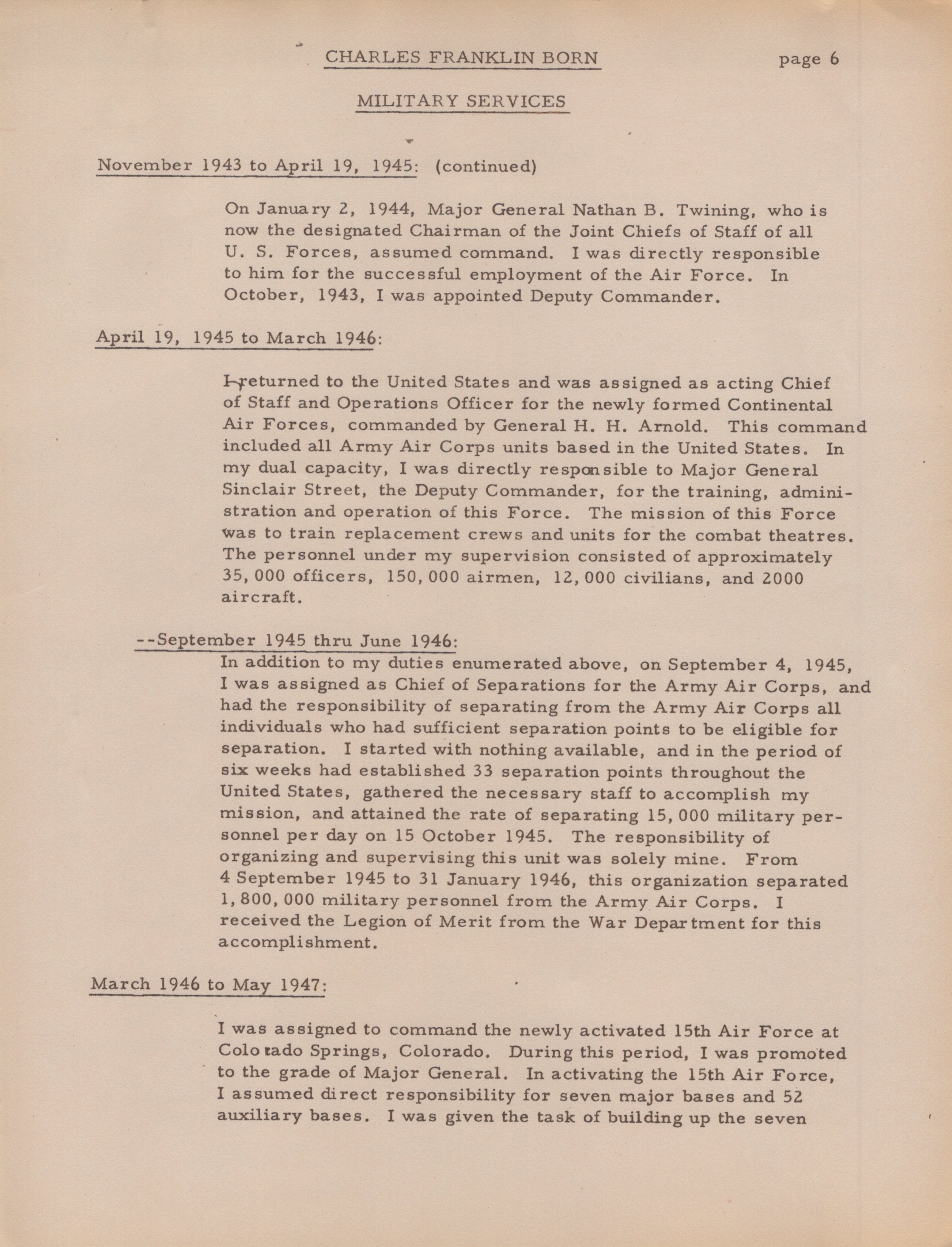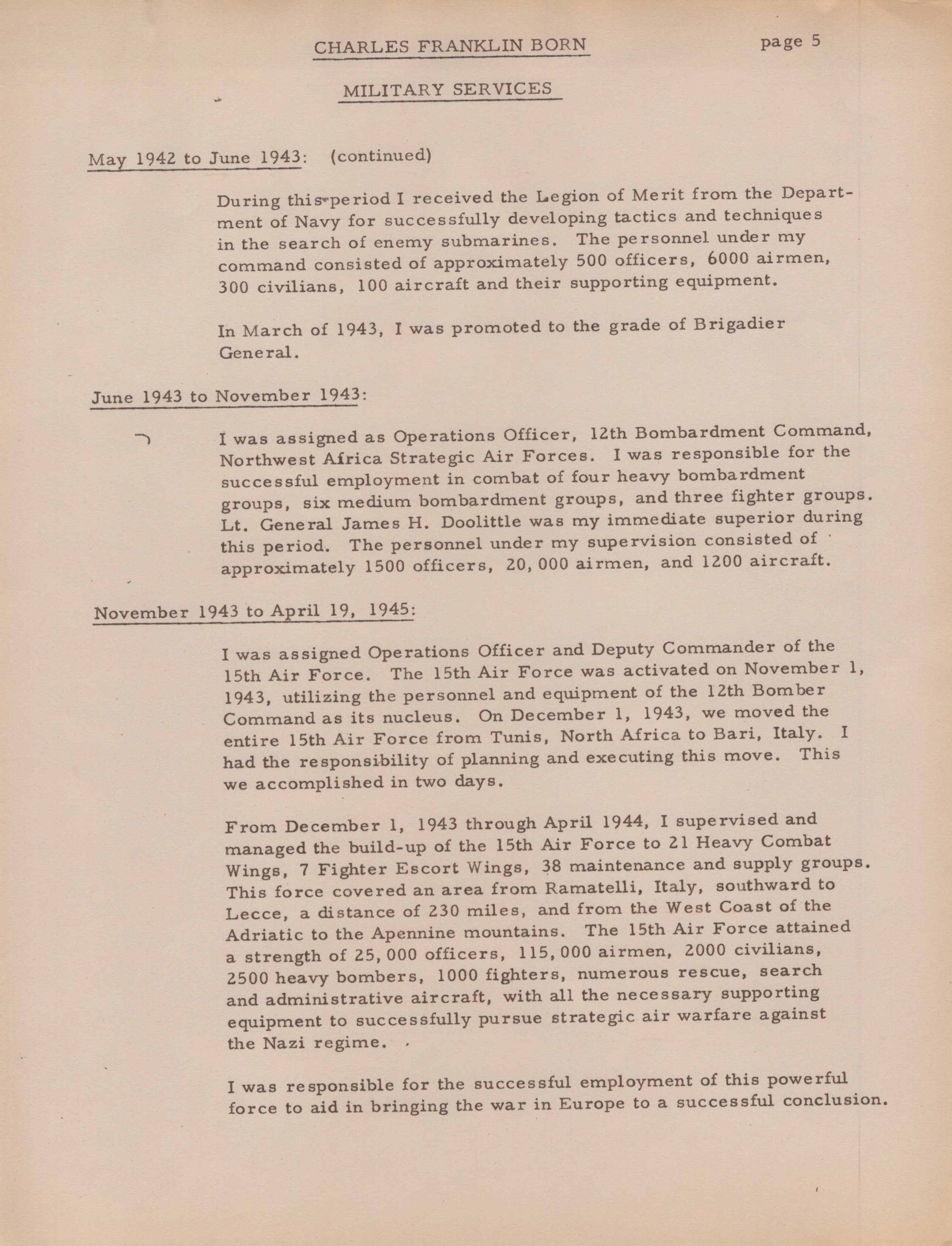 After moving the 9th Bomb group to strategic bases in South America, he was appointed Air Operations Officer for the Caribbean Sea Frontier and employed Army, Navy, and Marine Corps aircraft in anti-submarine warfare. He later handled anti-submarine warfare in the Trinidad sector, being awarded the Legion of Merit for the first time in June 1943. He was then assigned as Operations Officer, 12th Bombardment Command, Northwest Africa Strategic Air Forces. During this period, Lieutenant General James H. Doolittle was Born’s immediate superior. In November of 1943, Born was assigned Operations Officer and Deputy Commander of the entire 15th Air Force, a command he would hold until April 19th, 1945. During this period, Born was responsible for the successful employment of this powerful force to aid in bringing the war in Europe to a successful conclusion. His immediate superior during this period was Major General Nathan B. Twining.