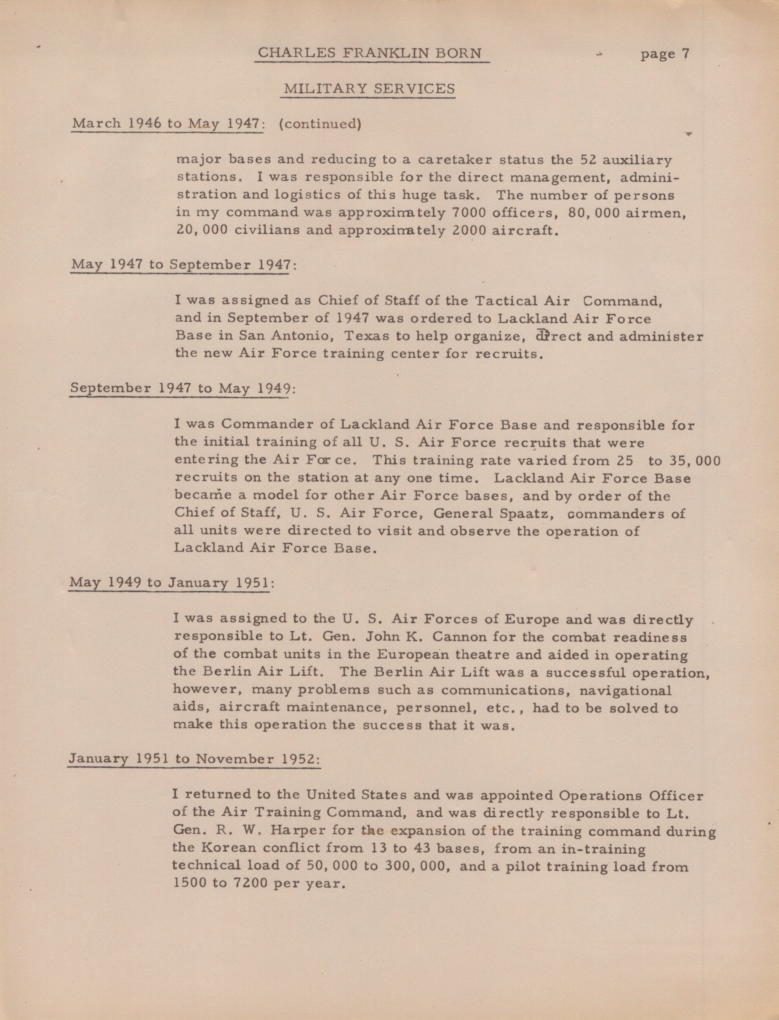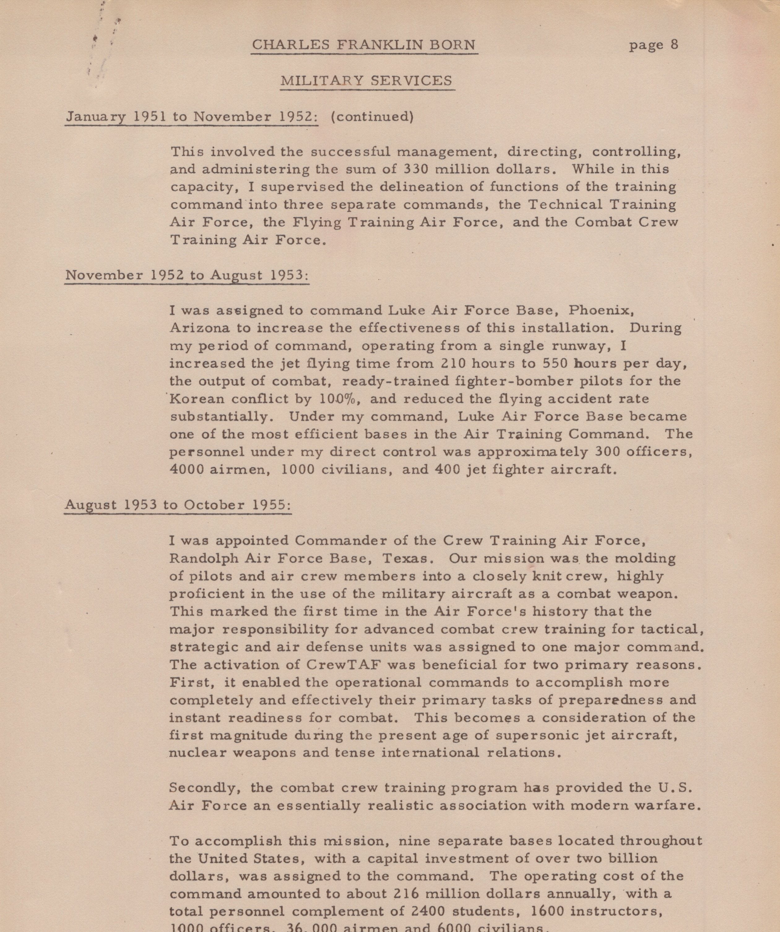 In 1949, Born was assigned to the U.S. Air Forces of Europe and aided in operating the Berlin Air Lift, and was instrumental in the success of that mission. In 1951, he returned to the U.S. and was appointed Operations Officer of the new Air Training Command, and was responsible for the expansion of training command during the Korean War from 13 bases to 43 bases. In 1952 he commanded Luke Air Force base in Phoenix, Arizona, and in 1953 was appointed Commander of the Crew Training Air Force, Randolph Air Force Base, Texas. During his time in CrewTAF, he was responsible for roughly $2 Billion in capital investment in building CrewTAF bases across the country, which ended up covering nearly 8 million acres of land. His responsibility during this period was the complete management of CrewTAF nationwide.