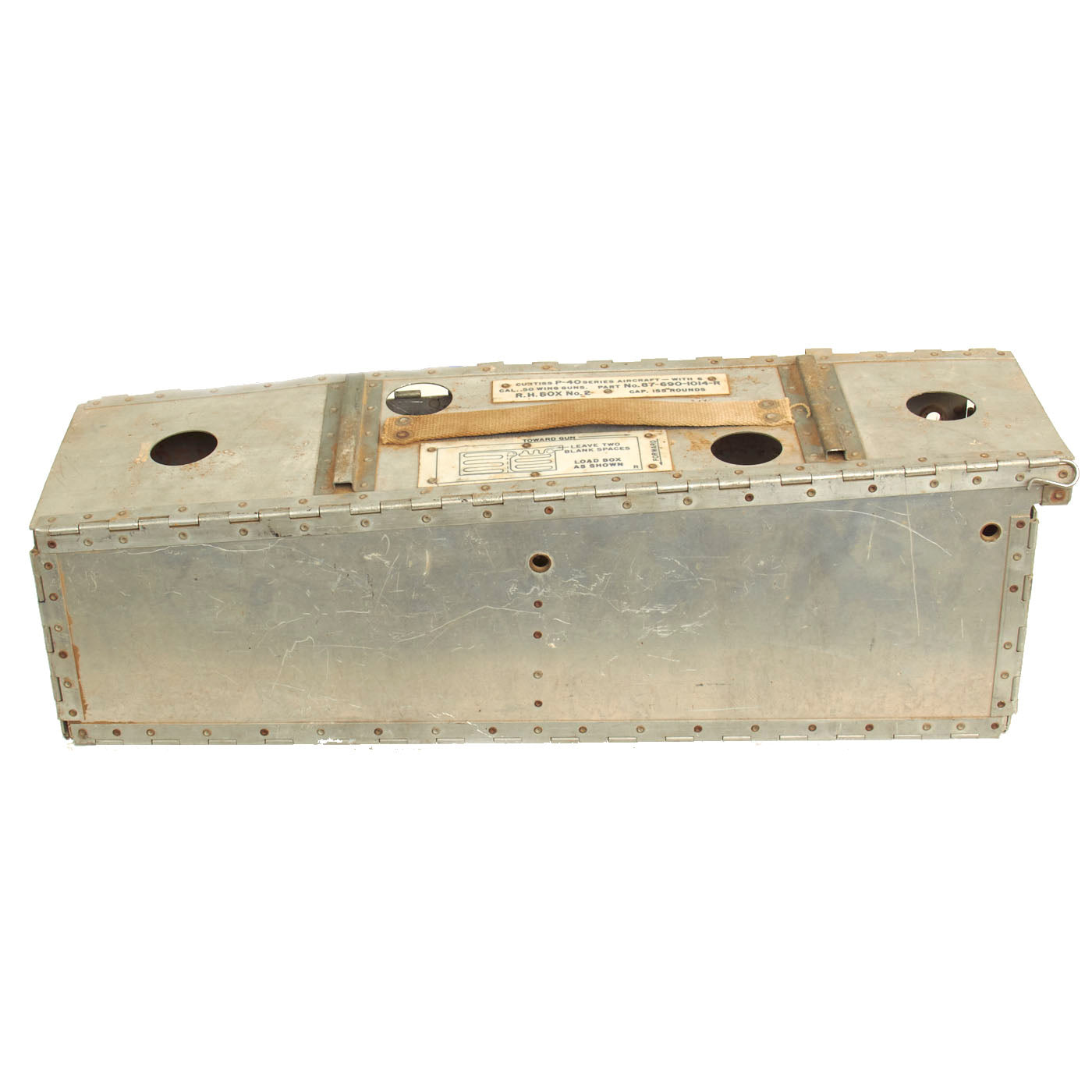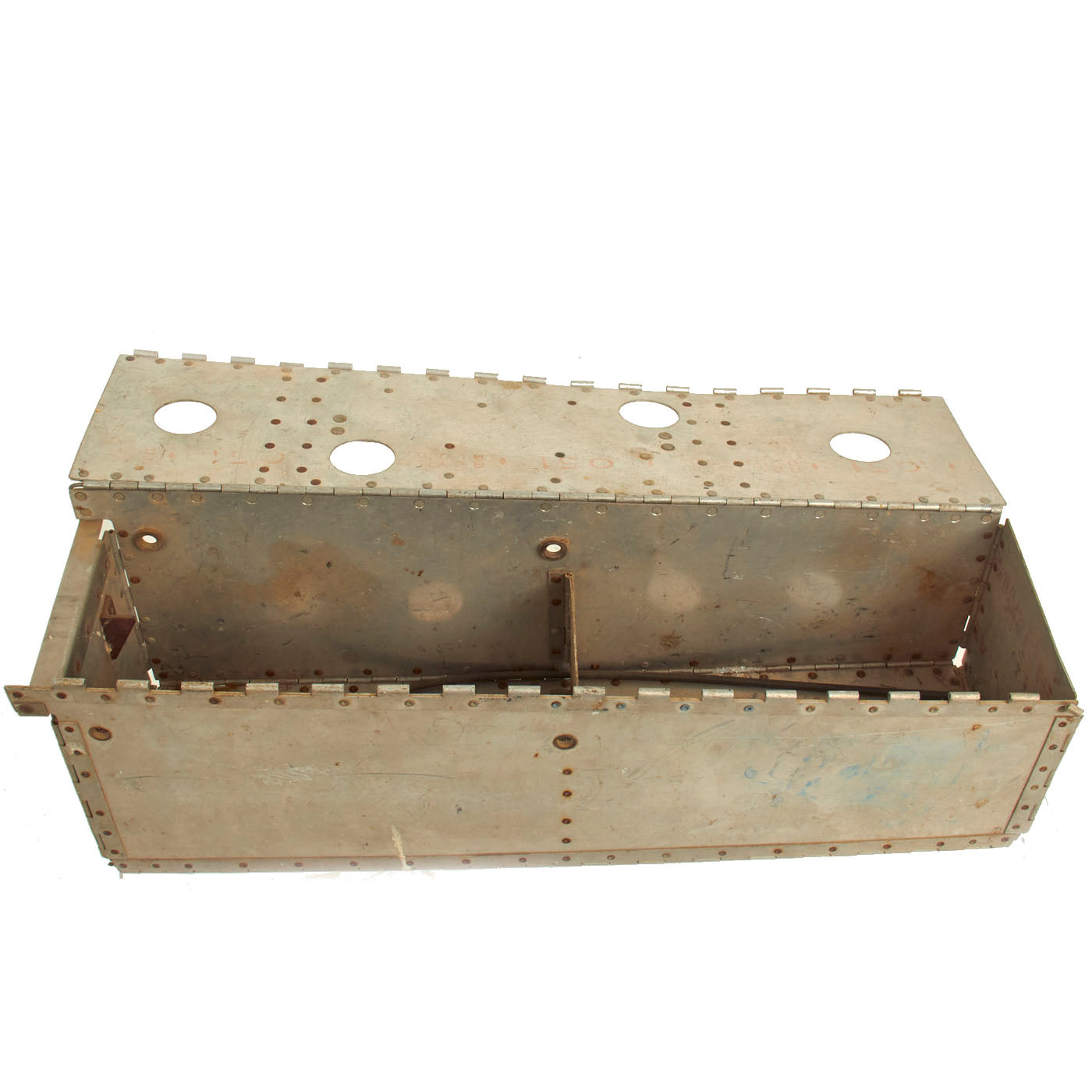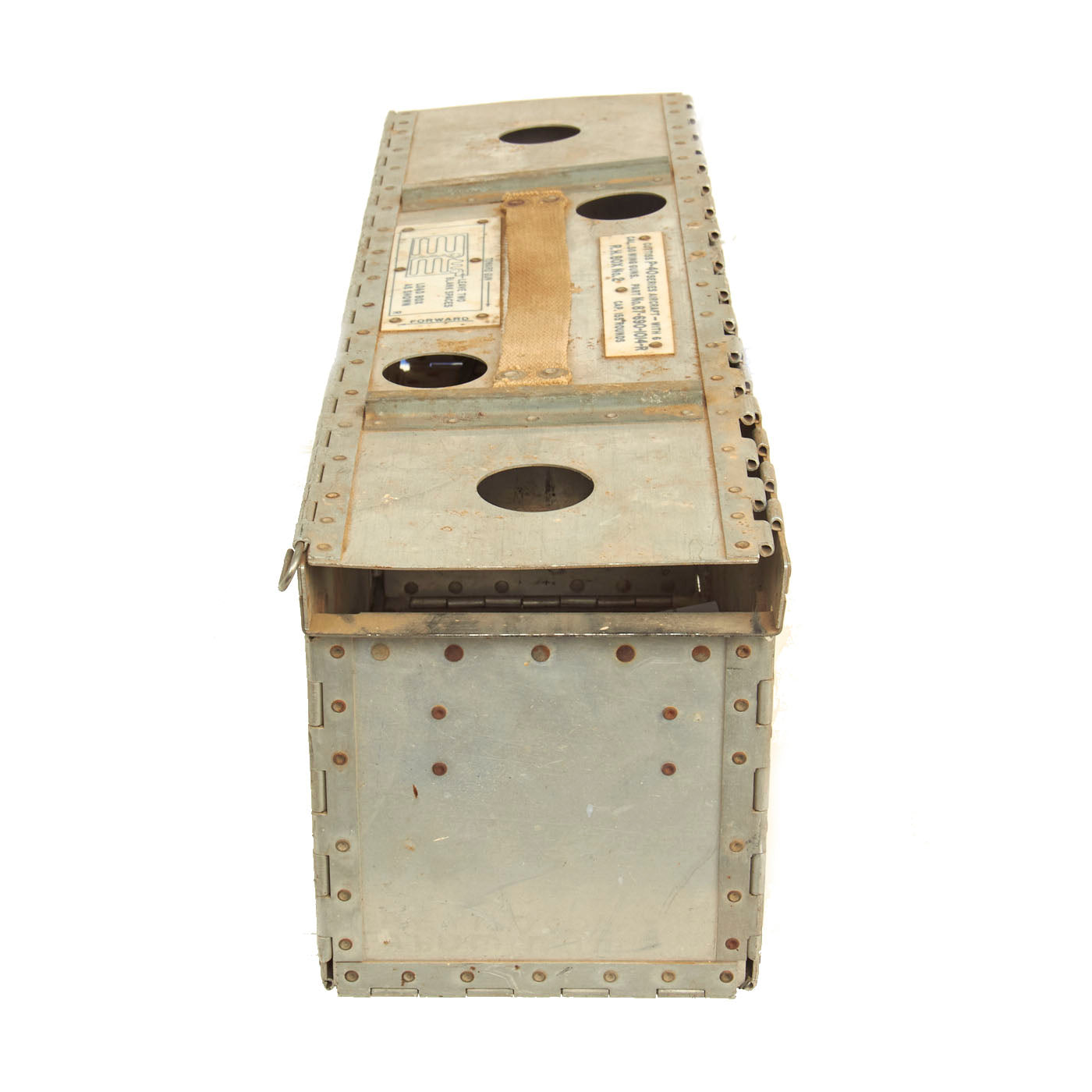 The ammo can is in good condition and still retains the data plates riveted on the top cover. The retaining pin to secure the can in the closed position is missing and the other pin is essentially used as a hinge but can still be removed. This can was for the CURTISS P-40 SERIES AIRCRAFT - WITH 6 / CAL. .50 WING GUNS. The part number is 87-690-1014-R and the capacity is stated has being for 155 Rounds. It measures approximately 21 1/2" x 6" x 7".