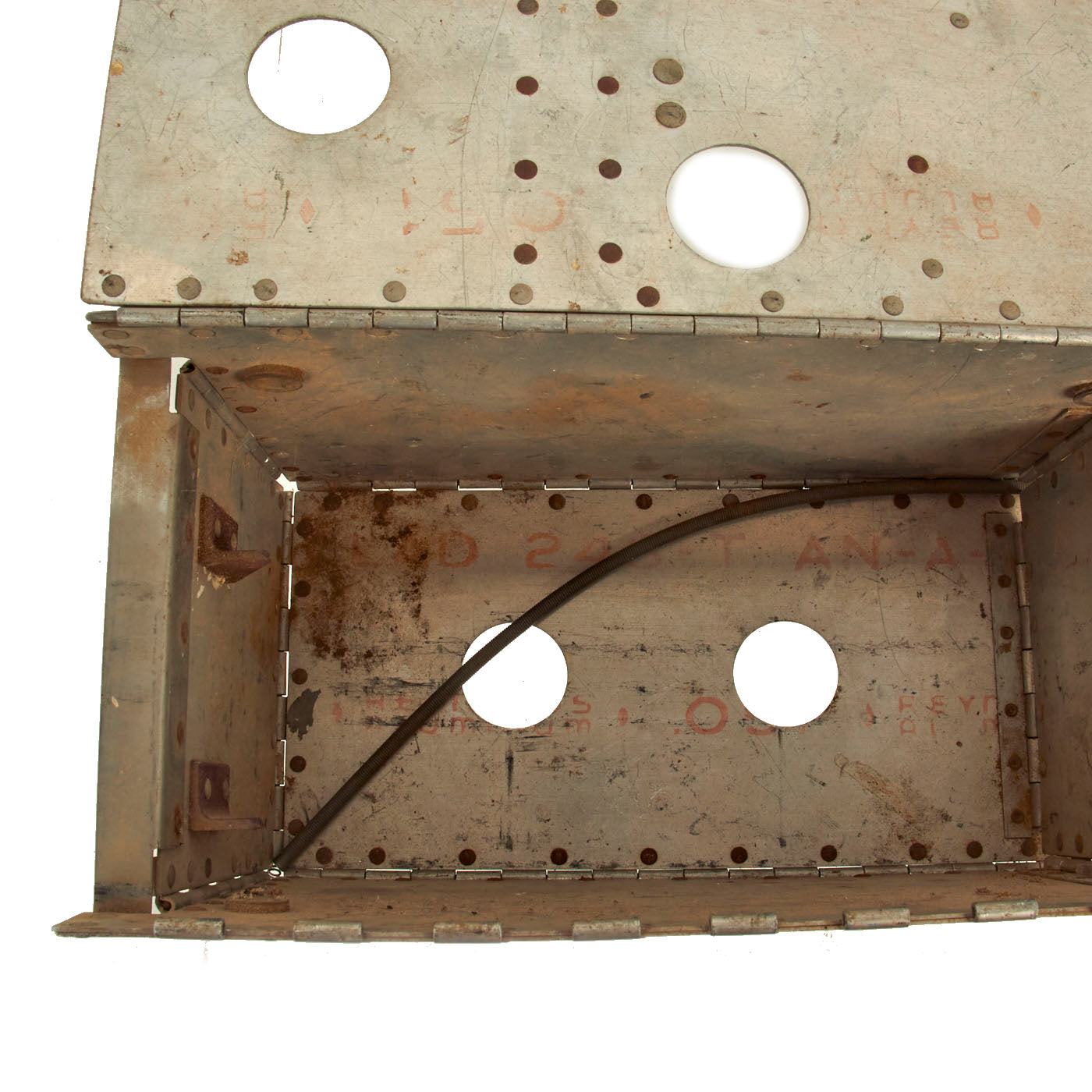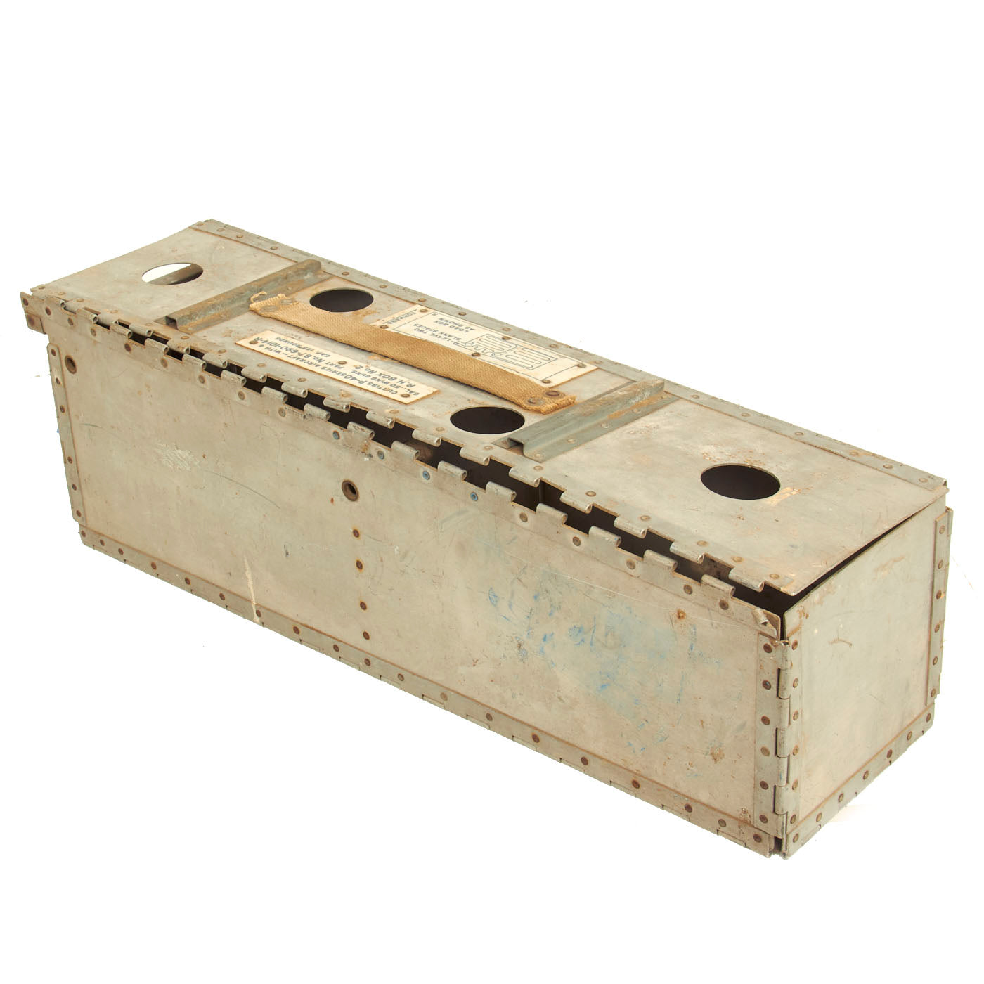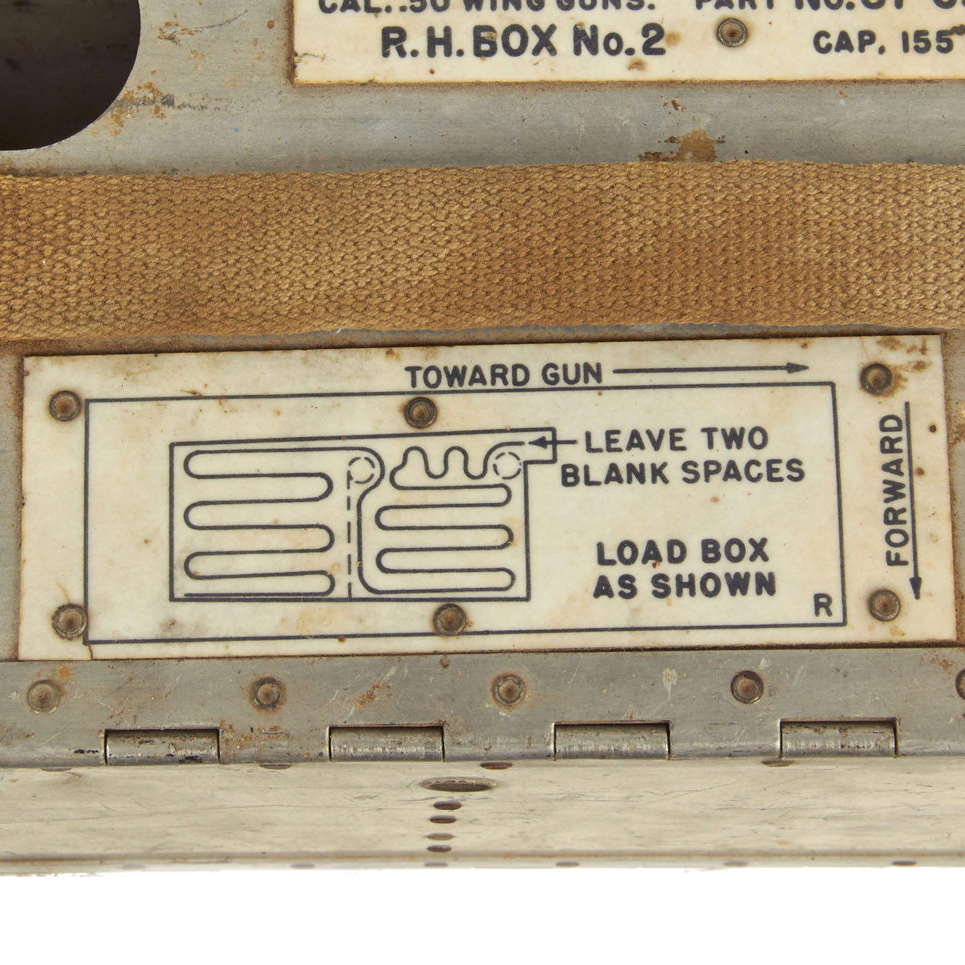 The ammo can is in good condition and still retains the data plates riveted on the top cover. The retaining pin to secure the can in the closed position is missing and the other pin is essentially used as a hinge but can still be removed. This can was for the CURTISS P-40 SERIES AIRCRAFT - WITH 6 / CAL. .50 WING GUNS. The part number is 87-690-1014-R and the capacity is stated has being for 155 Rounds. It measures approximately 21 1/2" x 6" x 7".