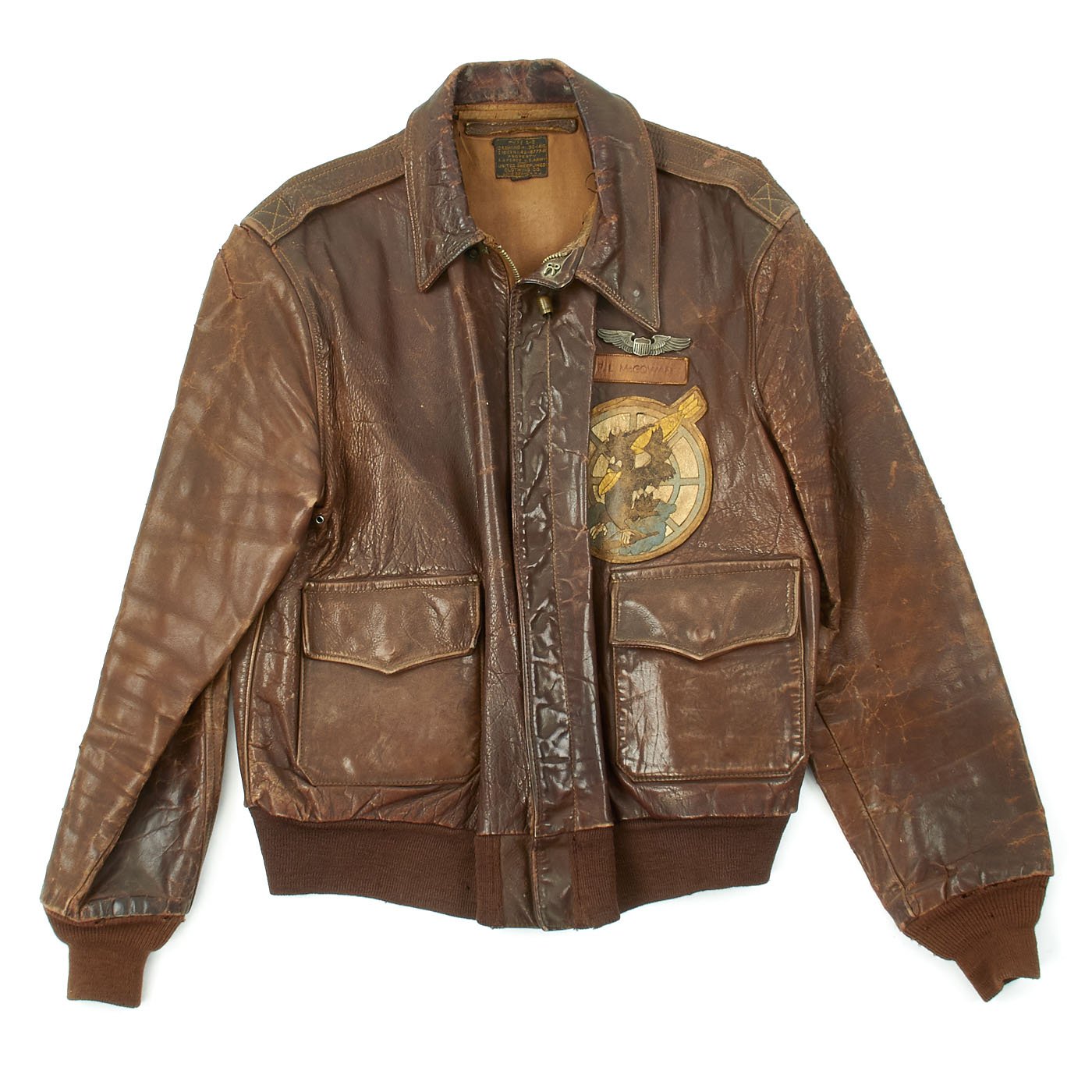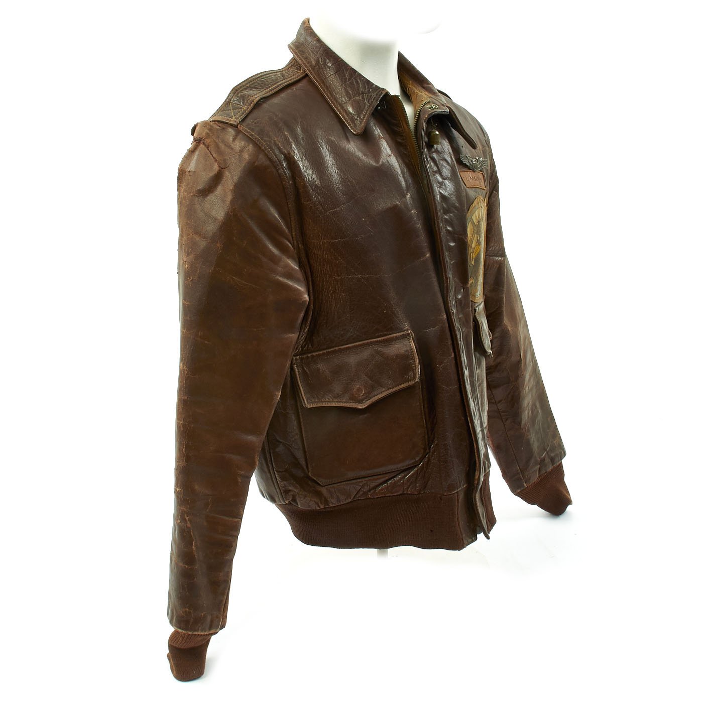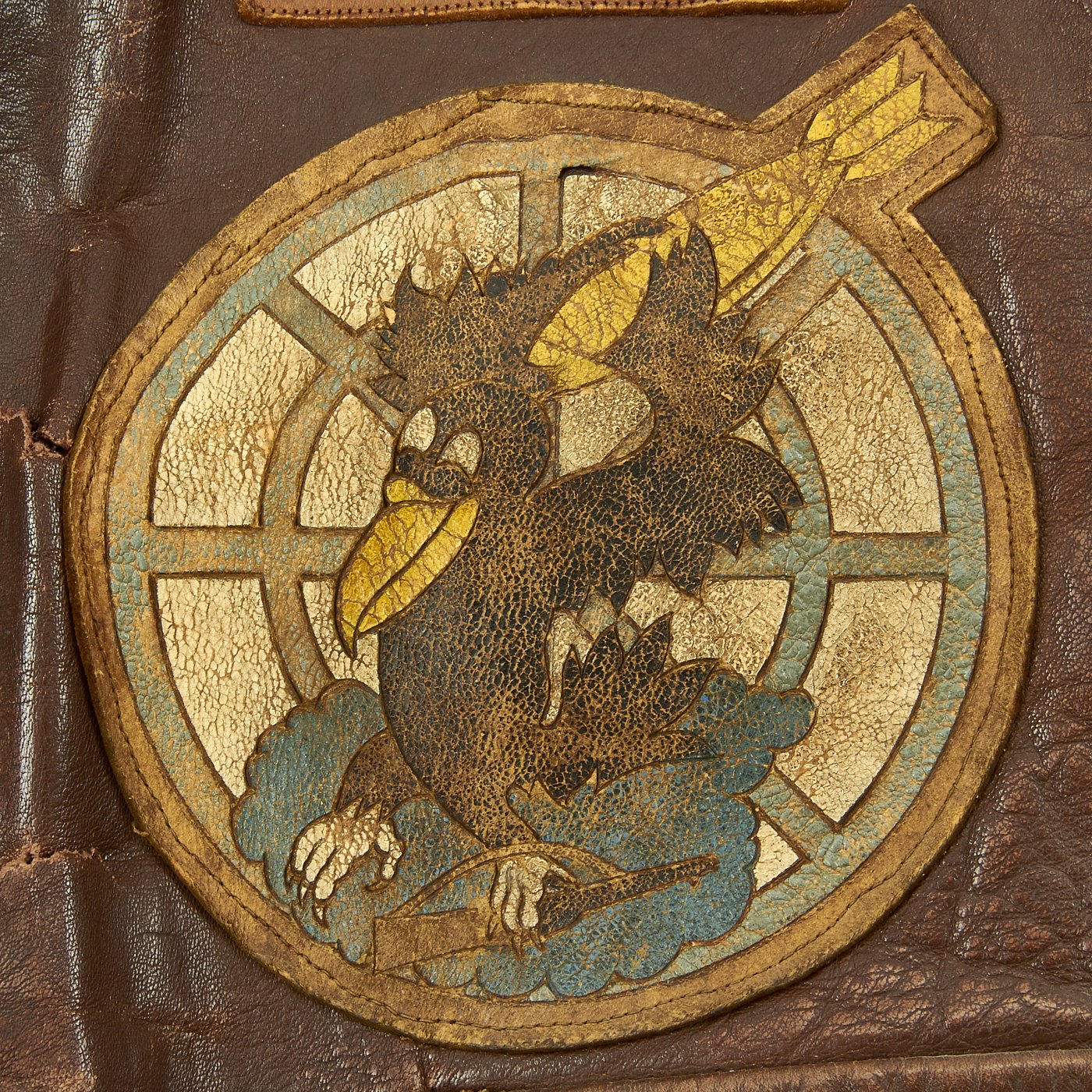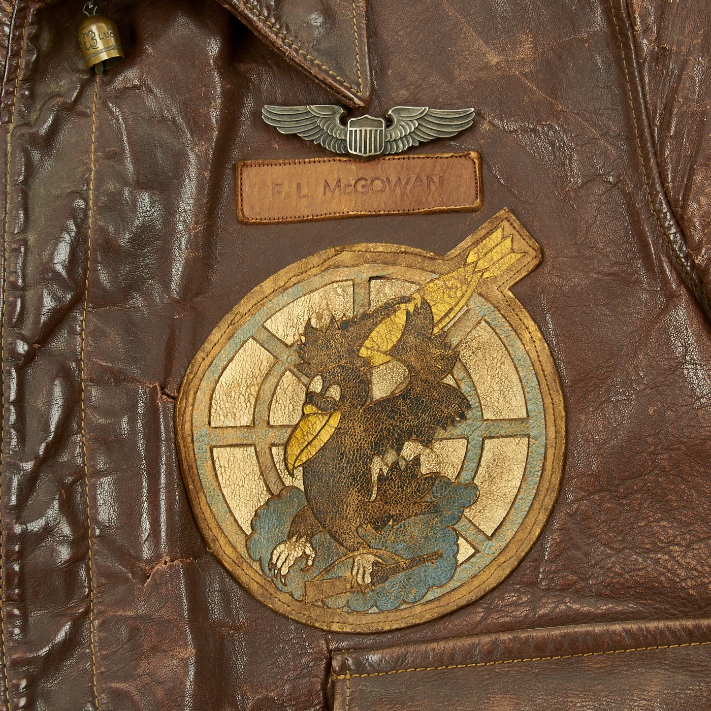 This is a wonderful condition A-2 jacket that features with a fantastic hand painted large leather 527th Fighter-Bomber Squadron circular patch to left chest and shows a black bird thrown a yellow bomb down over his head. Above the patch is a leather branded name tag the reads F.L. McGowan and above the name tag is a pair of sterling silver pilot wings. The jacket is a large size 42 with original lining, original cuffs, original waistband, functional talon zipper and a data label from United Sheeplined Clothing Company. Attached to the front collar is a small brass bell that is engraved GOOD LUCK with a four leaf clover. Overall condition of the jacket is very good with supple leather but there is flaking cracking and some wear to the shoulders.