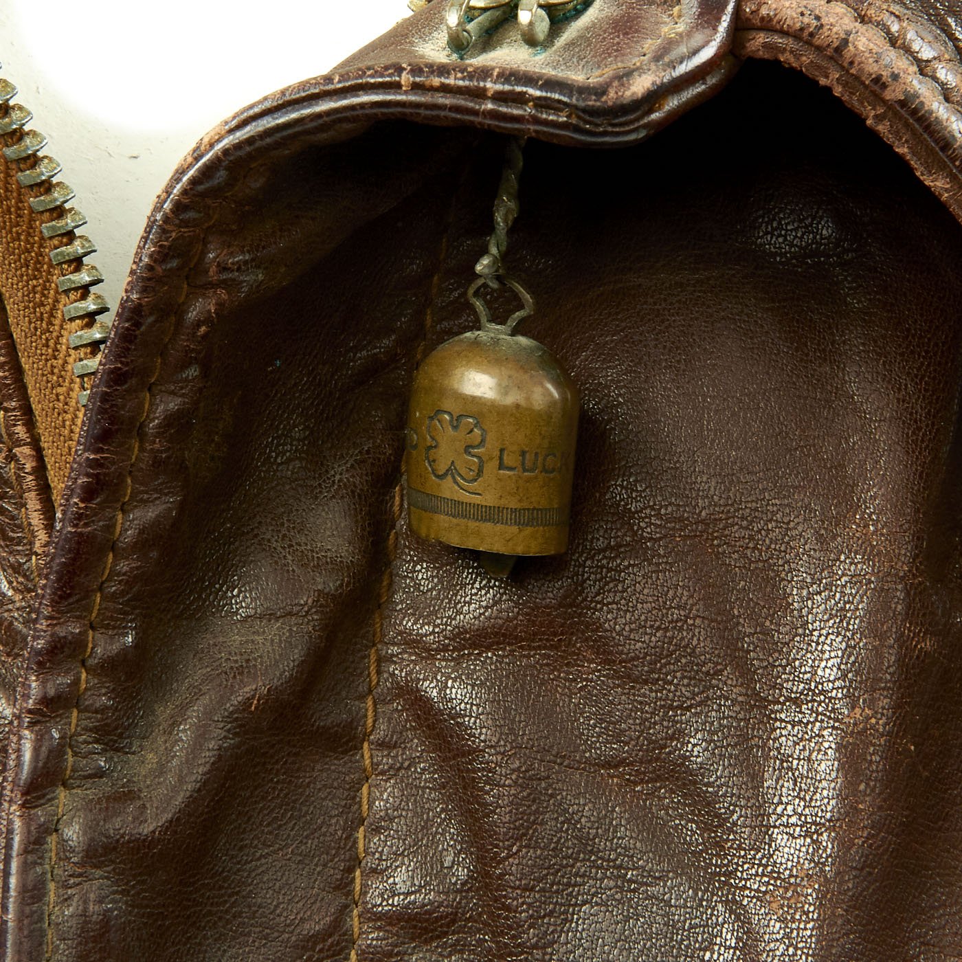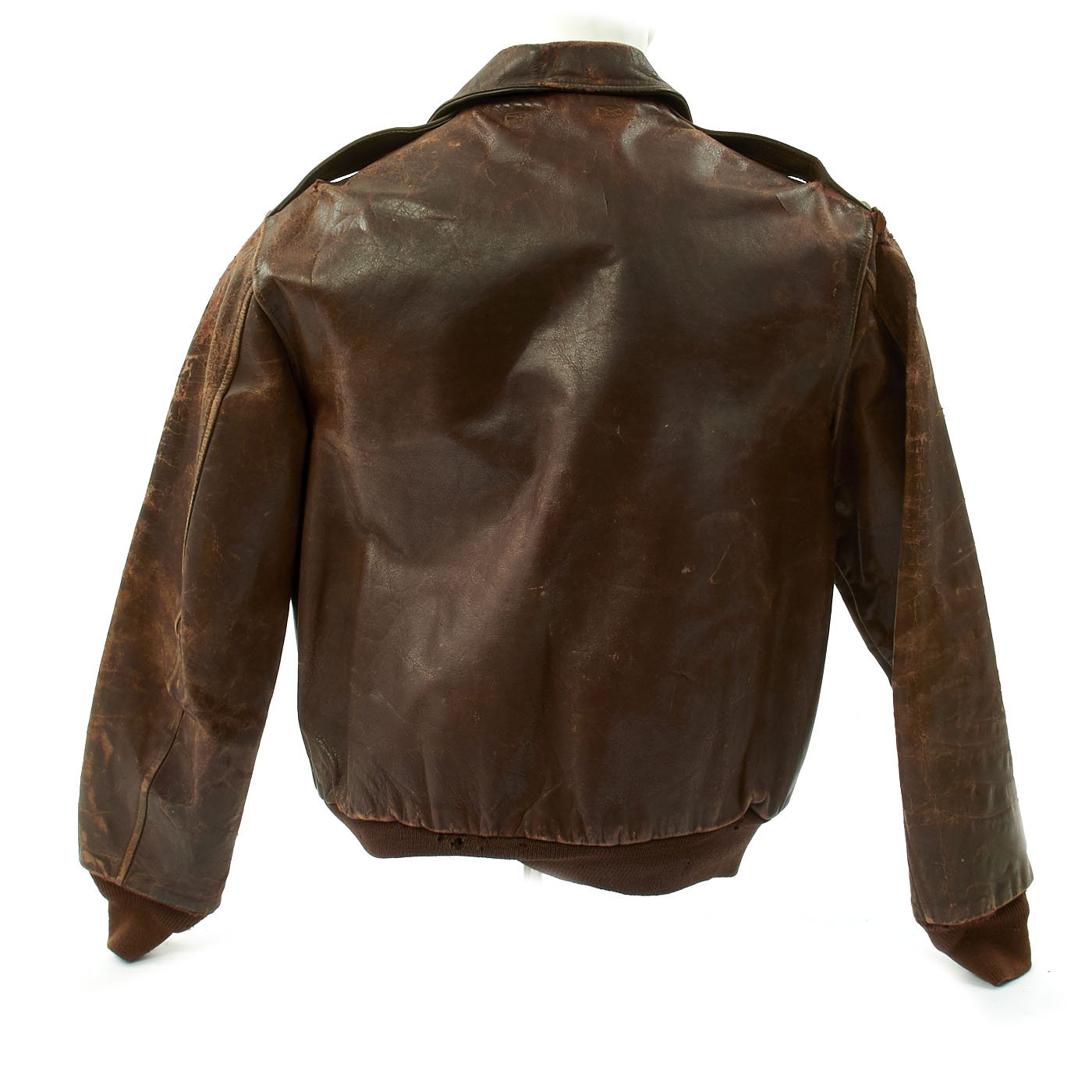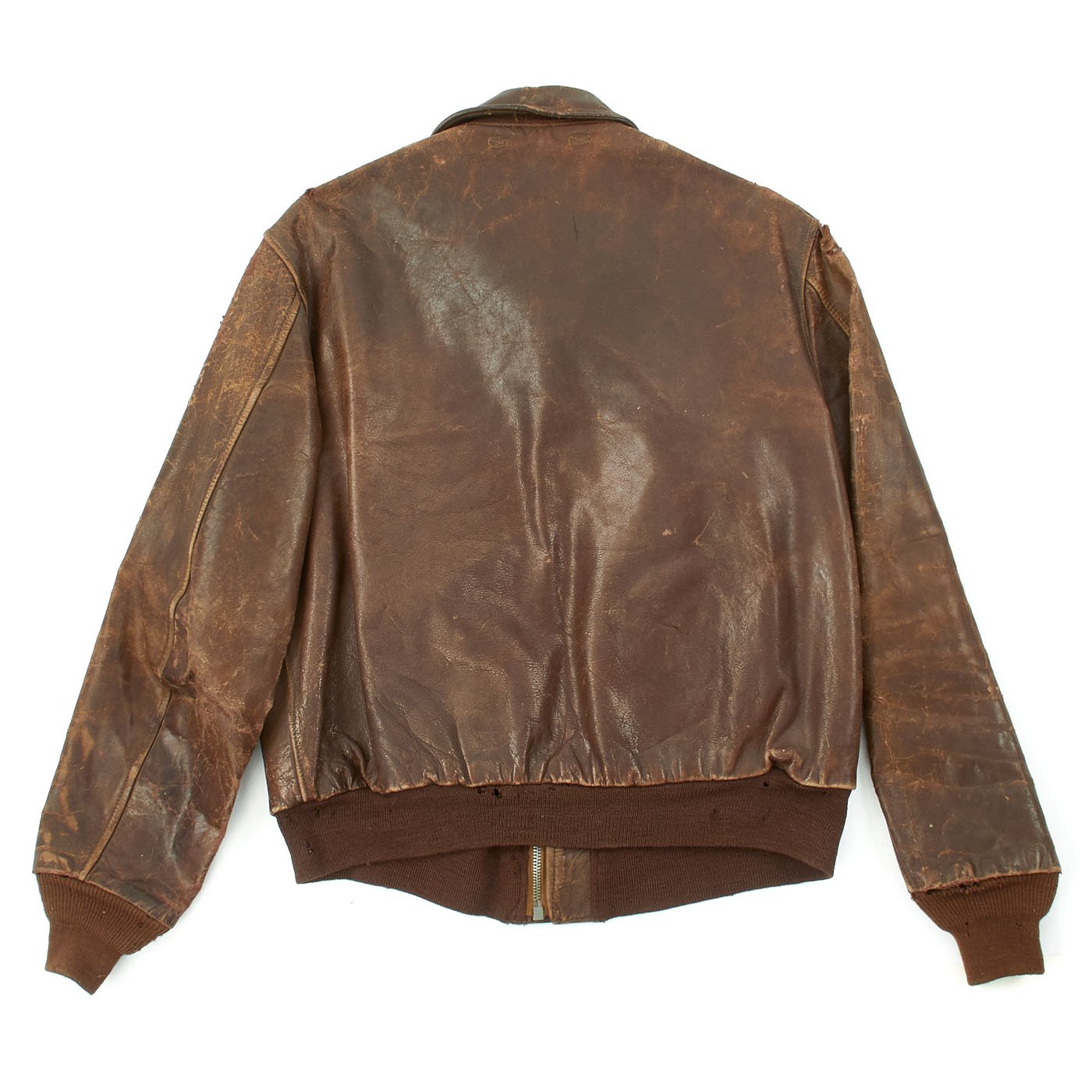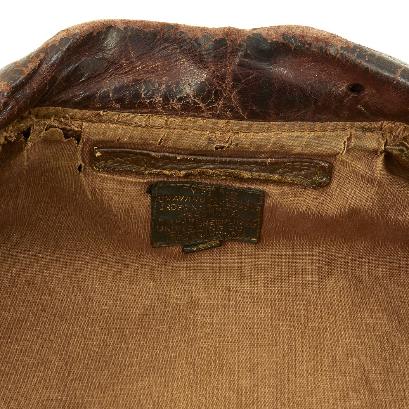 This is a wonderful condition A-2 jacket that features with a fantastic hand painted large leather 527th Fighter-Bomber Squadron circular patch to left chest and shows a black bird thrown a yellow bomb down over his head. Above the patch is a leather branded name tag the reads F.L. McGowan and above the name tag is a pair of sterling silver pilot wings. The jacket is a large size 42 with original lining, original cuffs, original waistband, functional talon zipper and a data label from United Sheeplined Clothing Company. Attached to the front collar is a small brass bell that is engraved GOOD LUCK with a four leaf clover. Overall condition of the jacket is very good with supple leather but there is flaking cracking and some wear to the shoulders.