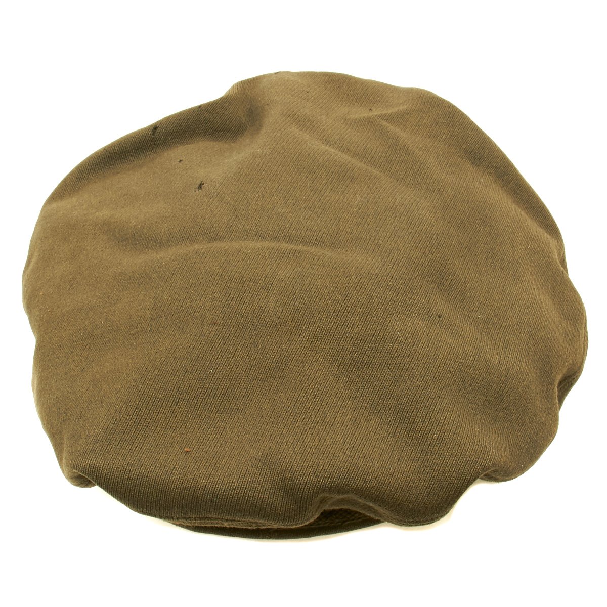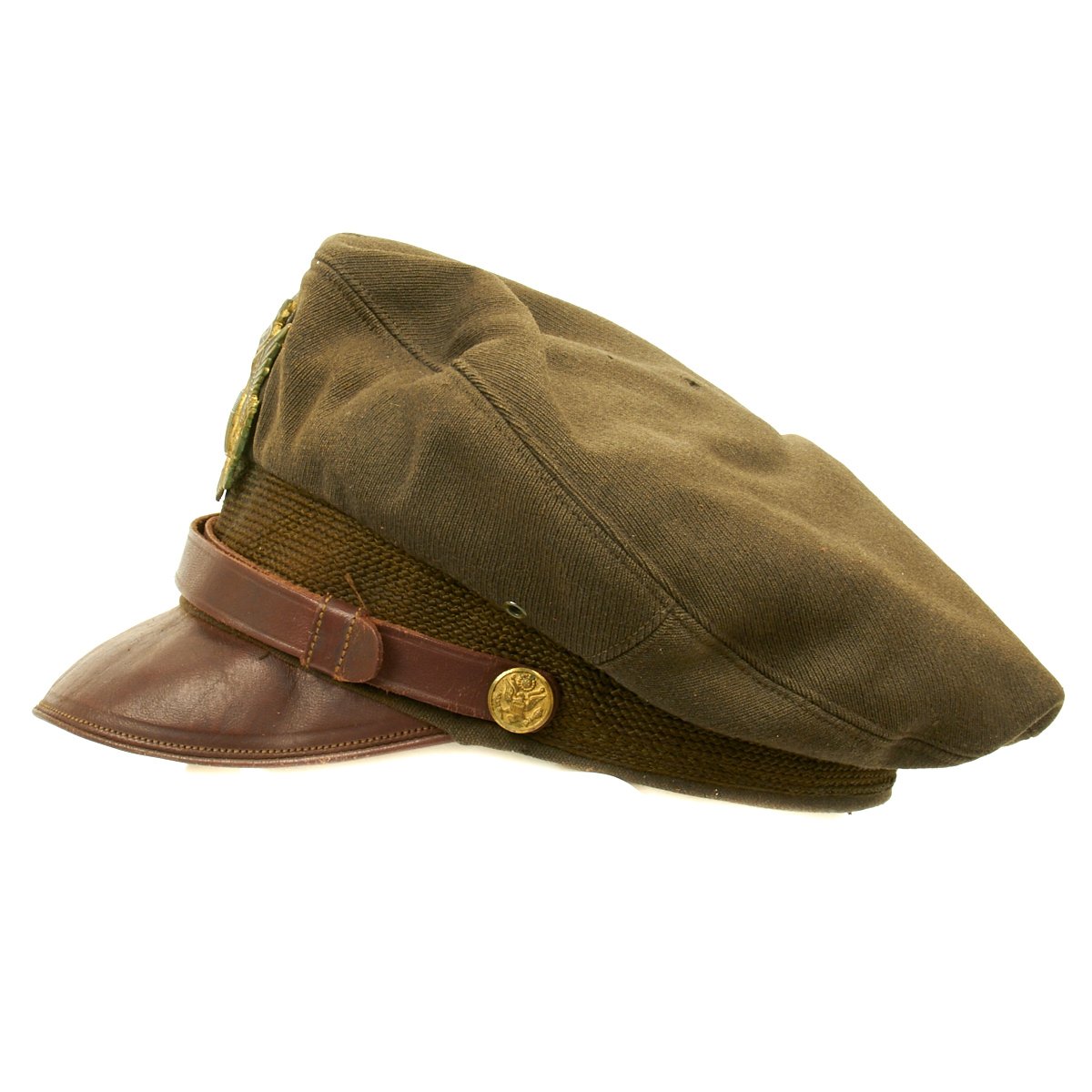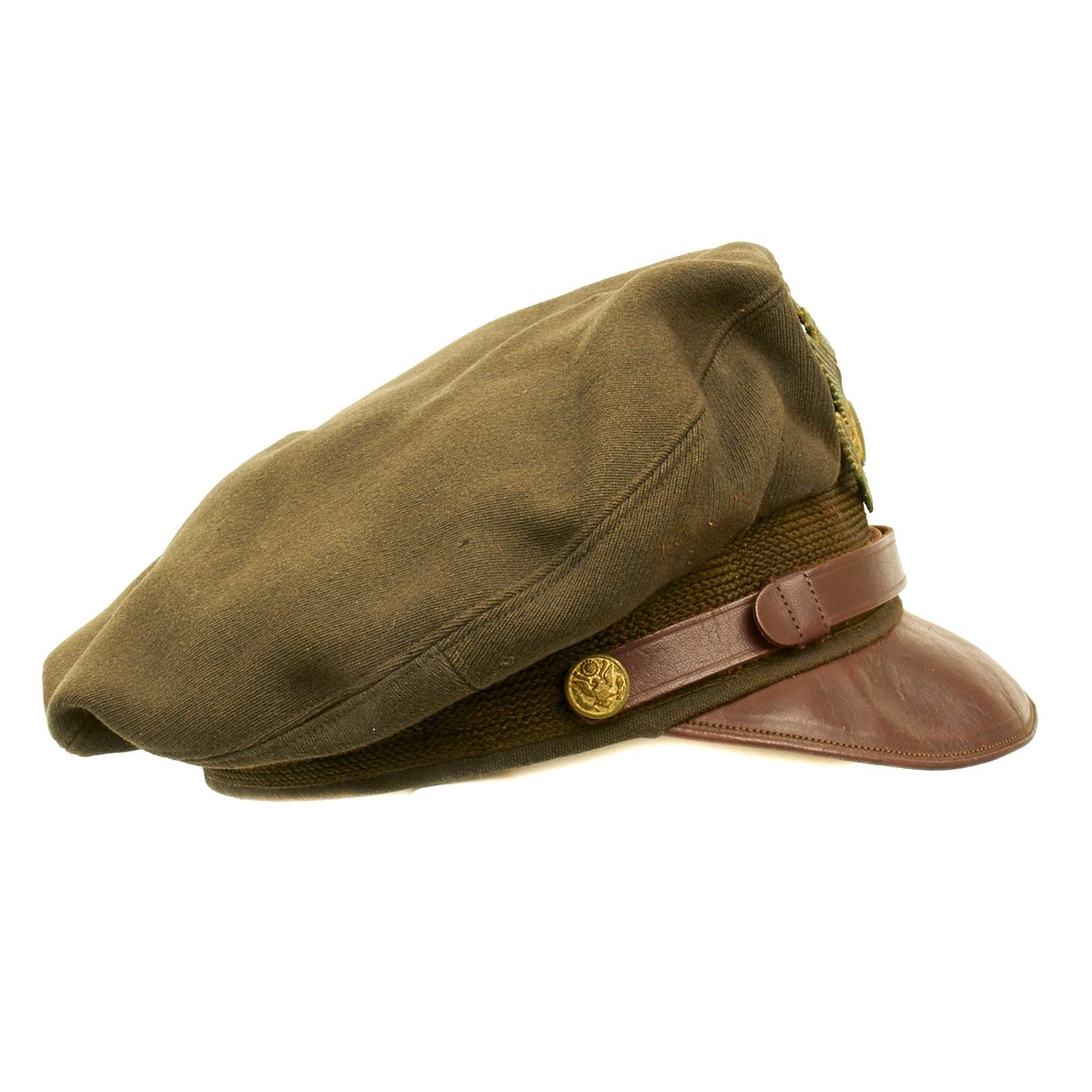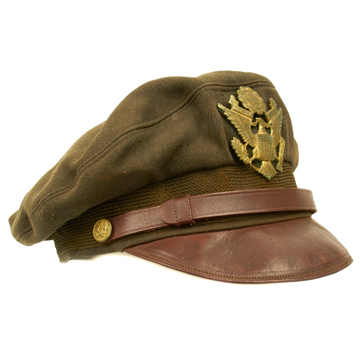 This "crush" or "crusher" cap has the classic "bomber pilot" look of a USAAF pilot in Europe. This was the standard Army AAF officer's dress cap, worn by pilots and non-pilots alike, but pilots gave this cap their own unique twist. Normally, this cap had stiffeners - a support piece behind the cap device and a wire around the inside top perimeter to maintain the cap's round shape. These kept the cap in its proper, regulation military shape and angle. However, since bomber pilots wore headsets over their caps during flights, they would remove the wire stiffener to make headset more comfortable, causing the sides of the caps to become crushed. Eventually, the caps retained their floppy "crushed" look.