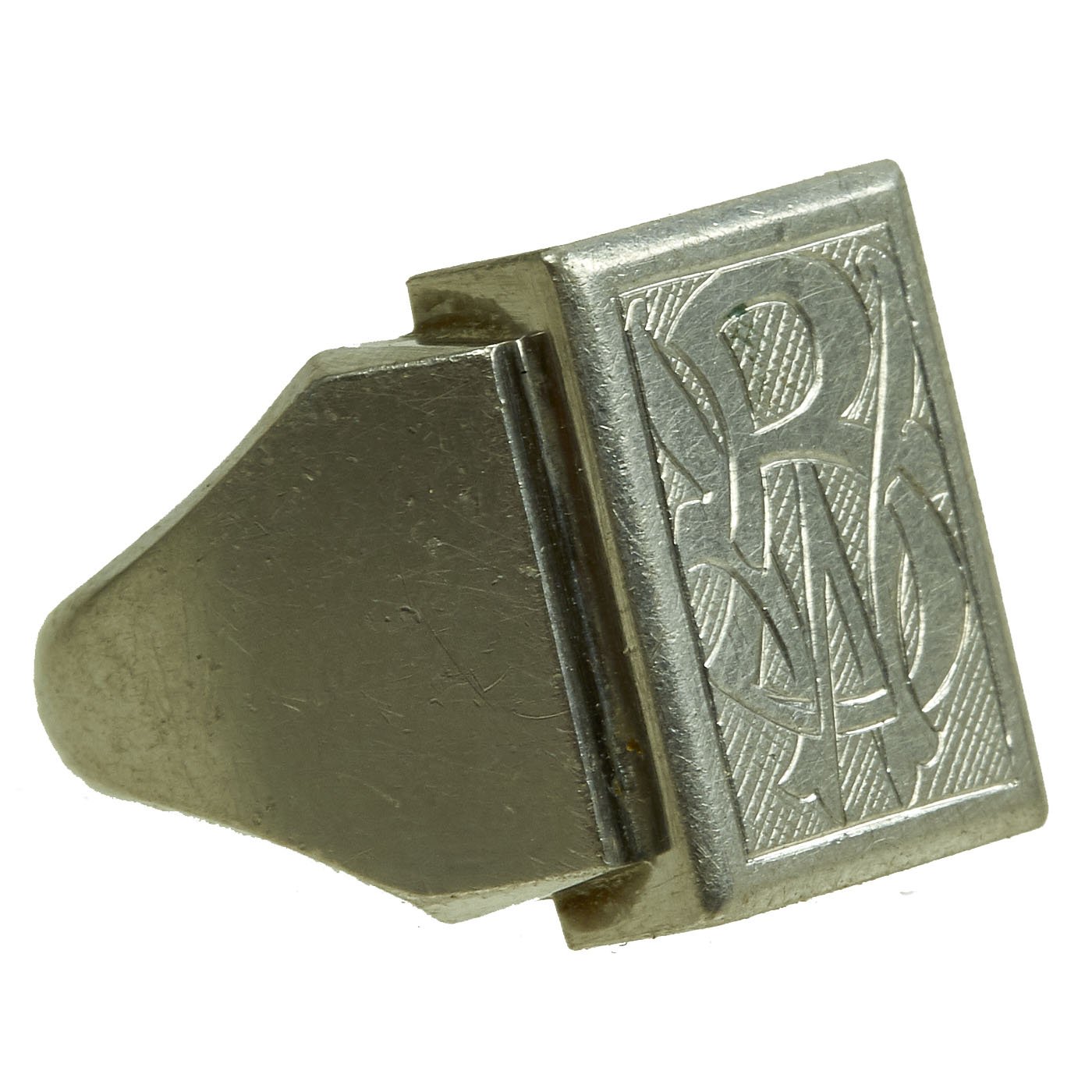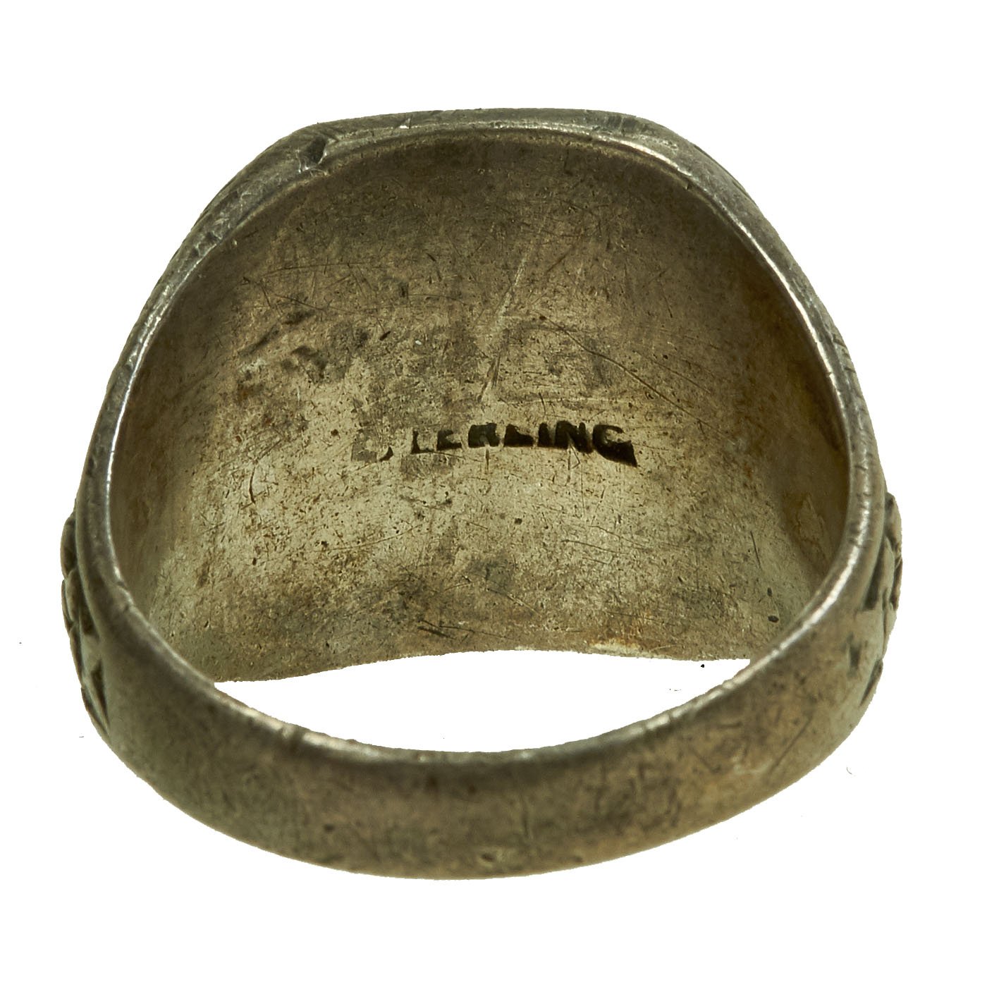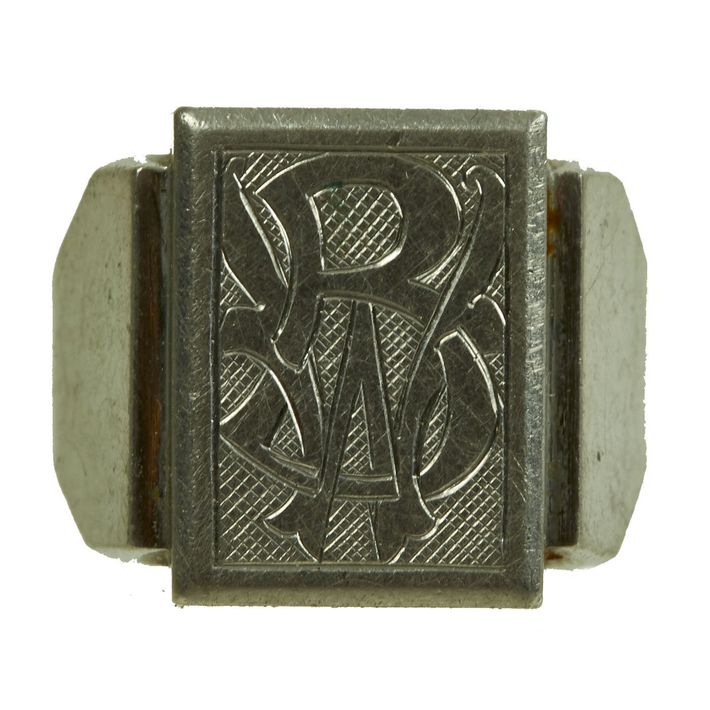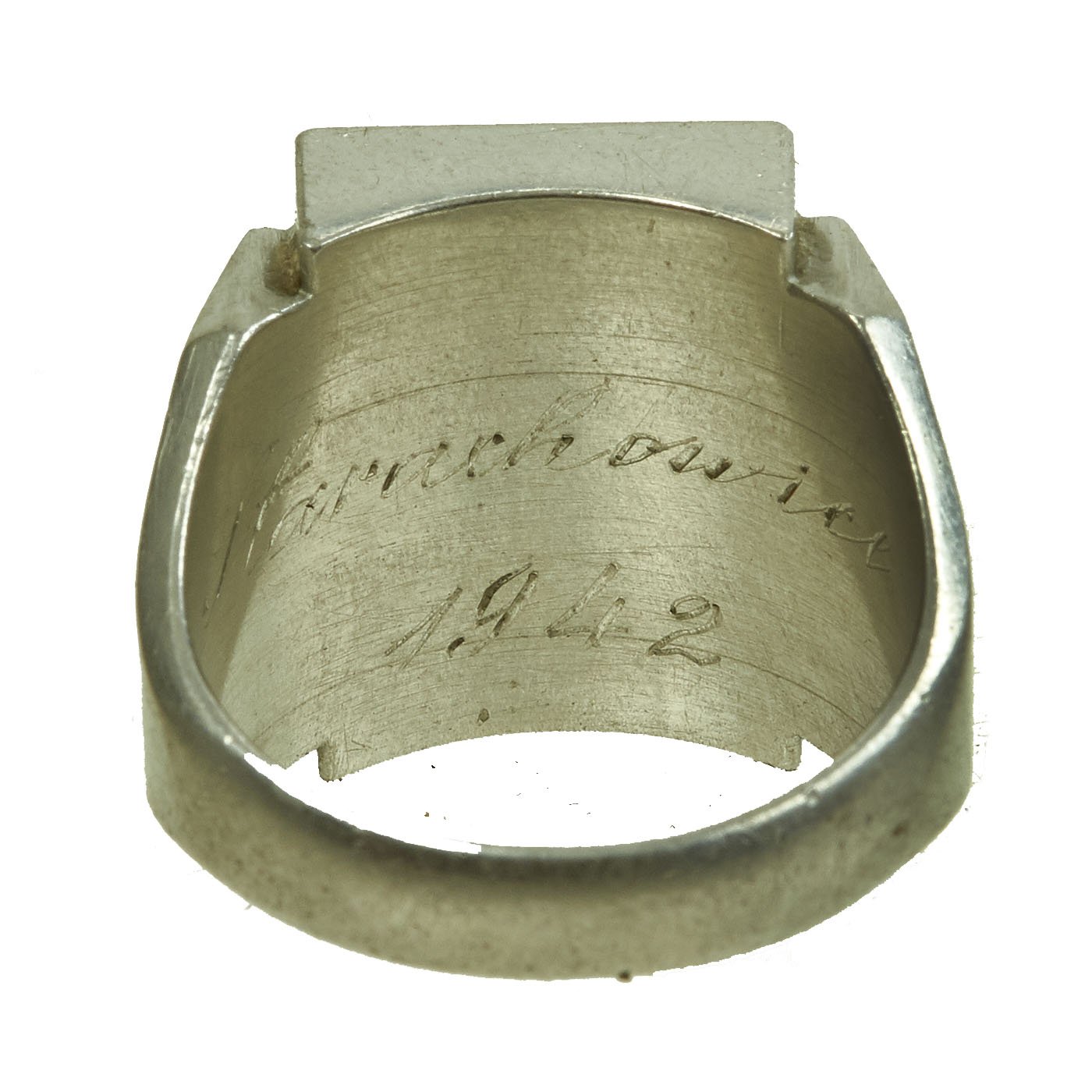 - White metal ring with BW initial to the front and a name in script inside and 1942 date. Approximately 20mm in diameter