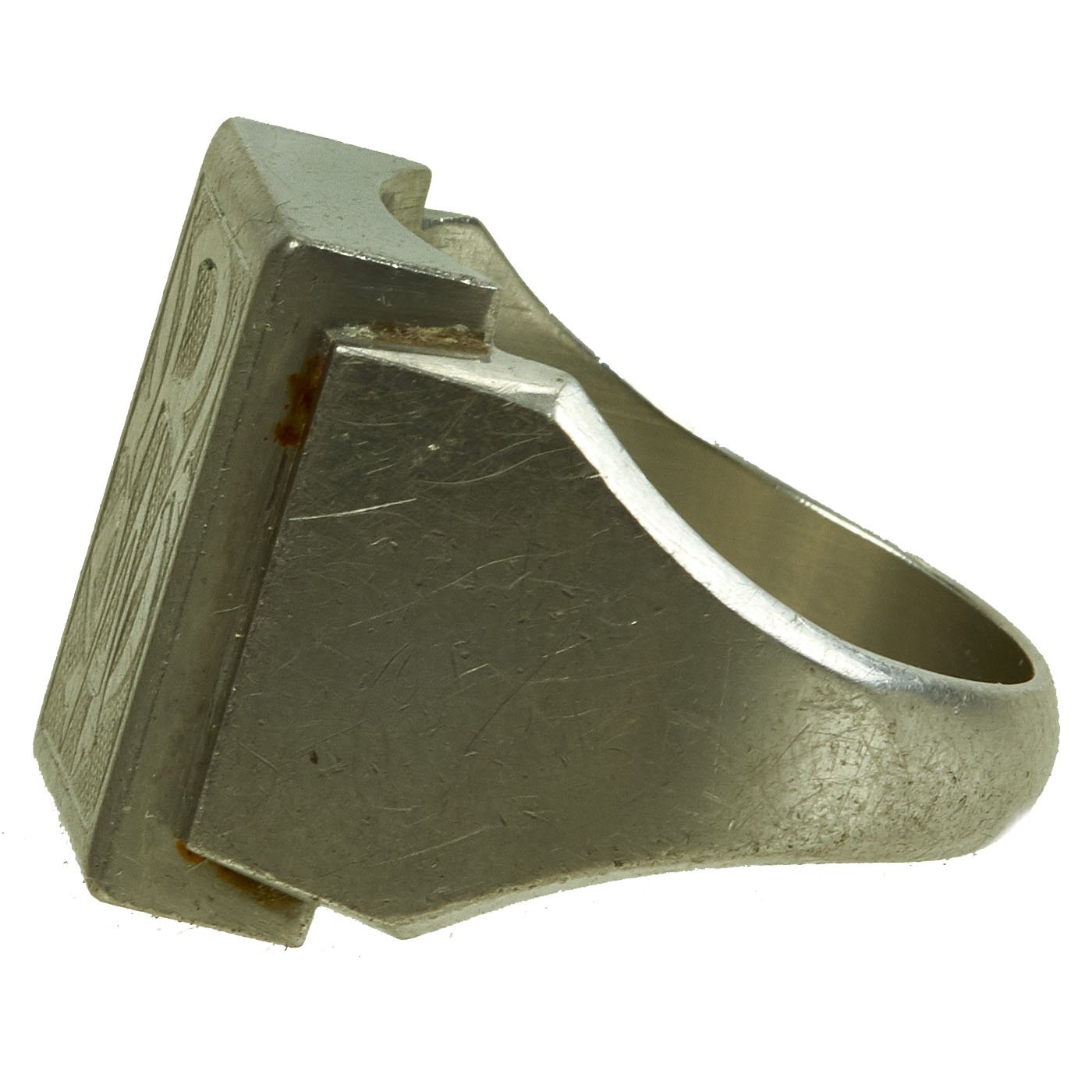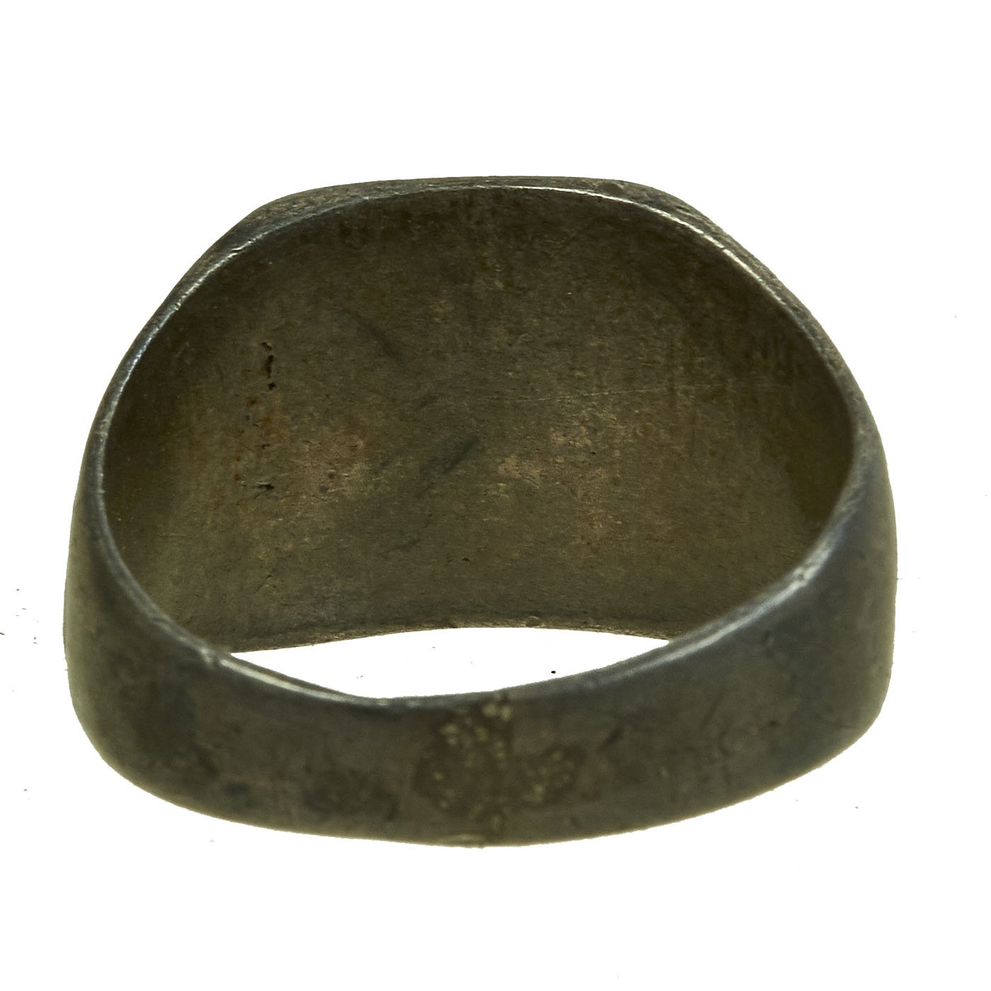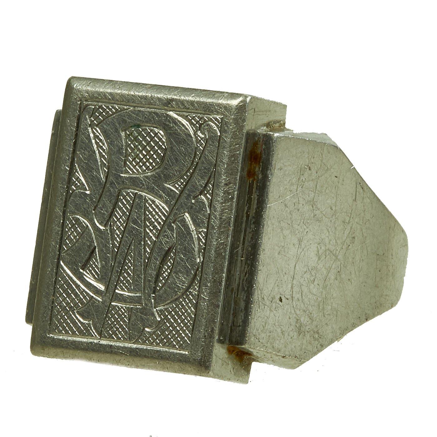 - White metal ring with BW initial to the front and a name in script inside and 1942 date. Approximately 20mm in diameter