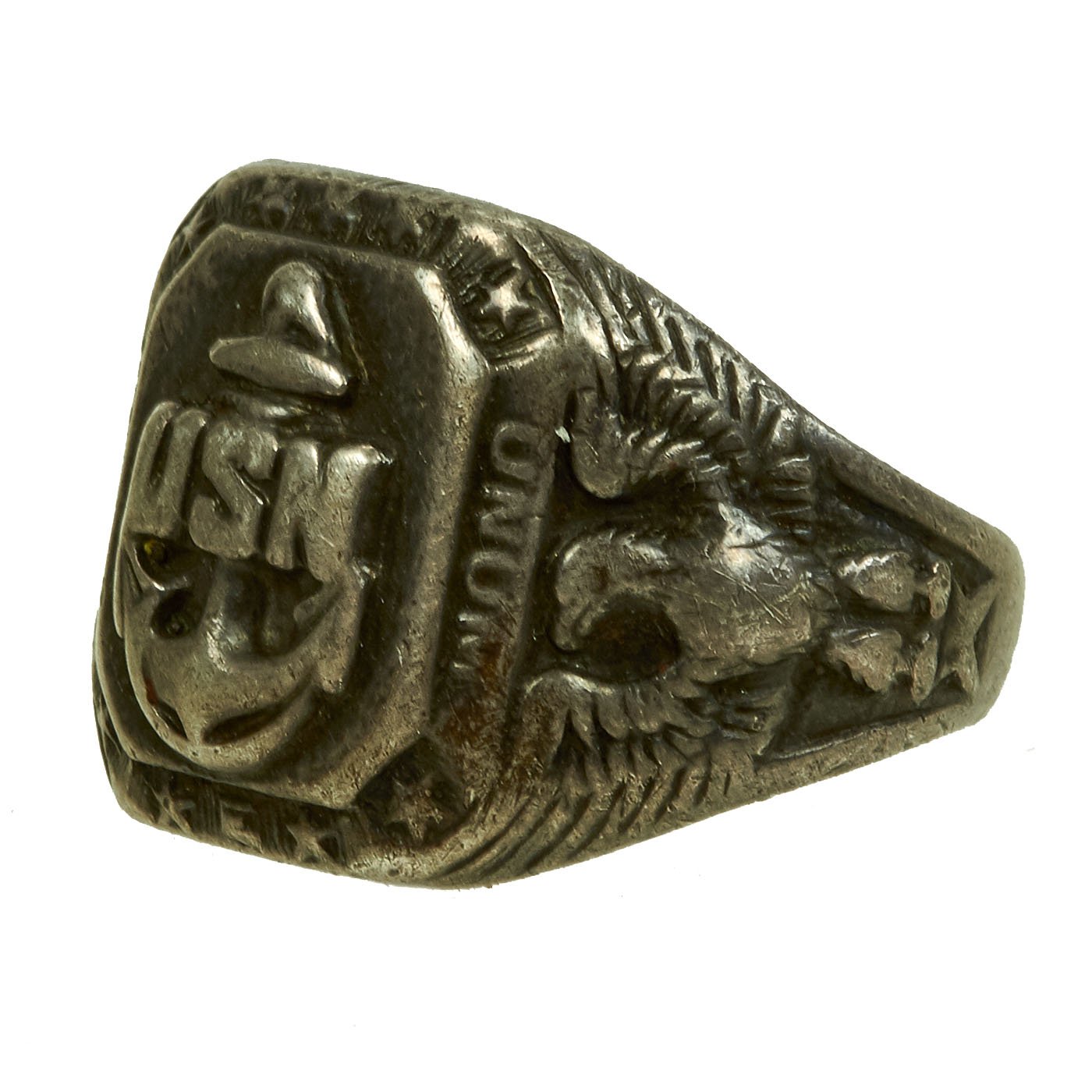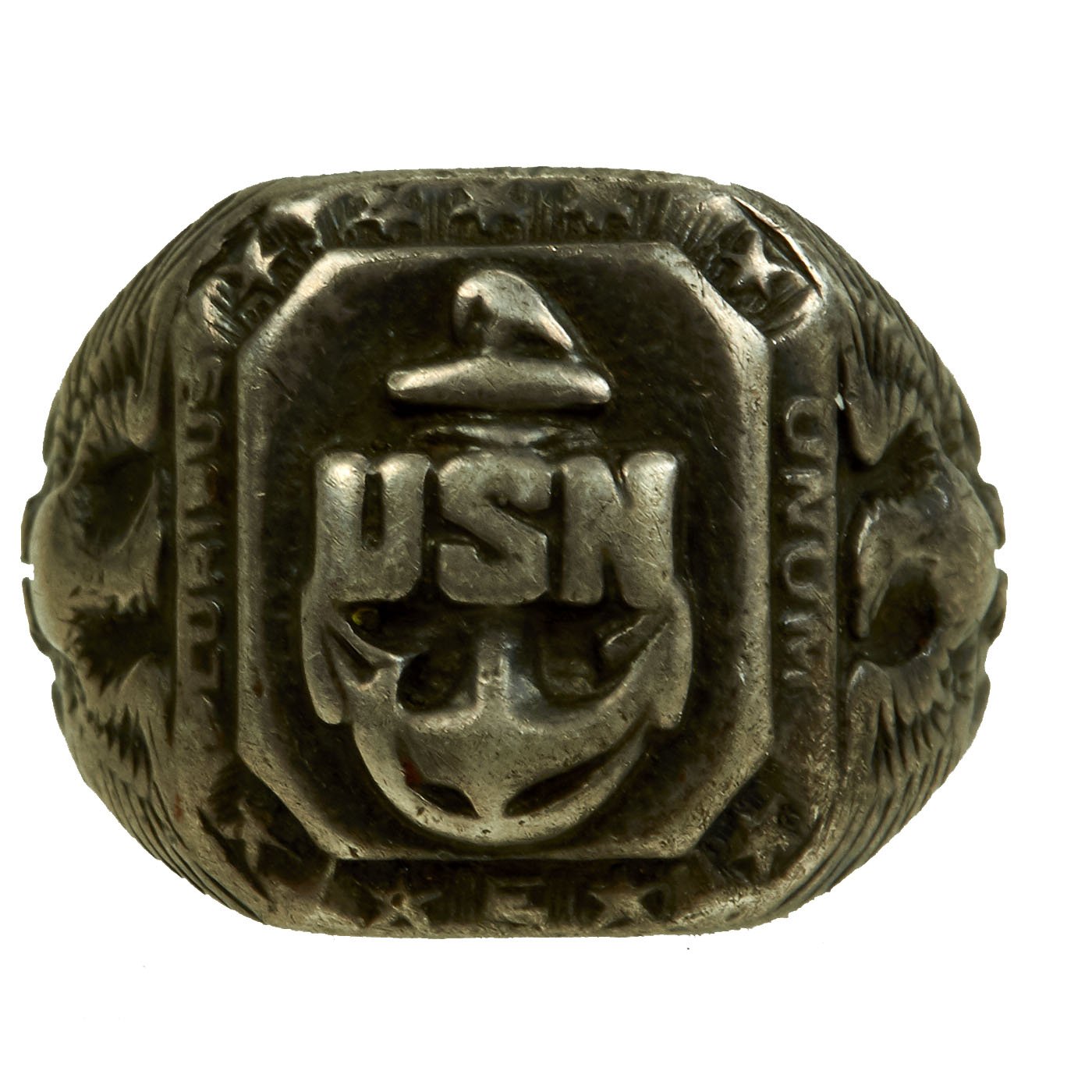 - Sterling silver USN with Anchor to center in high relief. Sides feature American eagles. Marked STERLING on the interior. Approximately 22mm in diameter.