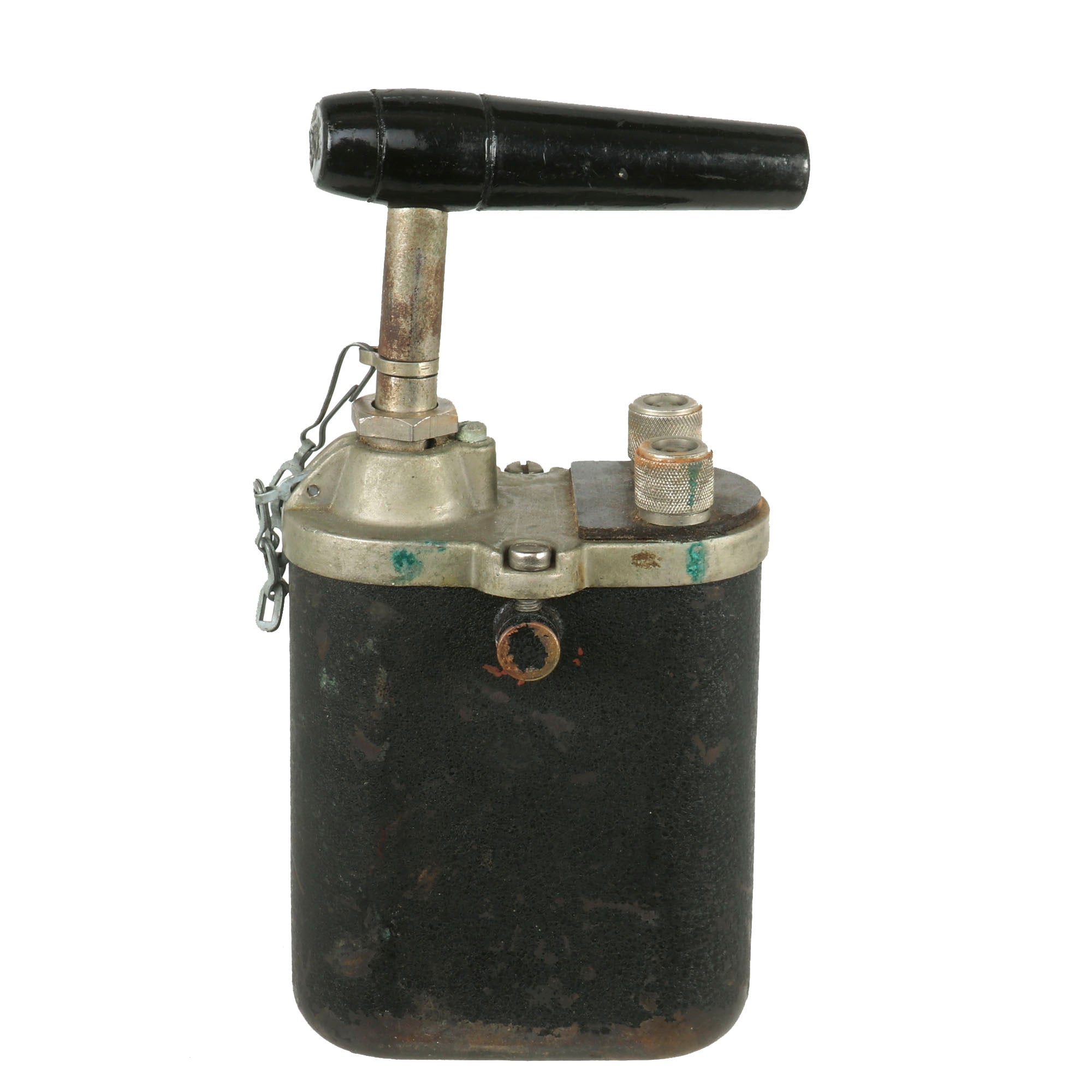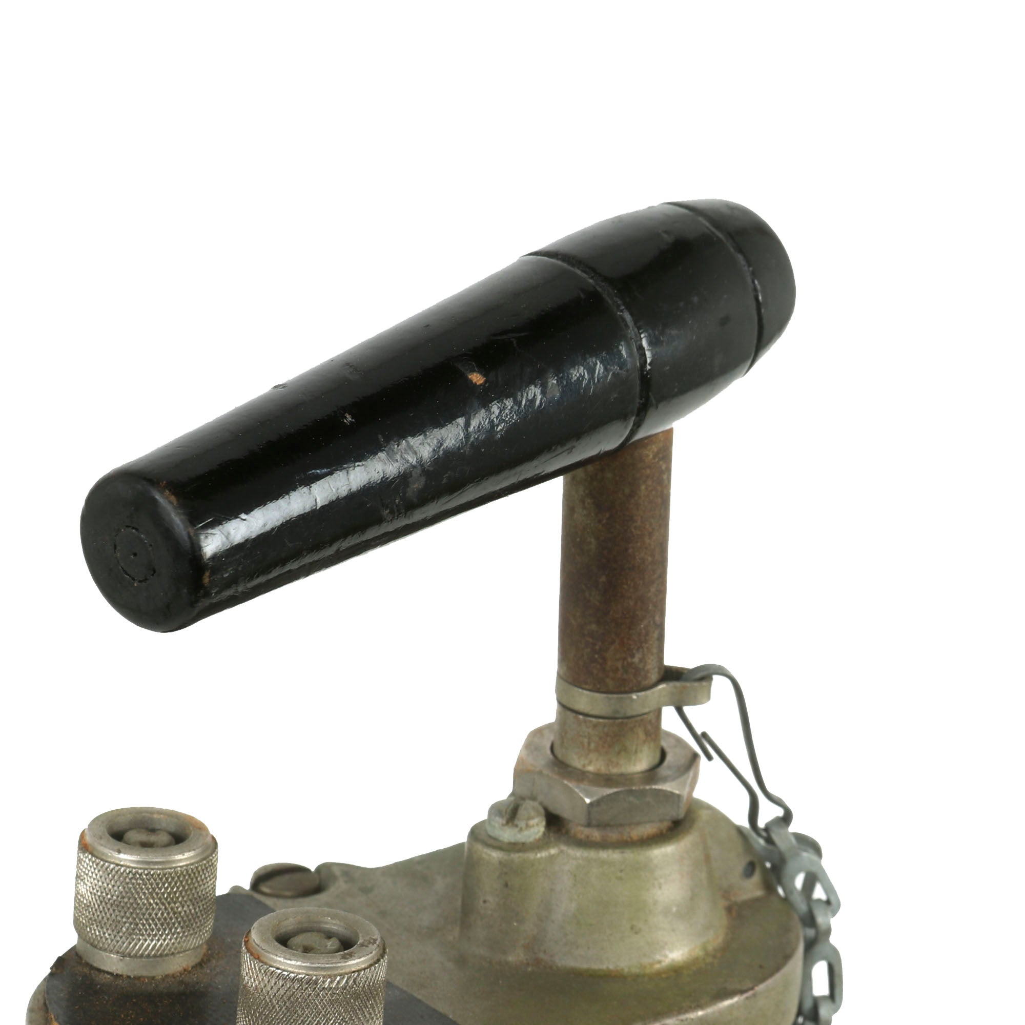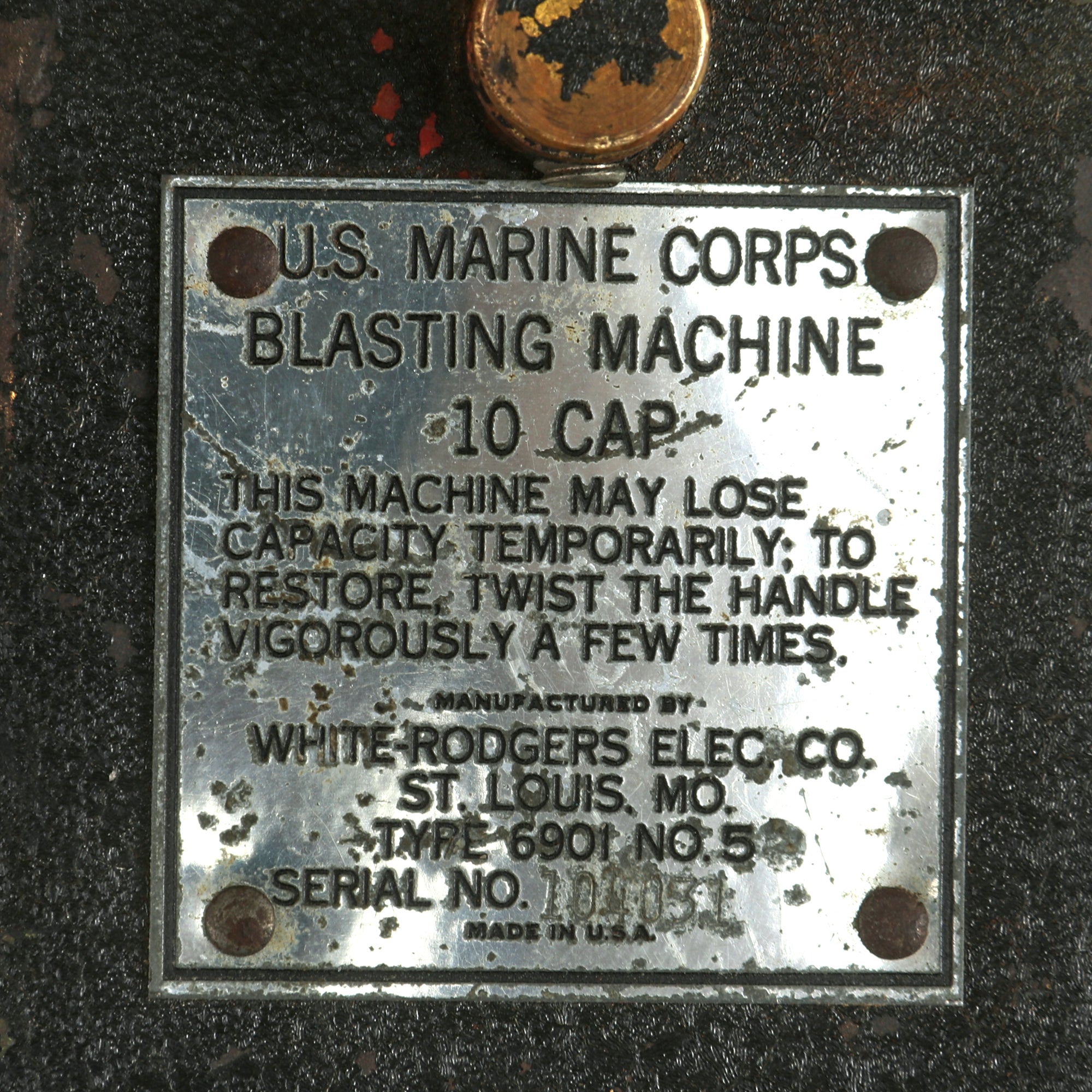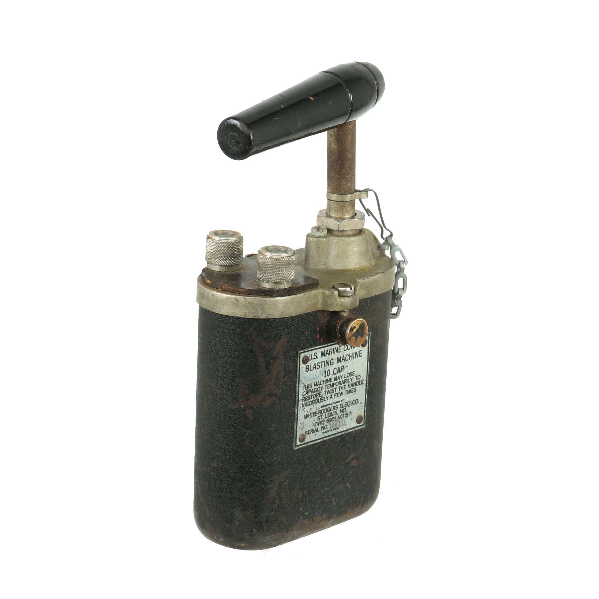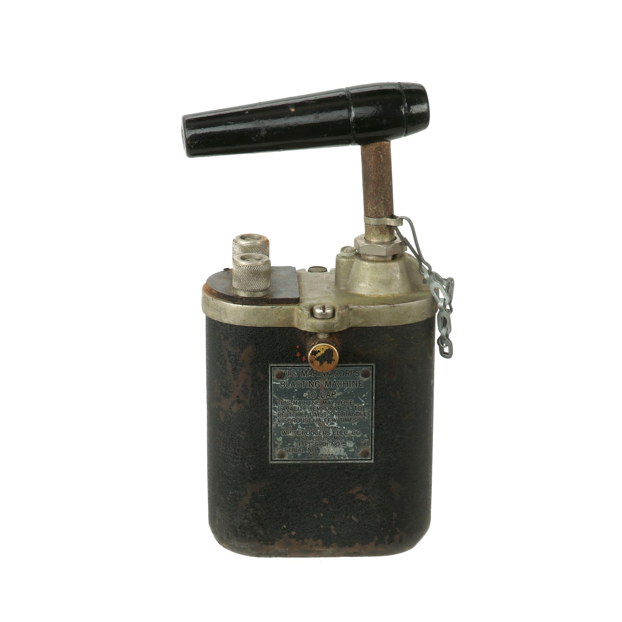 Original Item: Only One Available. This is an original WWII U.S.M.C. 10 Cap Blasting Machine, complete with the original handle and leather carry strap. These were used by Combat Engineers to clear obstacles during the Island Hopping Campaign in the Pacific Theater of War. The battalion participated in combat during the Battle of Guadalcanal, Eastern New Guinea, Battle of New Britain, Battle of Peleliu and the Battle of Okinawa. Following the war they were sent to Tientsin, China in September 1945 as peacekeepers and returned to the United States during June 1947 to Camp Pendleton, California. This particular example has a brass lower housing, with a lid that appears to be zinc or aluminum, with a data plate on the side with information and instructions. The Data plate reads: