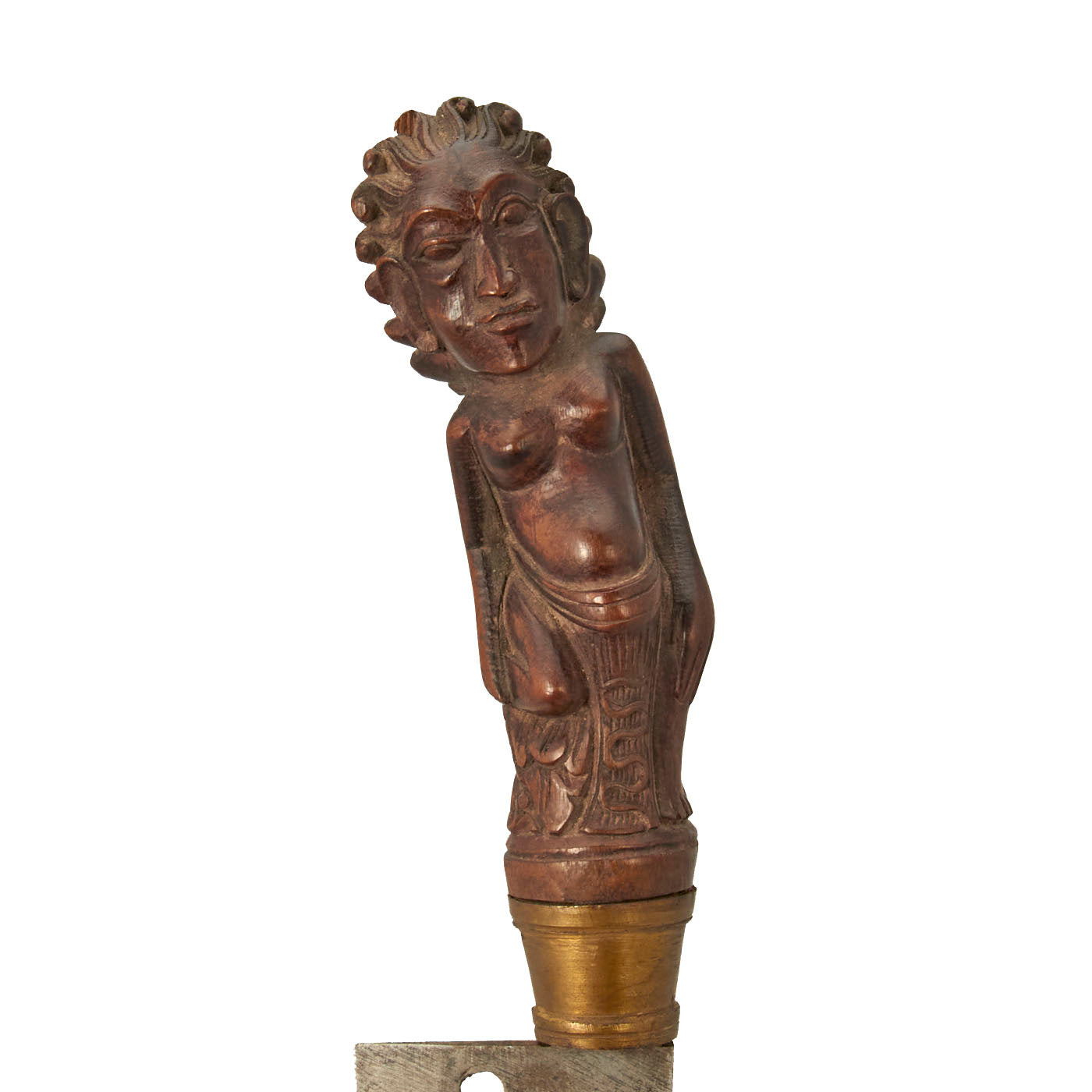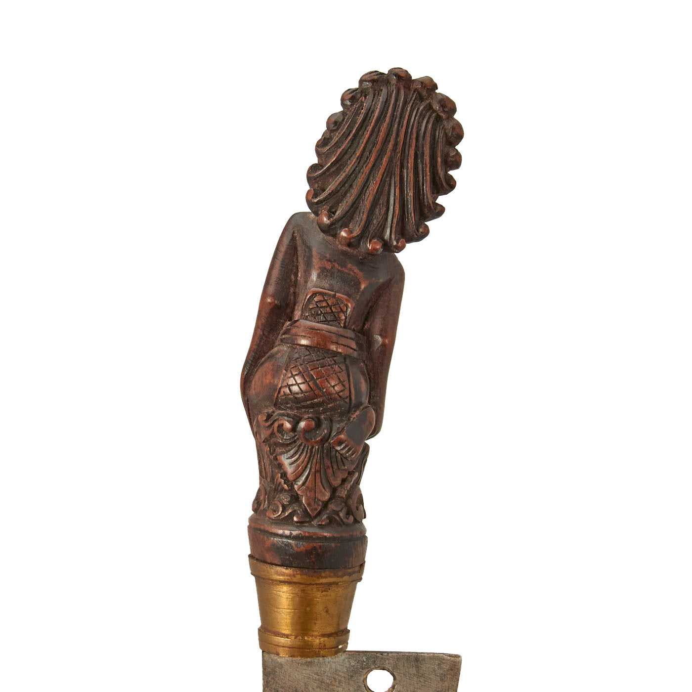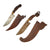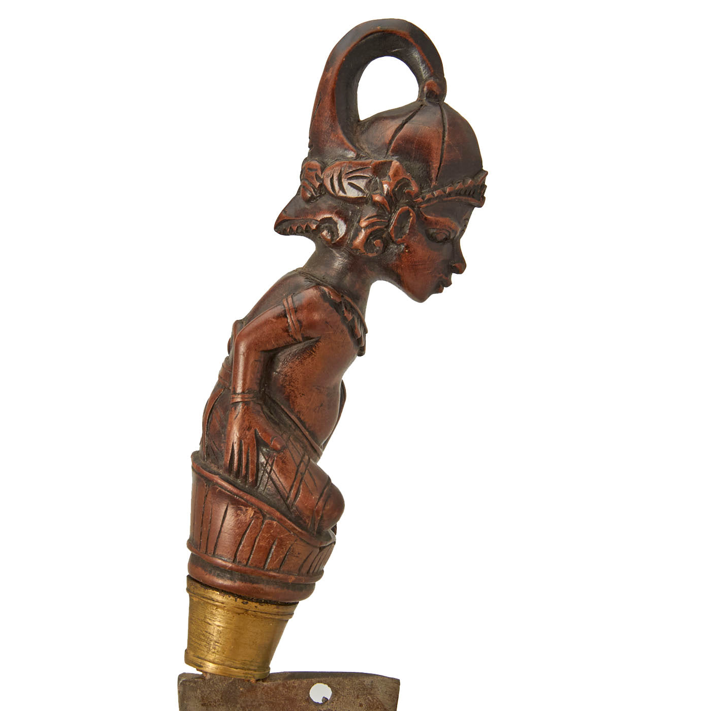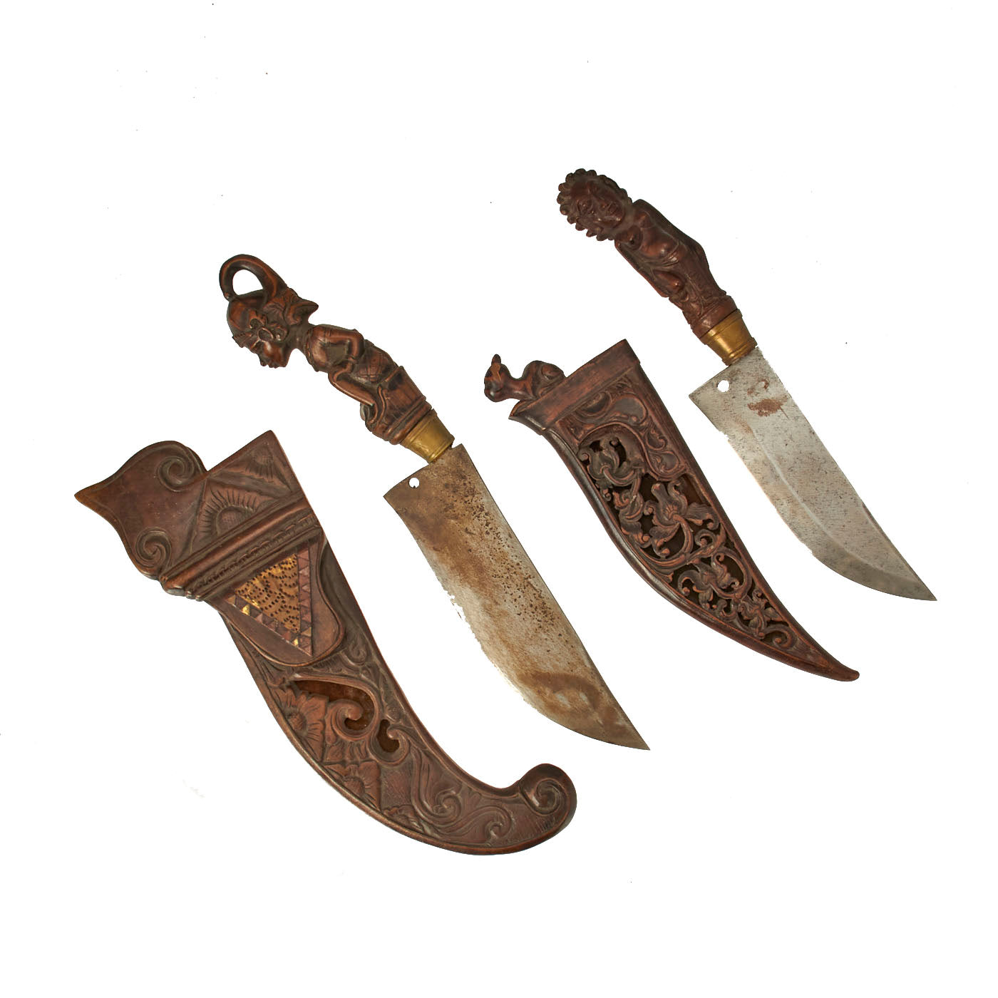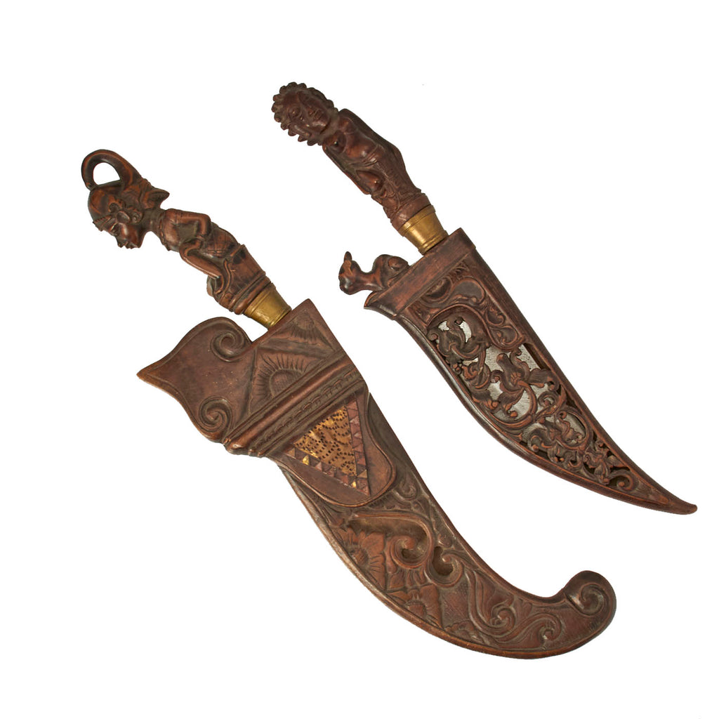 The knife set is from Indonesia, especially the Batak people. These are usually a short sort, with an overall length of 11 1/2 inches and a 6 1/2 inch blade. The larger knife measures an overall length of 13 ½ inches with a 7 ½ inch blade. These were the standard self-defense sidearm of Batak men. These examples have a typically shaped blade and the hilts are wood fitted with brass. The hilts themselves are a woman with the other being what appears to be a man with an animal face on the back of his head.