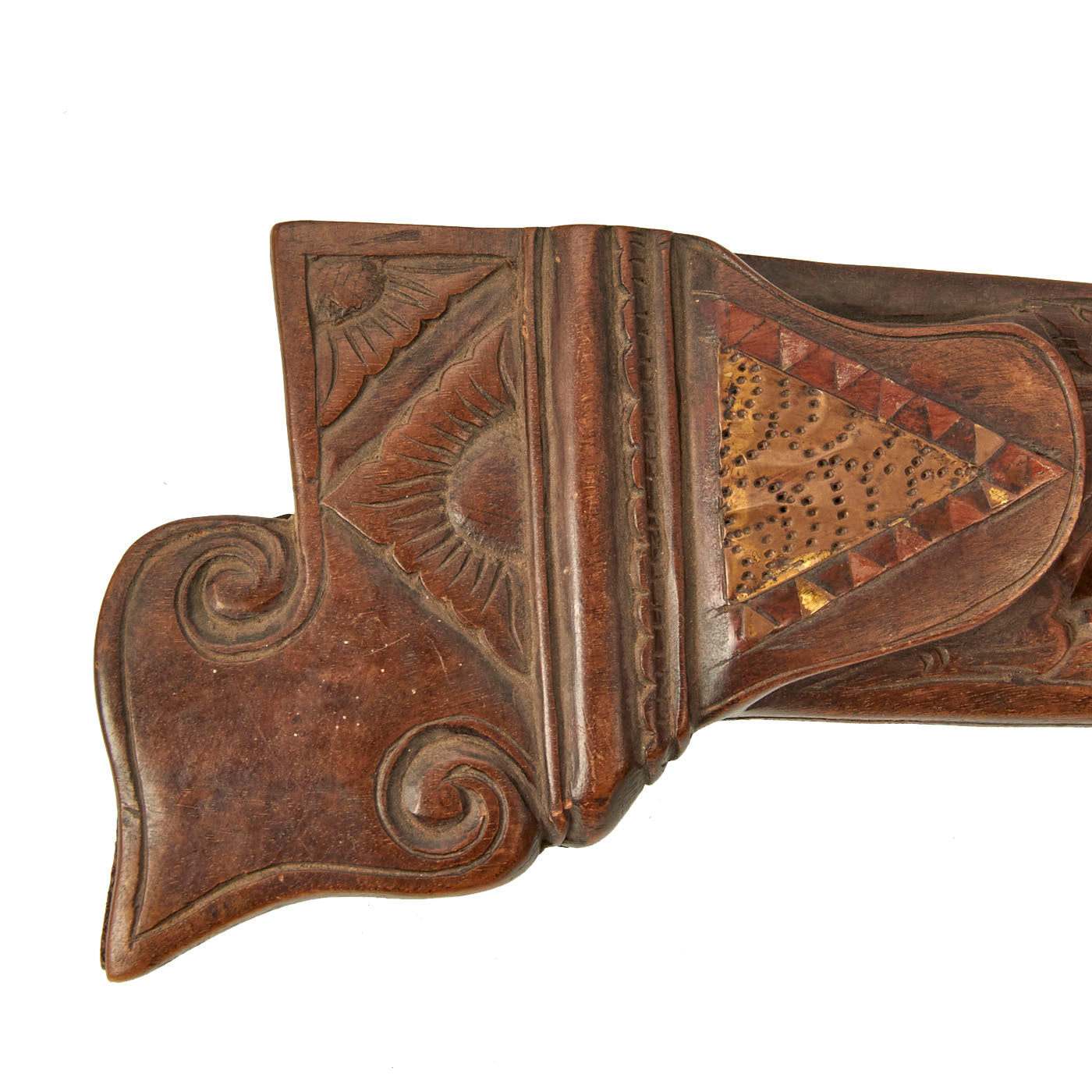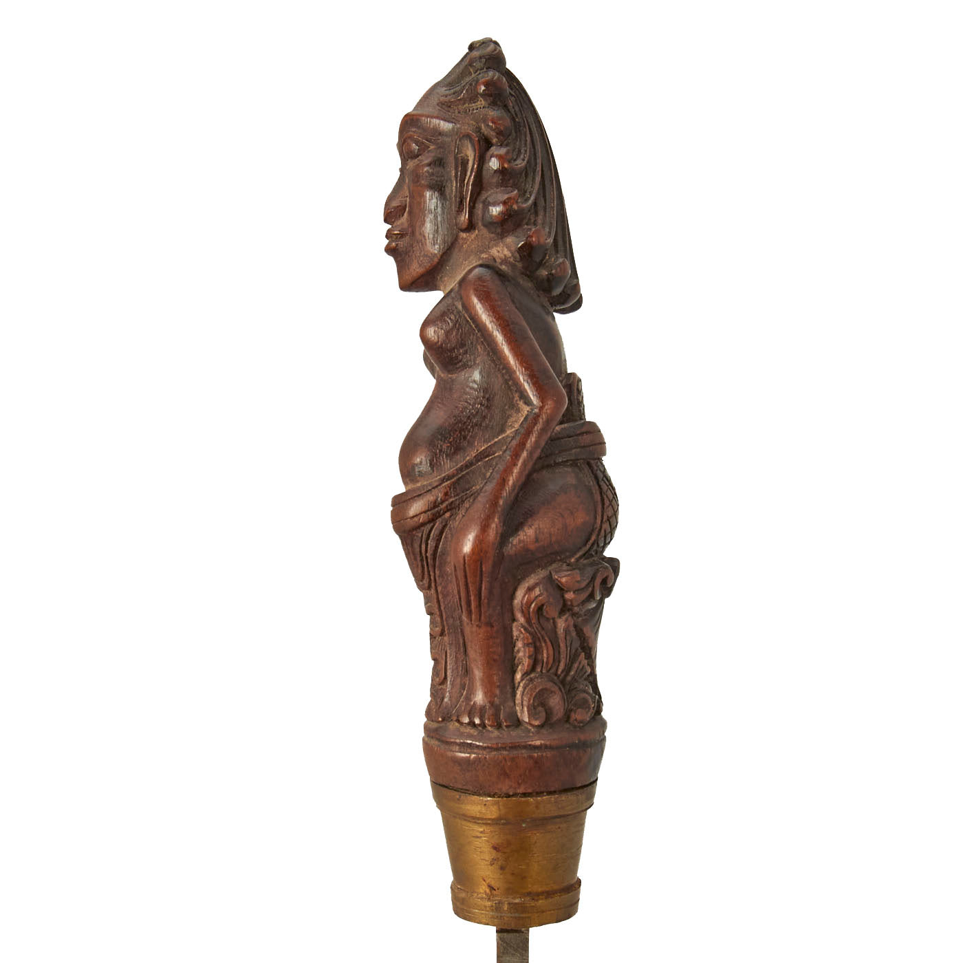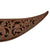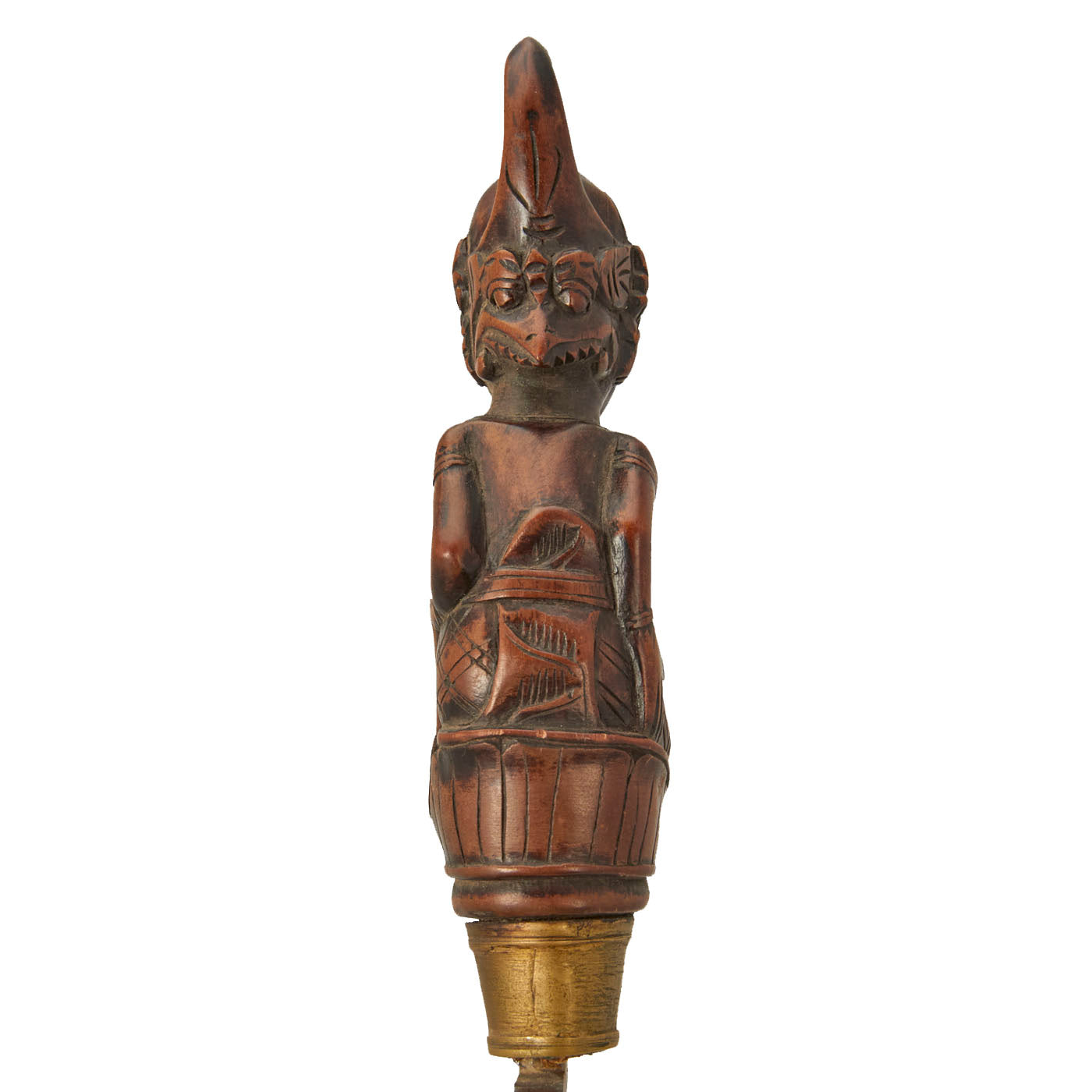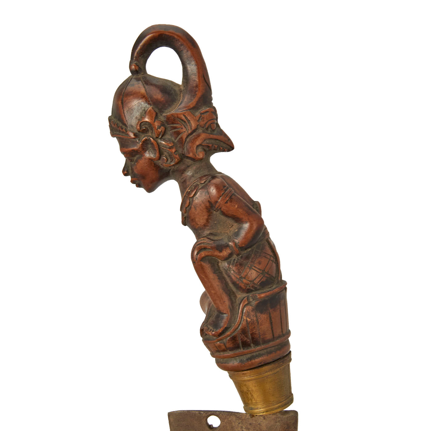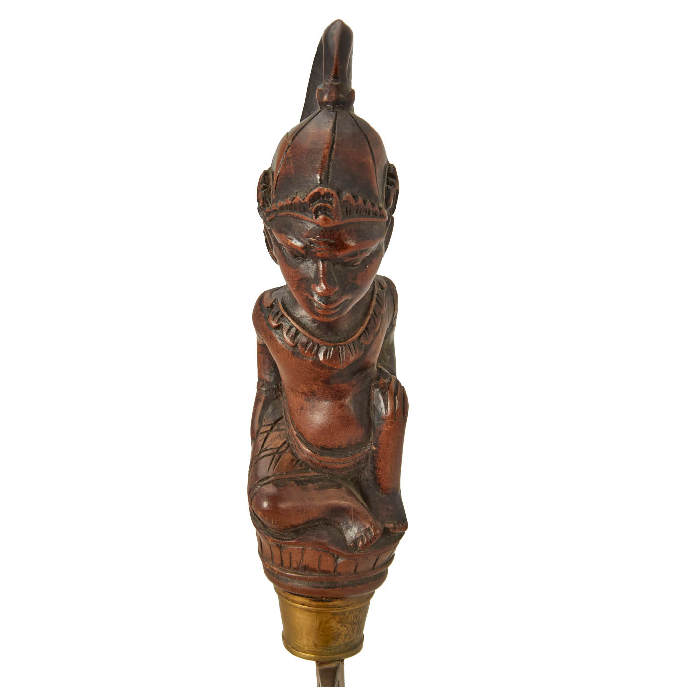The knife set is from Indonesia, especially the Batak people. These are usually a short sort, with an overall length of 11 1/2 inches and a 6 1/2 inch blade. The larger knife measures an overall length of 13 ½ inches with a 7 ½ inch blade. These were the standard self-defense sidearm of Batak men. These examples have a typically shaped blade and the hilts are wood fitted with brass. The hilts themselves are a woman with the other being what appears to be a man with an animal face on the back of his head.