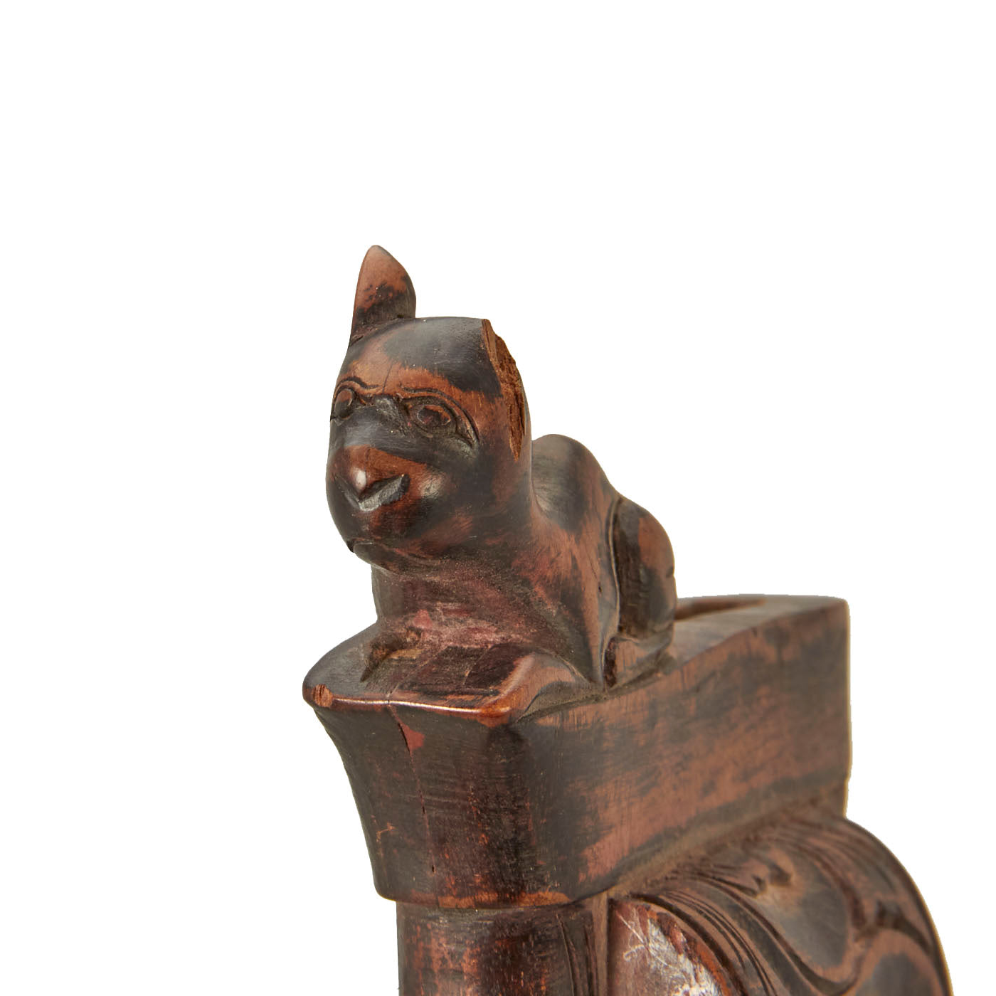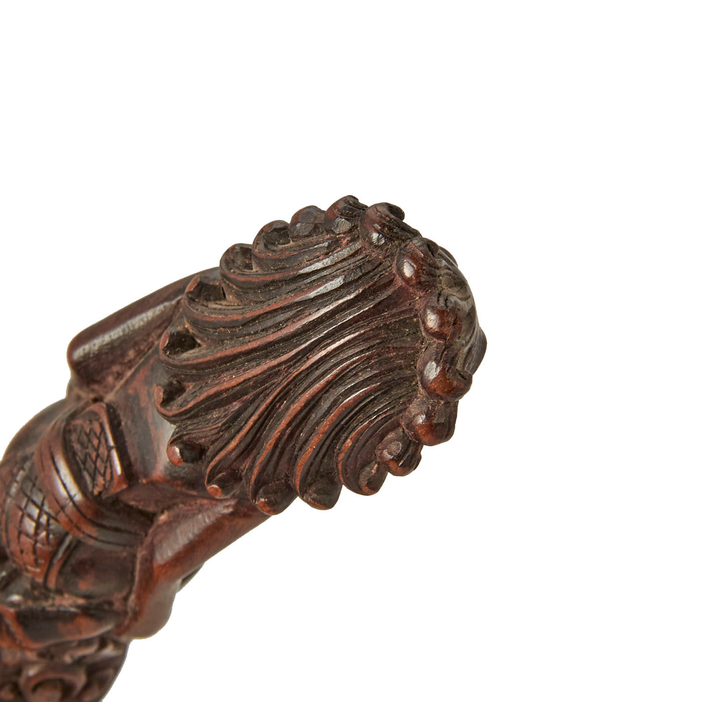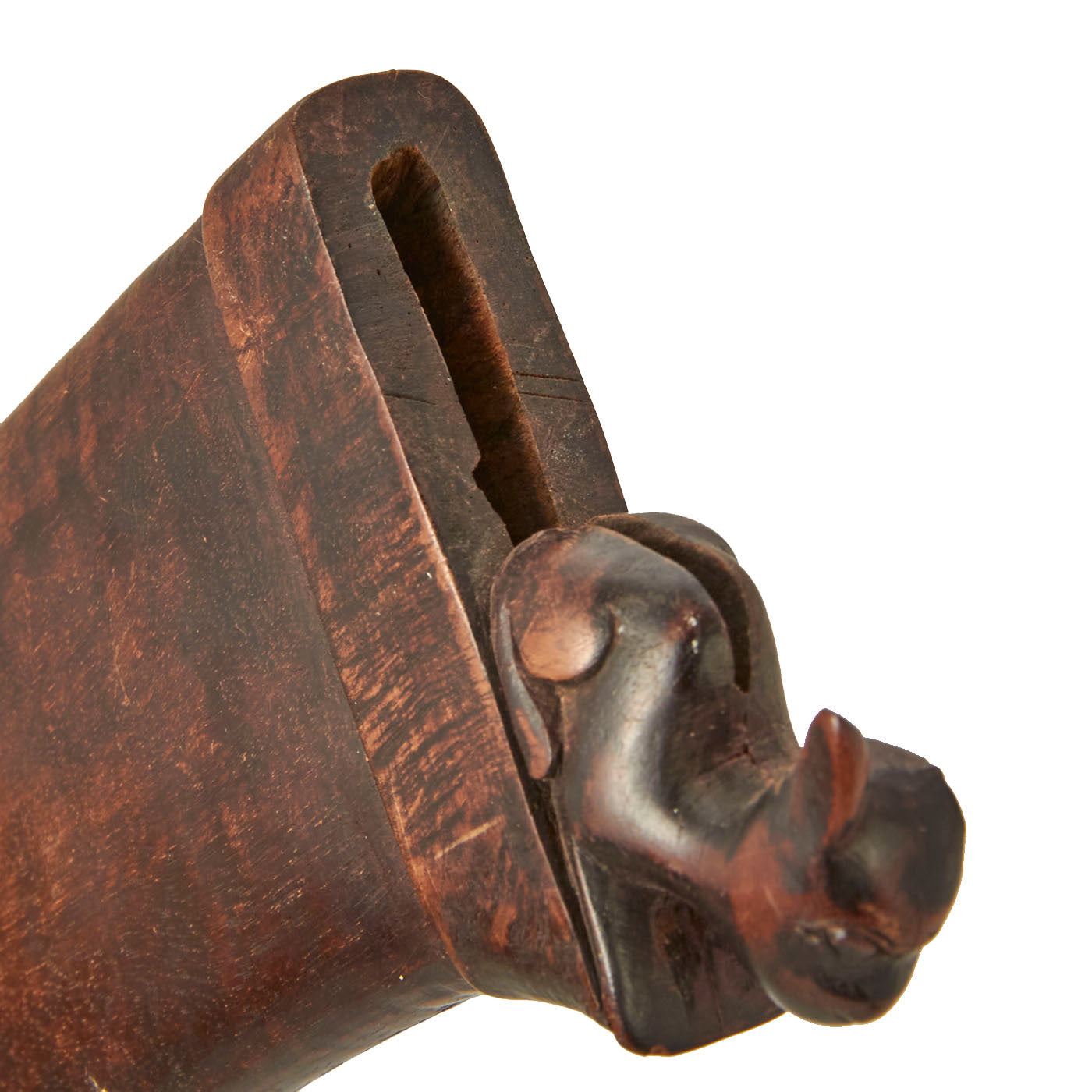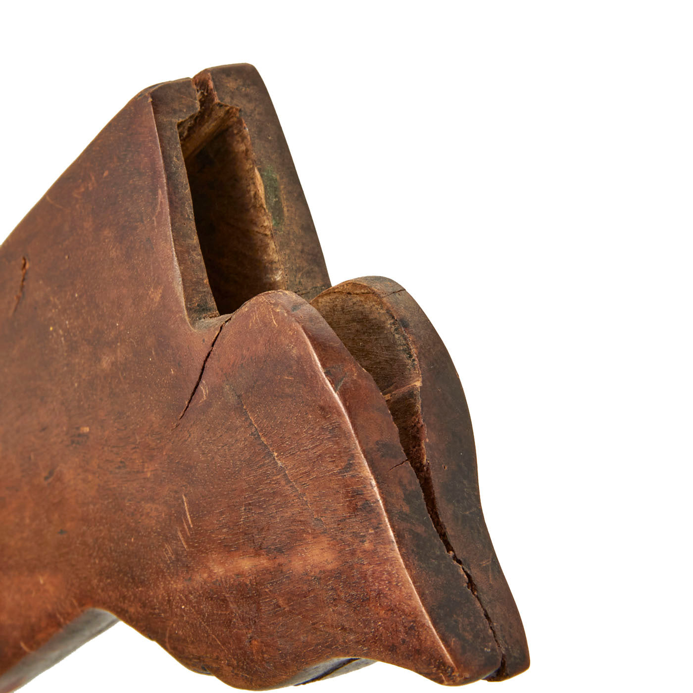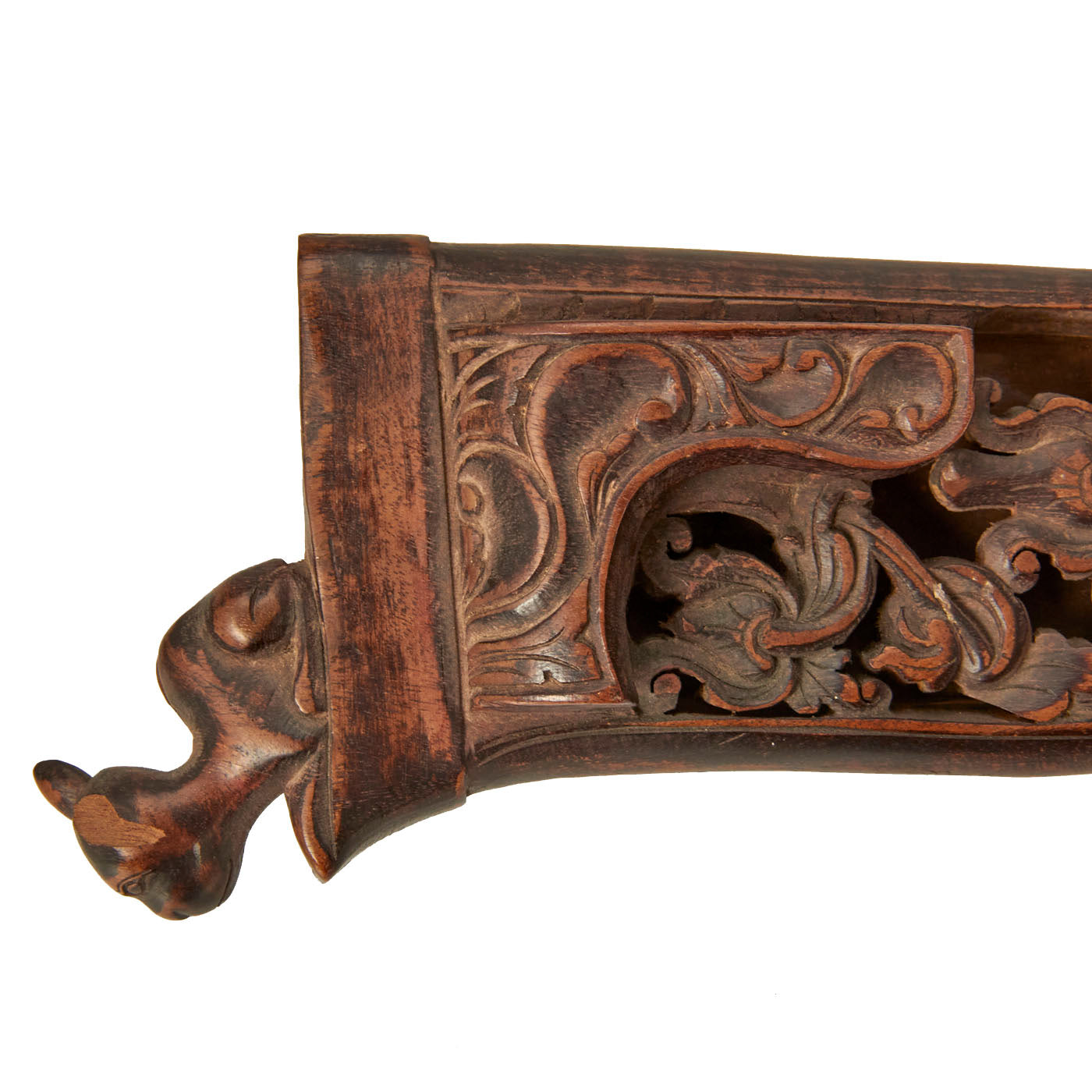 The knife set is from Indonesia, especially the Batak people. These are usually a short sort, with an overall length of 11 1/2 inches and a 6 1/2 inch blade. The larger knife measures an overall length of 13 ½ inches with a 7 ½ inch blade. These were the standard self-defense sidearm of Batak men. These examples have a typically shaped blade and the hilts are wood fitted with brass. The hilts themselves are a woman with the other being what appears to be a man with an animal face on the back of his head.