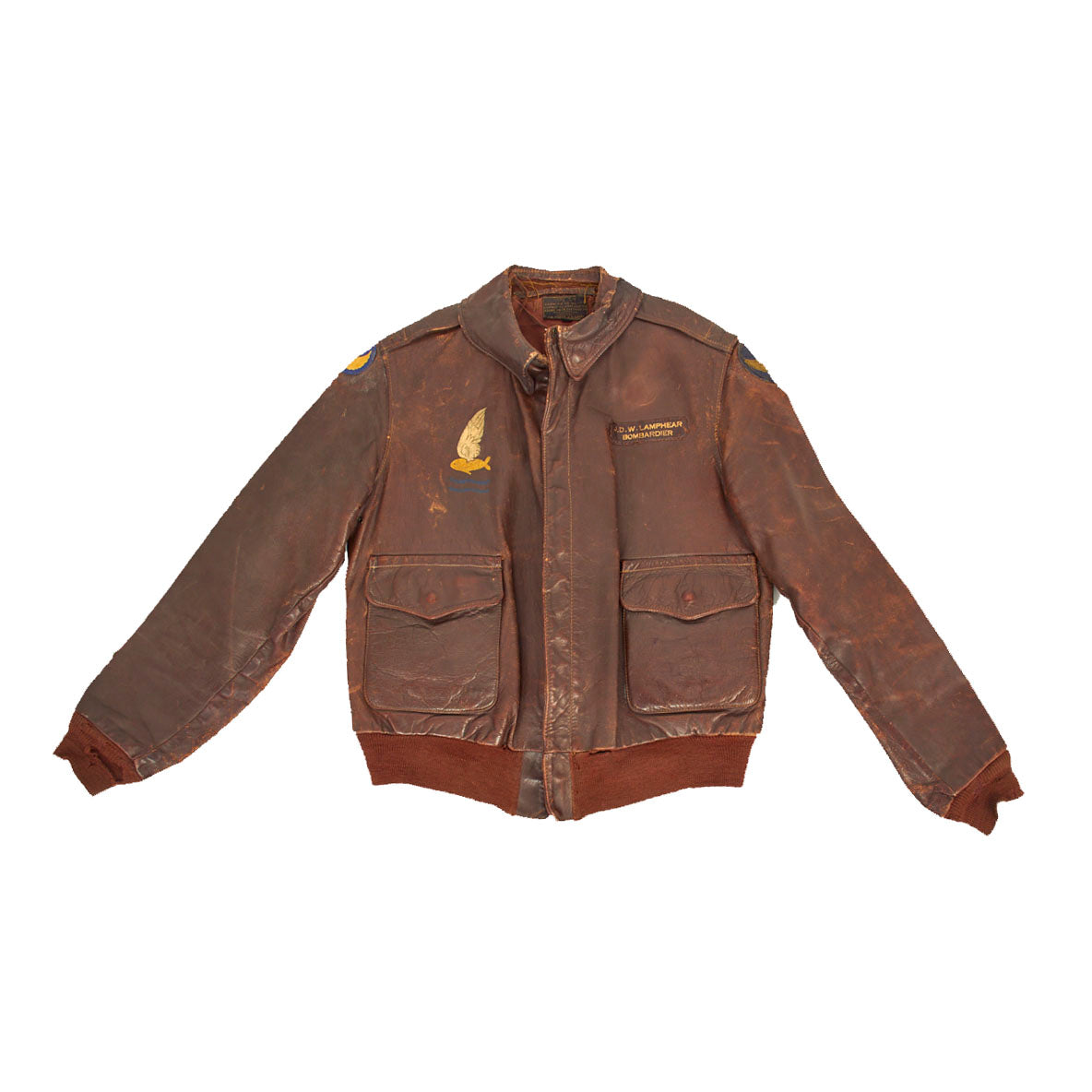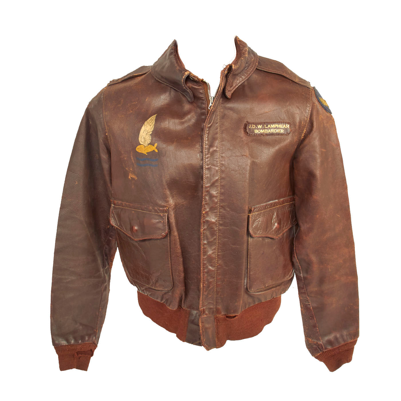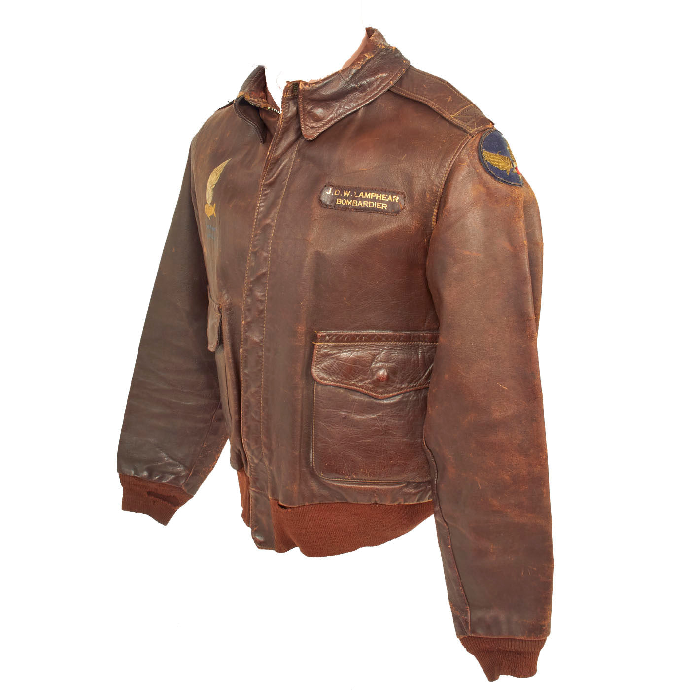 Original Item: Only One Available. This is a lovely example of a handpainted A-2 flight jacket for the B-24 Liberator “Parson’s Chariot”. This jacket belonged to Bombardier 2nd Lieutenant John D. W. Lamphear, of the 466th Bomb Group, 784th Bomb Squadron who fell under command of the 8th Army Air Force. We were fortunate enough to find out that he received the Purple Heart for wounds received on October 15, 1944.