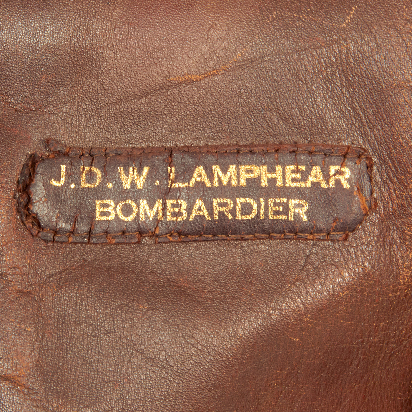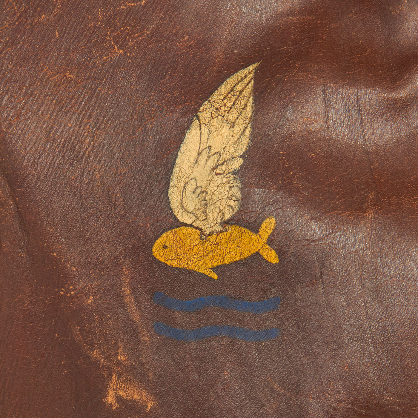 The front left has a lovely leather name tape that reads as J.D.W. LAMPHEAR. The right side front has an incredible painted Goldfish Club insignia which is a white-winged goldfish flying over two symbolic blue waves.
