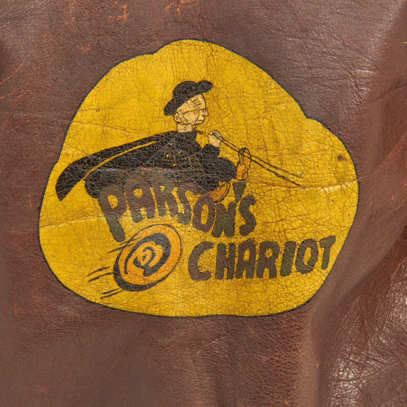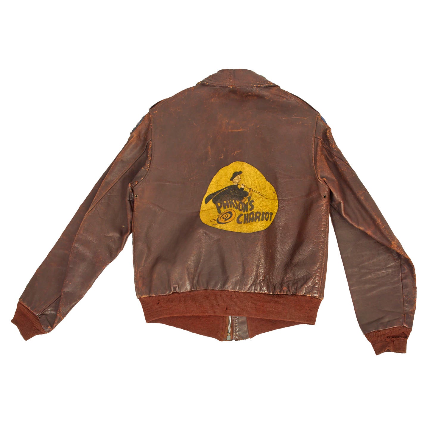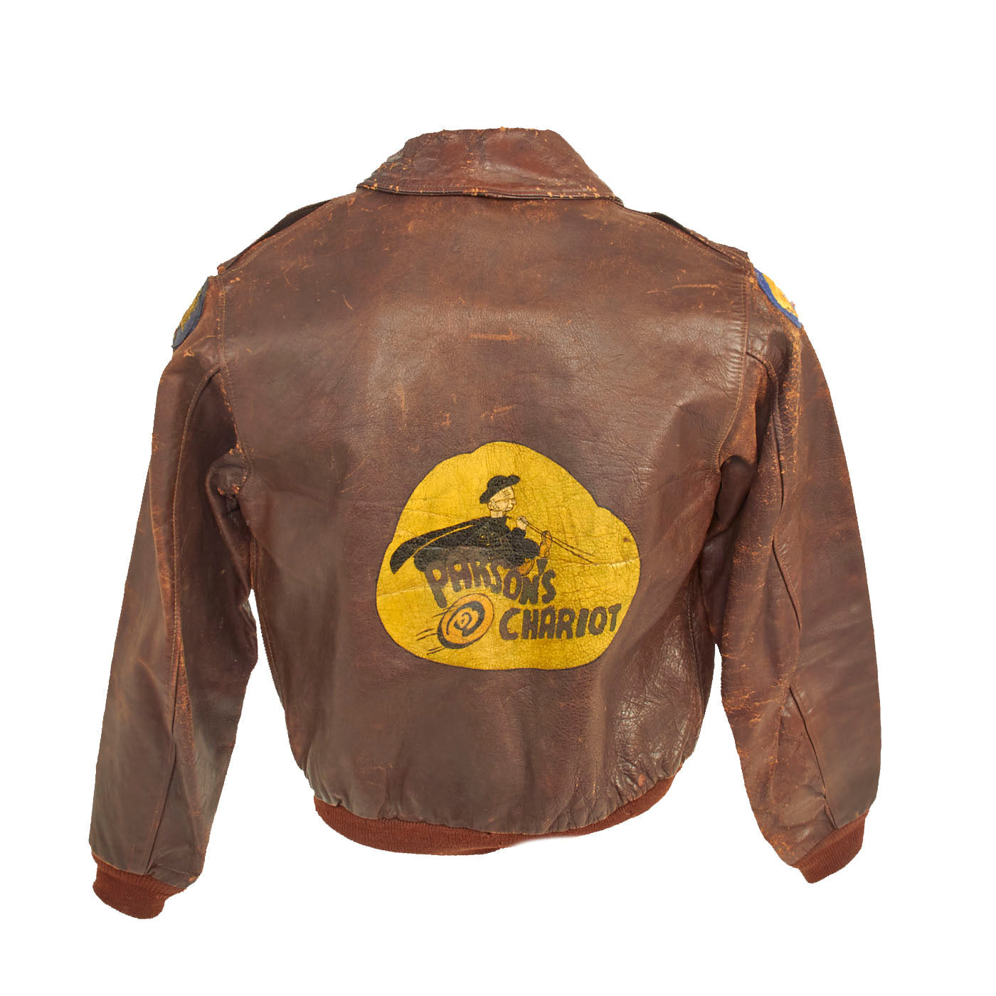 The most notable feature is the painted Parsons Chariot insignia on the back of the jacket. It shows an image of what appears to be a traditional “Quaker” riding on a chariot holding the reins of a horse. Parsons Chariot was a B-24 Liberator Serial # 42-110162 which can be found on the American Air Museum in Britain website archive at this link: www.americanairmuseum.com/archive/aircraft/42-110162
