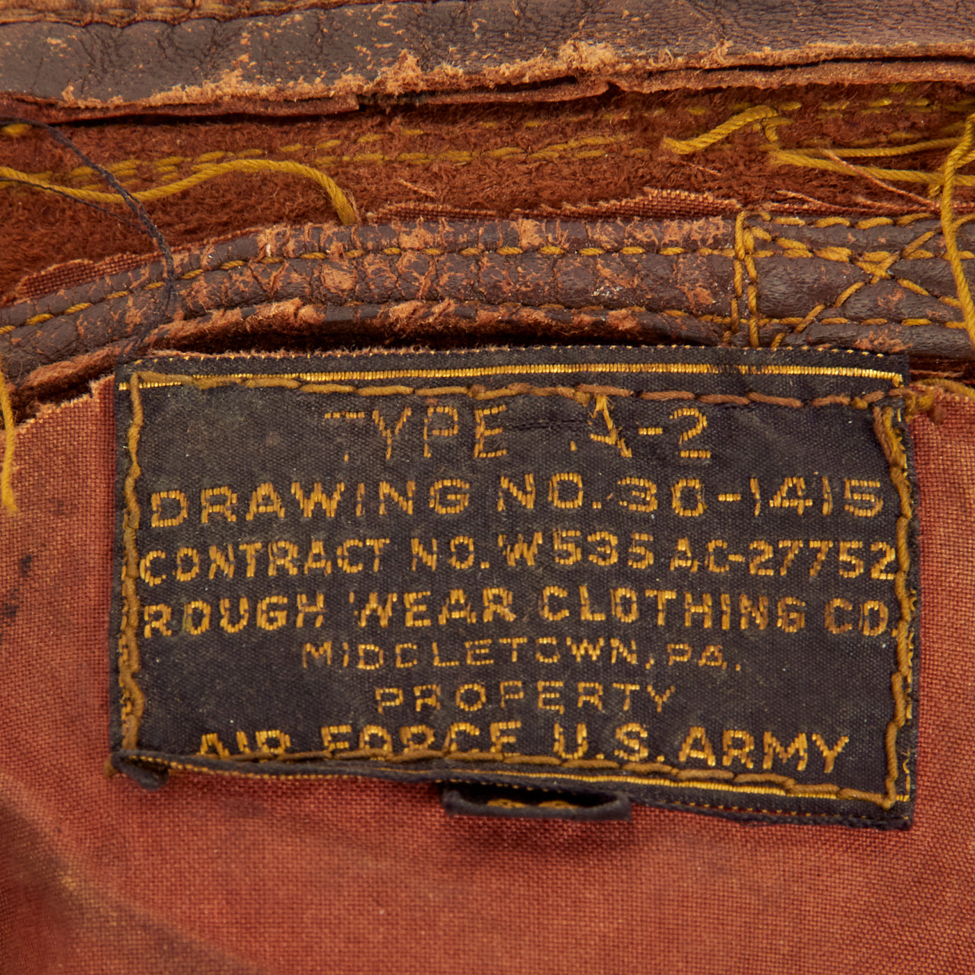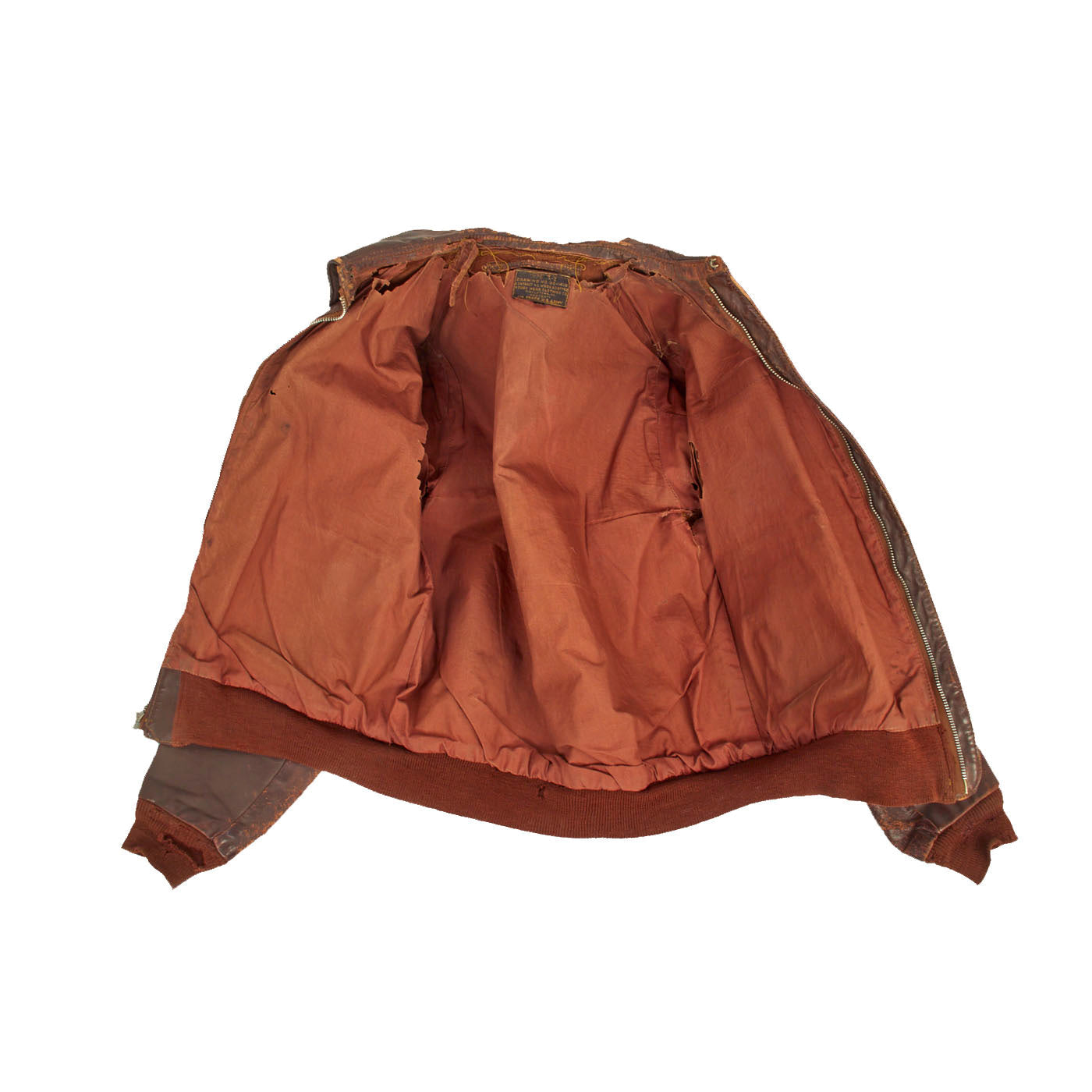 Jacket maintains it’s original cuffs and waistband that remain in very solid condition but do show a few snags and small holes. The interior of the jacket maintains its original cotton liner that remains mostly attached and in good condition with minor tearing and separation towards the top. Shows signs of age and wear with a few minor spots of soiling. Leather hanging tab also remains firmly attached to the interior collar by its original thread and remains very solid, showing only minor age and wear.