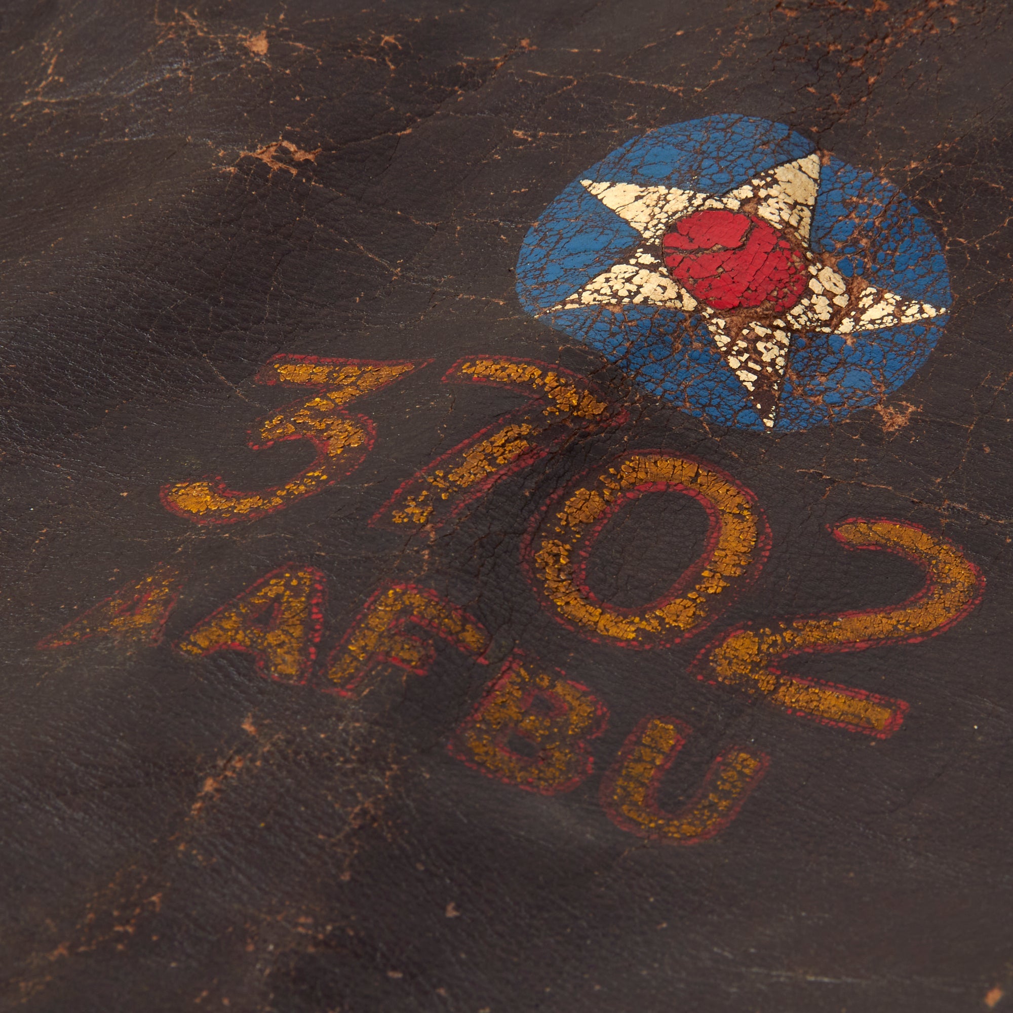 The A-2 jacket, which is in fair condition with fantastic hand painted insignia. The back side of the jacket has the base designation painted along with the US AAF insignia. It reads as 3702 / AAFBU.
