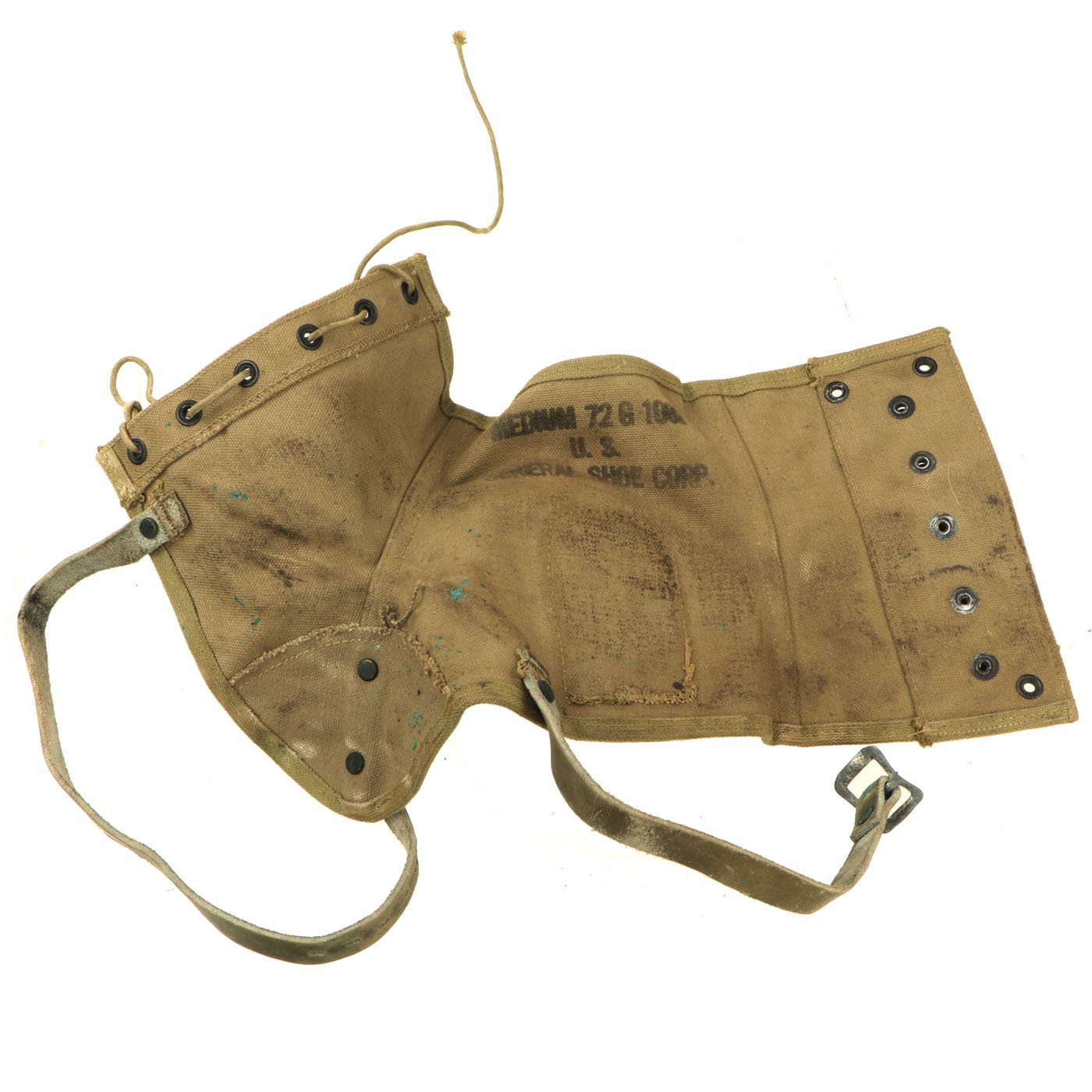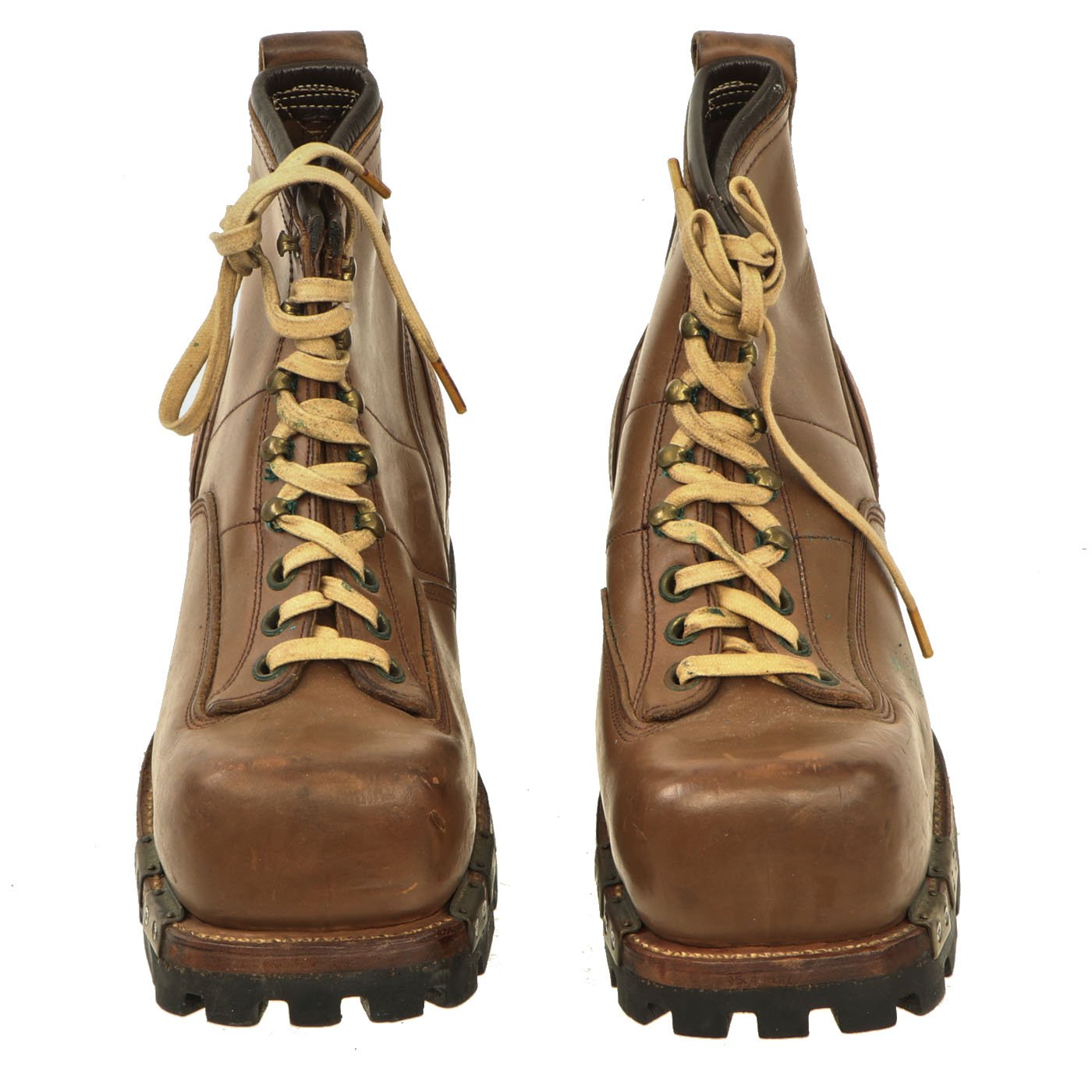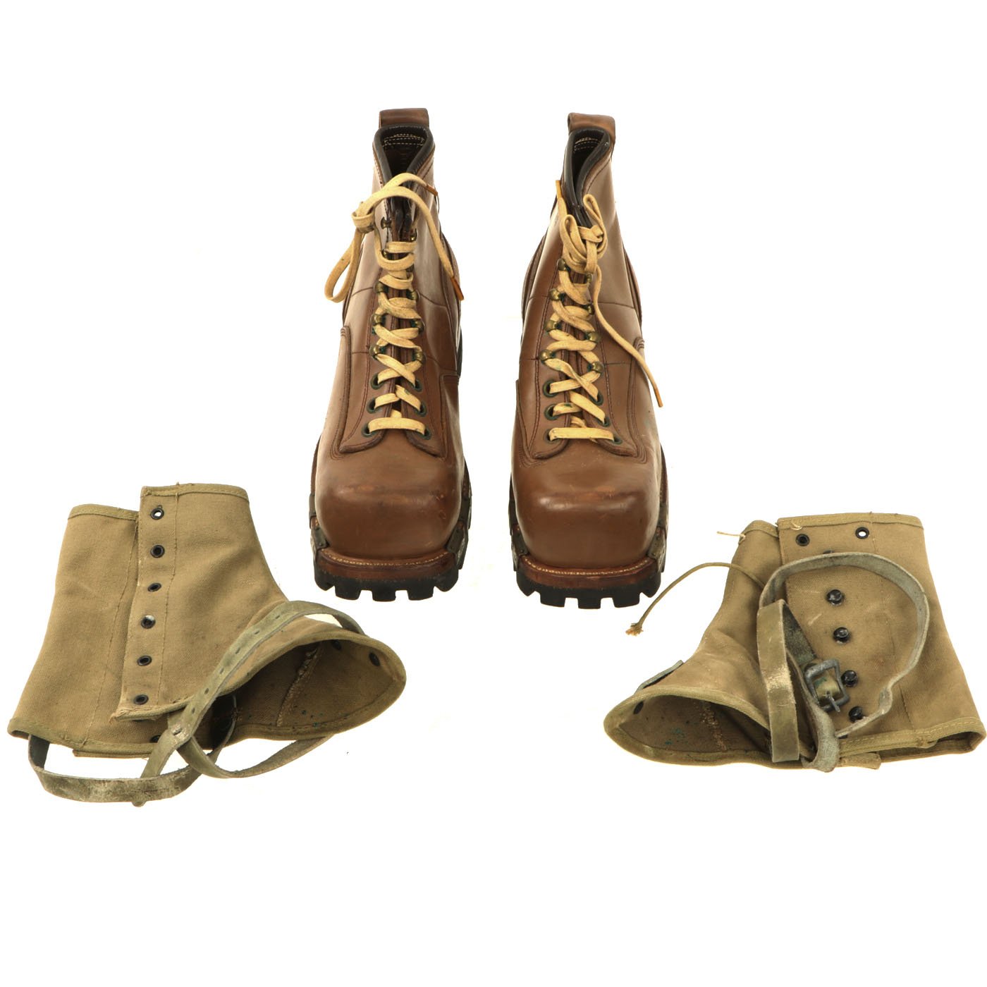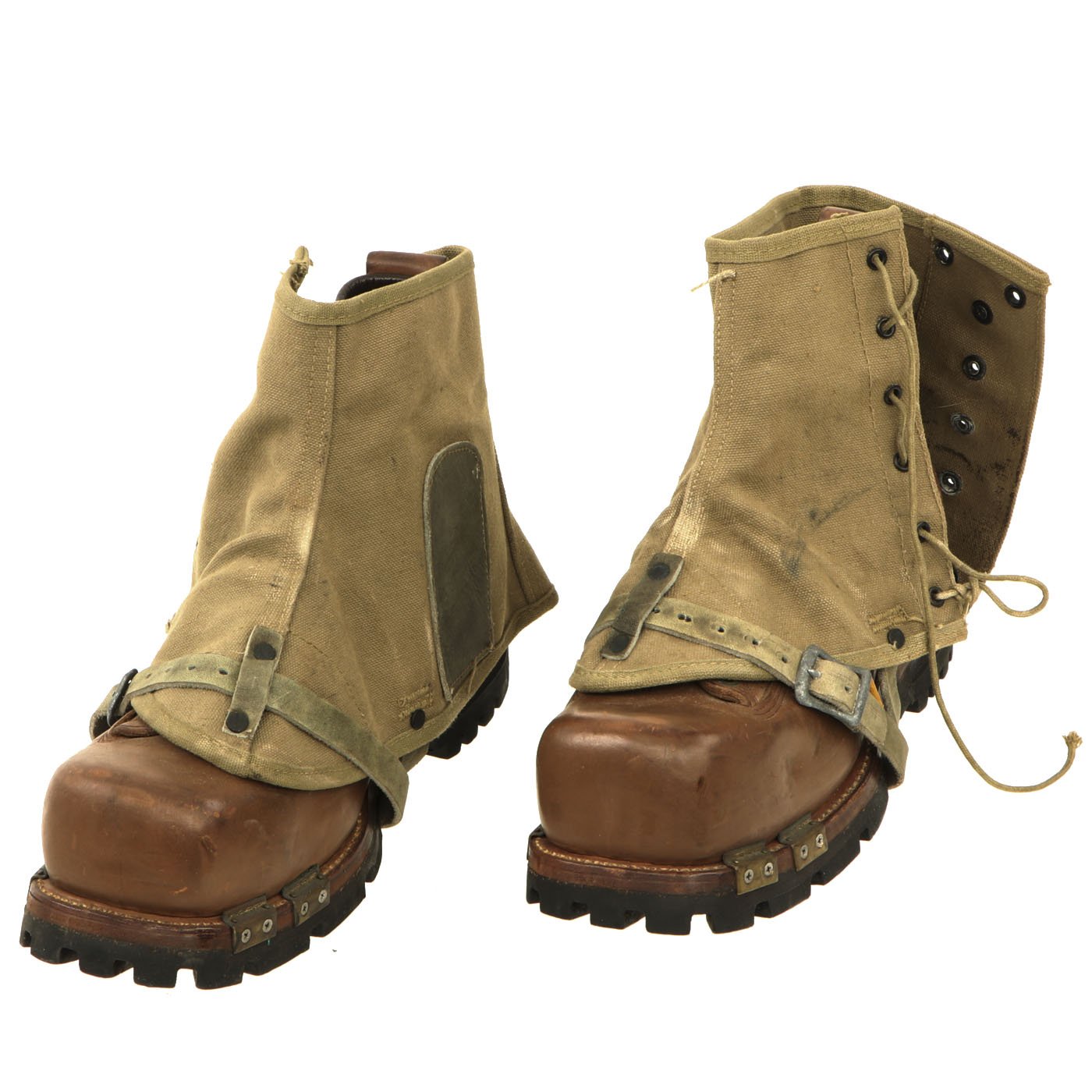 Original Item: Only One Pair Available. This is an excellent condition, nearly unissued matched pair of 1943 dated Army Ski-Mountain Boots in size 7 1/2 D, as marked on the inside and top exterior. The come complete with a matched set of OD Green Canvas Gaiters, used to increase protection and insulation of the boots.