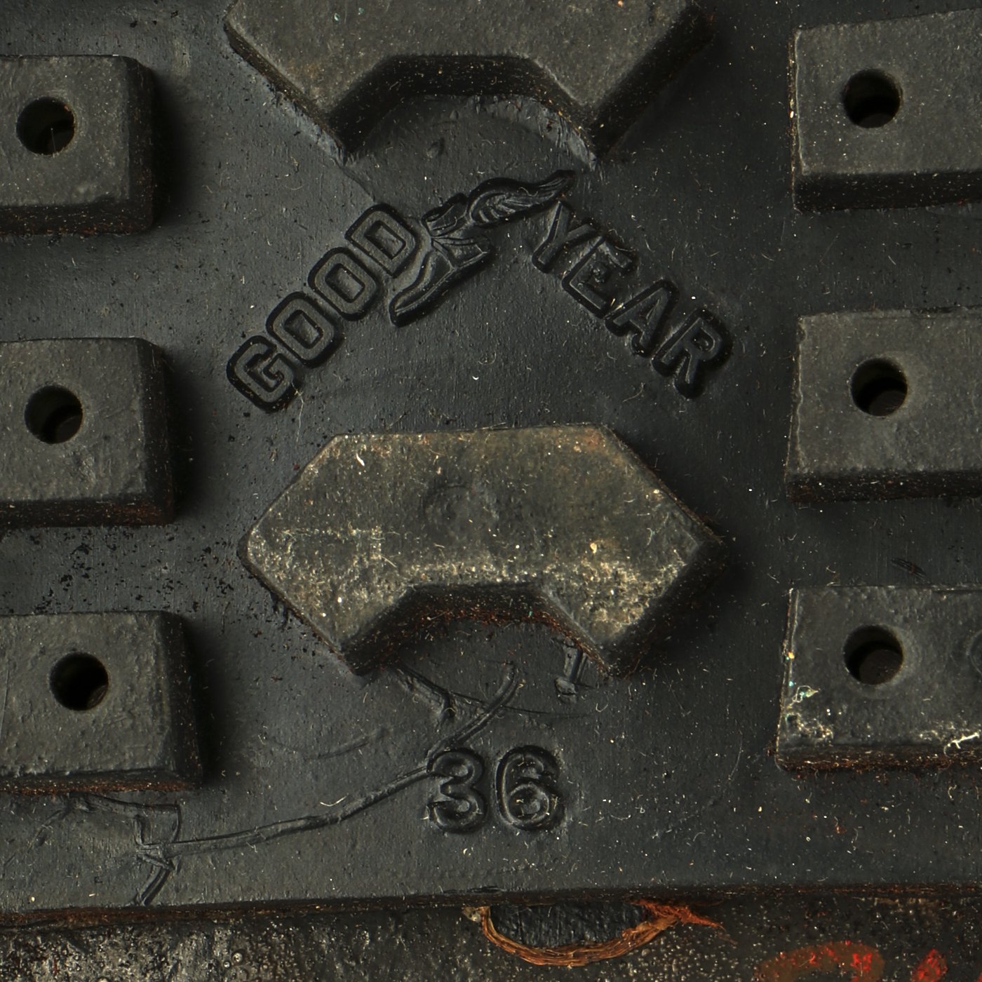 Both boots are in excellent unissued condition, with just storage wear and verdigris from decades of storage. Both have rubber soles by GOOD YEAR and have identical markings on the inside: