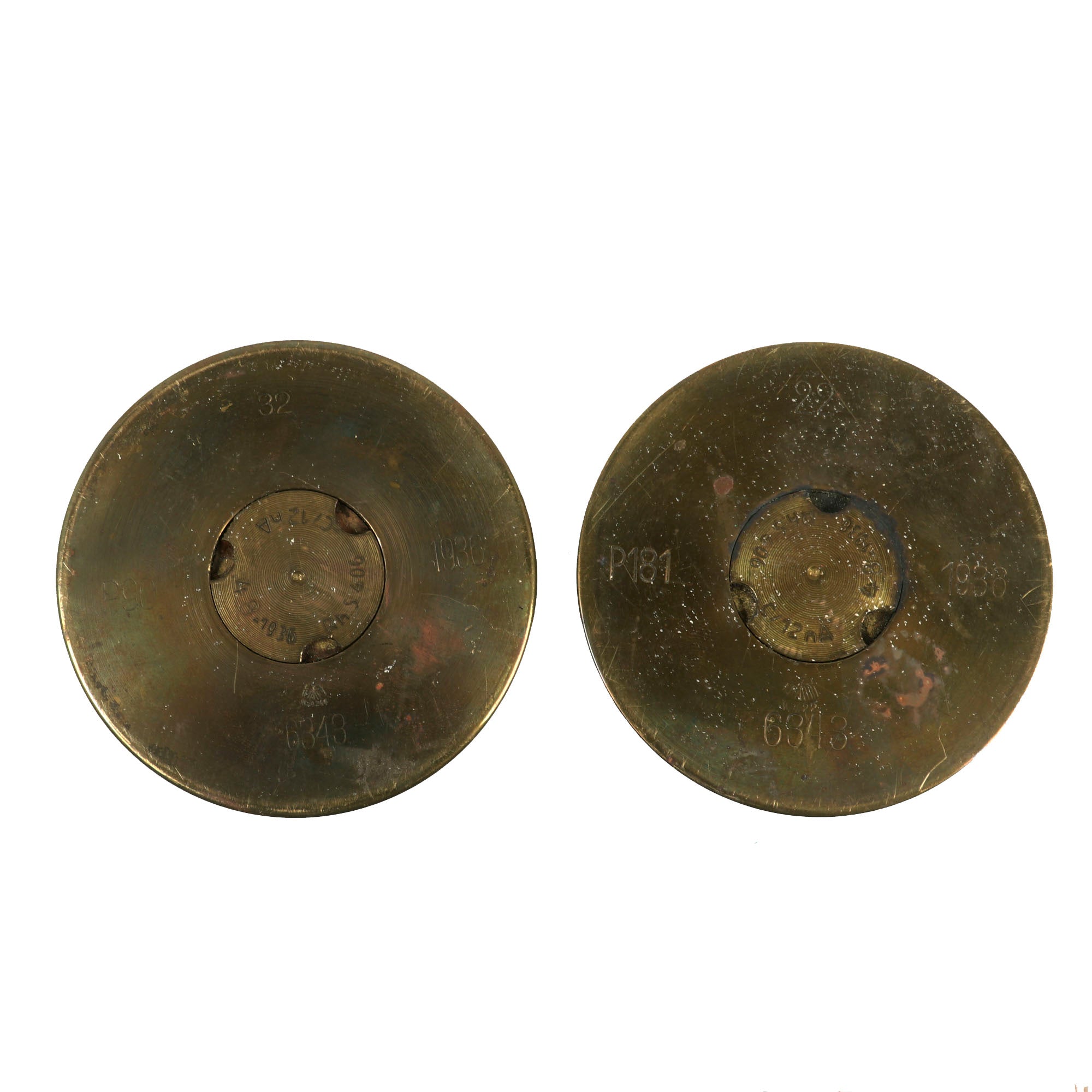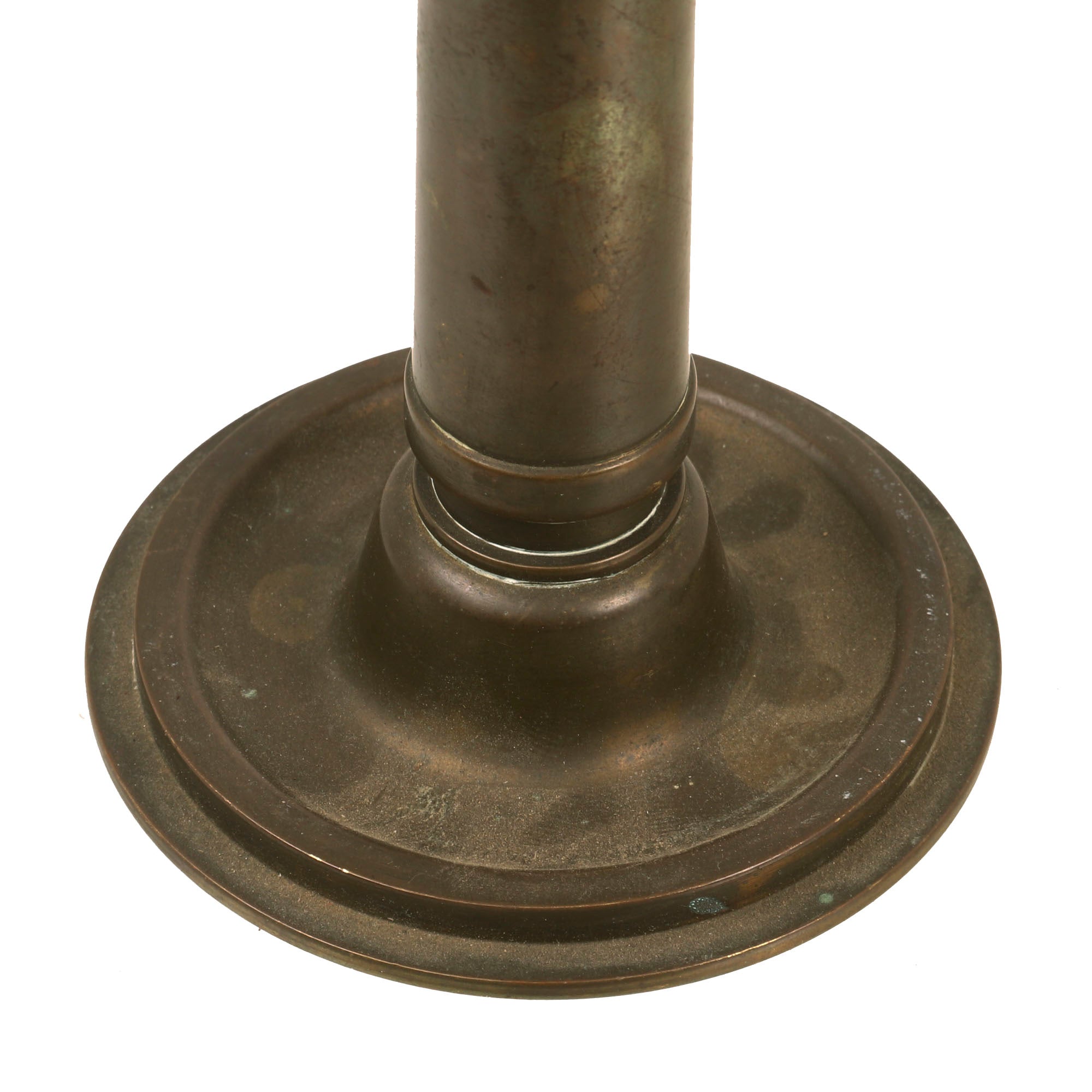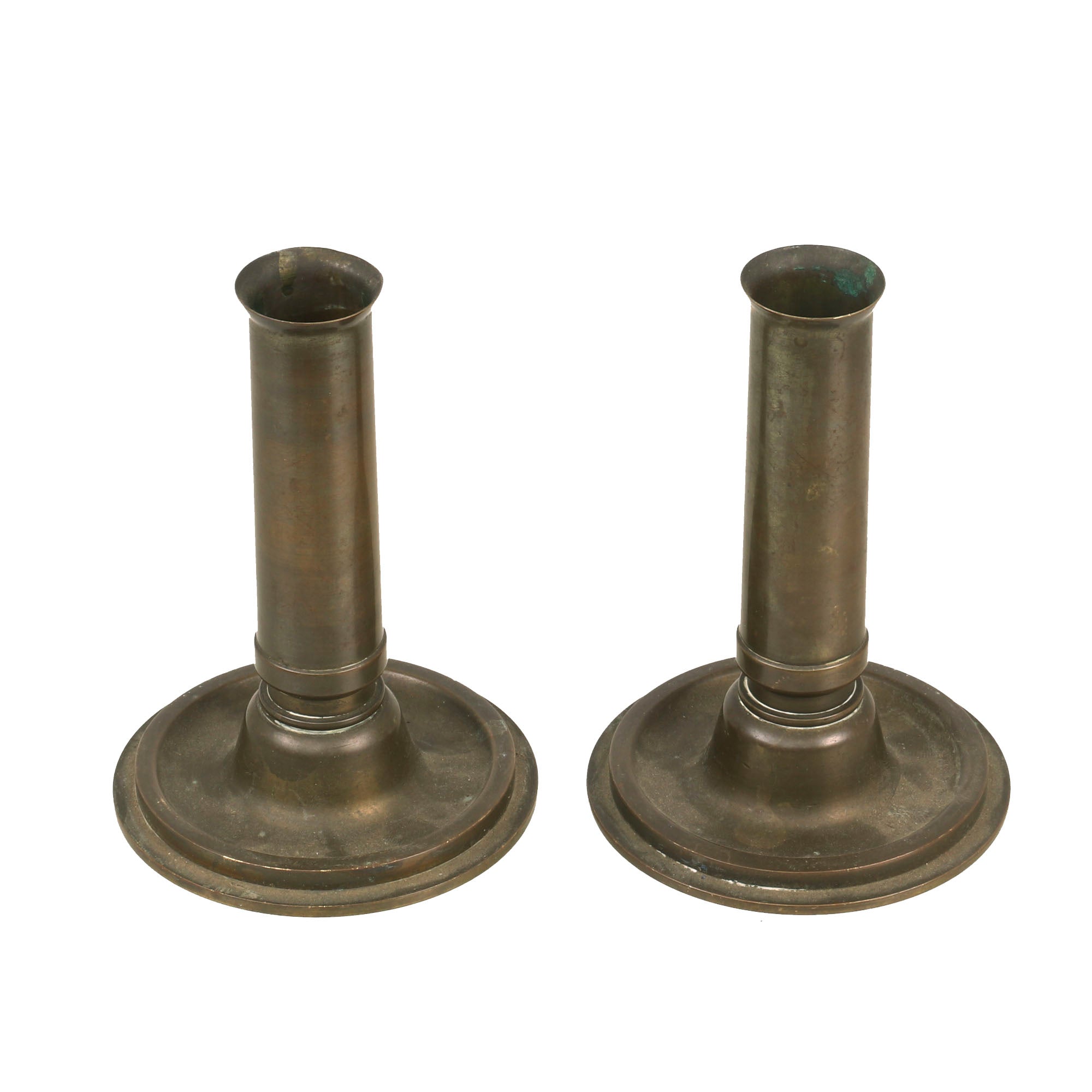 This is a great pair of candlesticks made from captured German artillery shells, both dated 1936. They measure 5” tall with a 3⅝” base diameter. They retain their patina and display gorgeously.