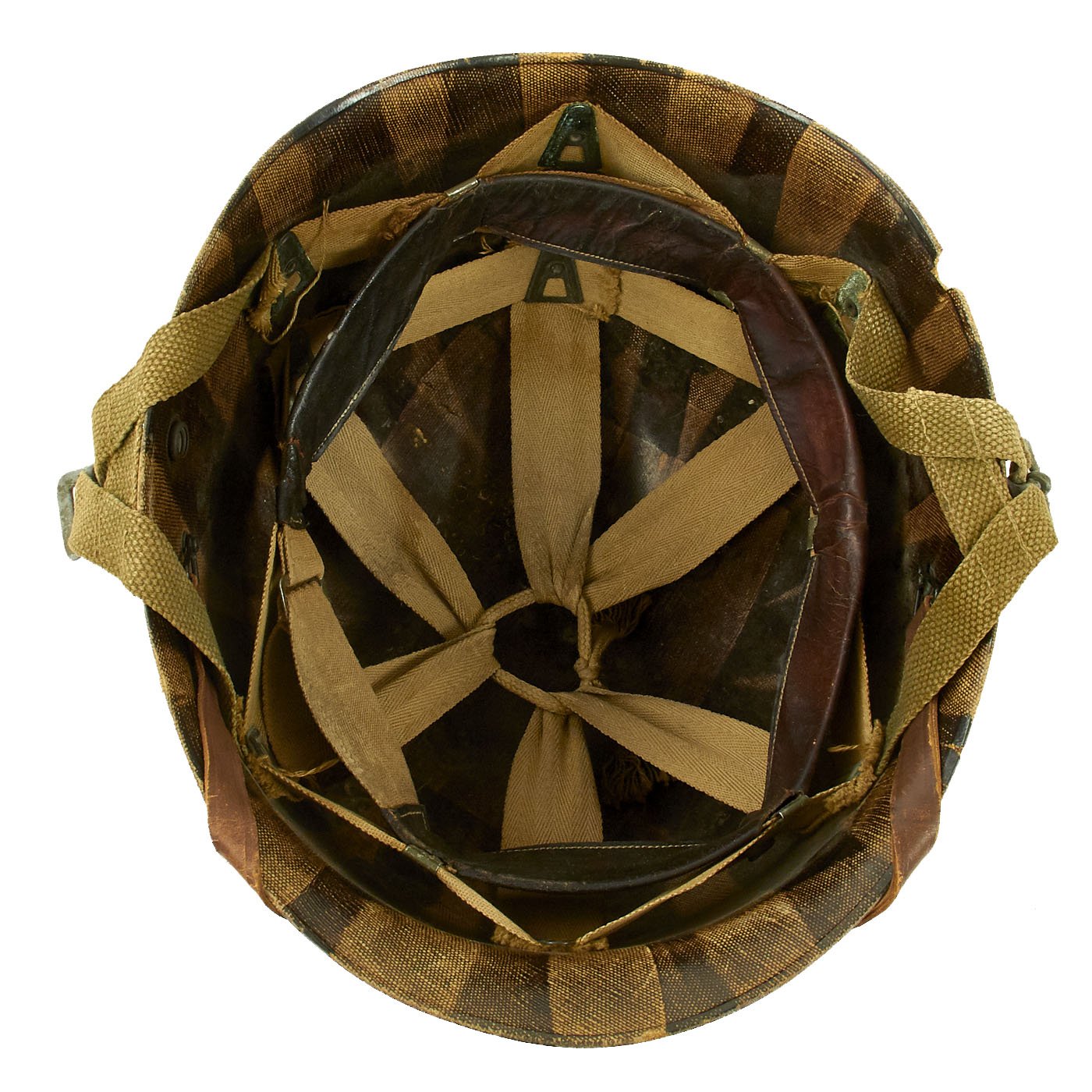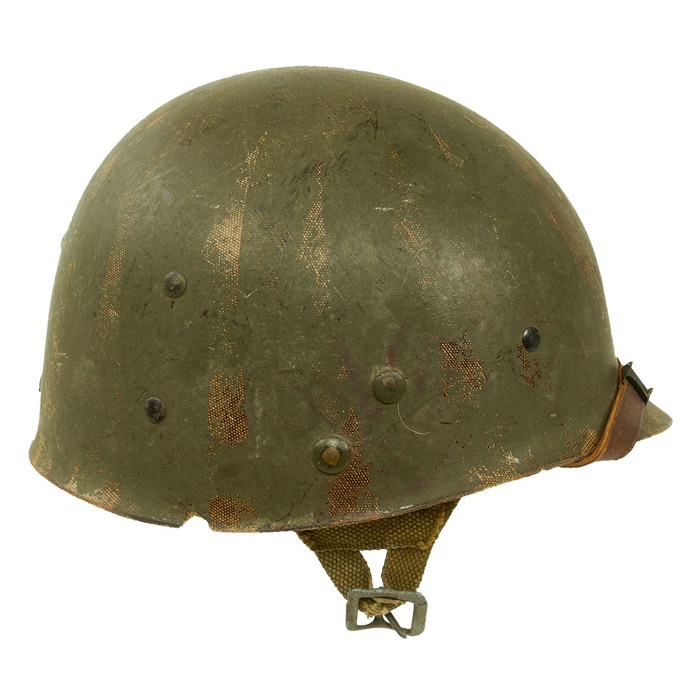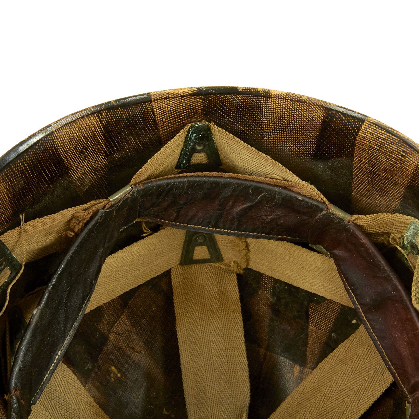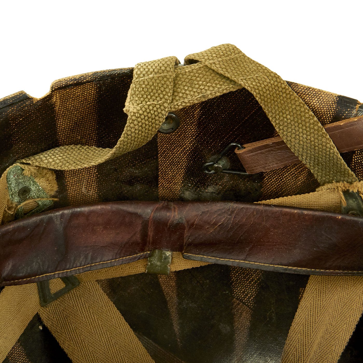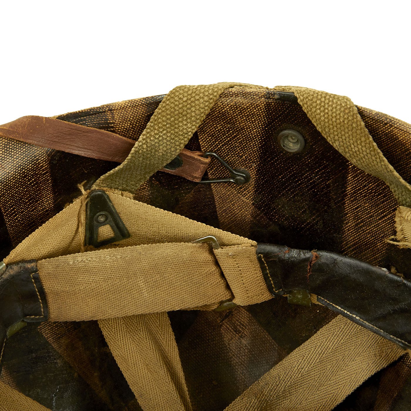 This true M1 liner be identified through the frontal eyelet hole. Other correct features include OD Green #3 cotton herringbone twill (HBT) cloth suspension liner. This HBT suspension is held tightly within the M-1 helmet liner by rivets and a series of triangular "A" washers. The three upper suspension bands are joined together with the correct tie string. This way the wearer could adjust the fit. The original suspension is definitely aged and worn, with some tears. The sweatband is present but deteriorated due to age and use. The paratrooper chin strap extensions are both complete with their cast steel buckles, and are in the correct OD Green #3, which matches the aged color of the rigging perfectly.