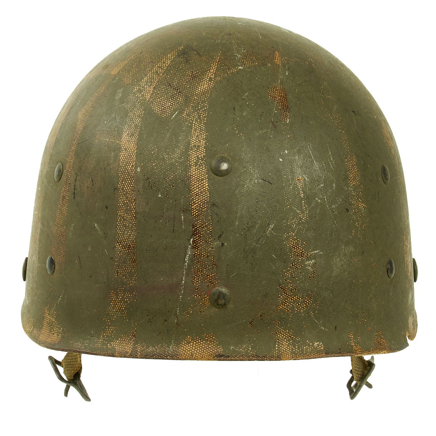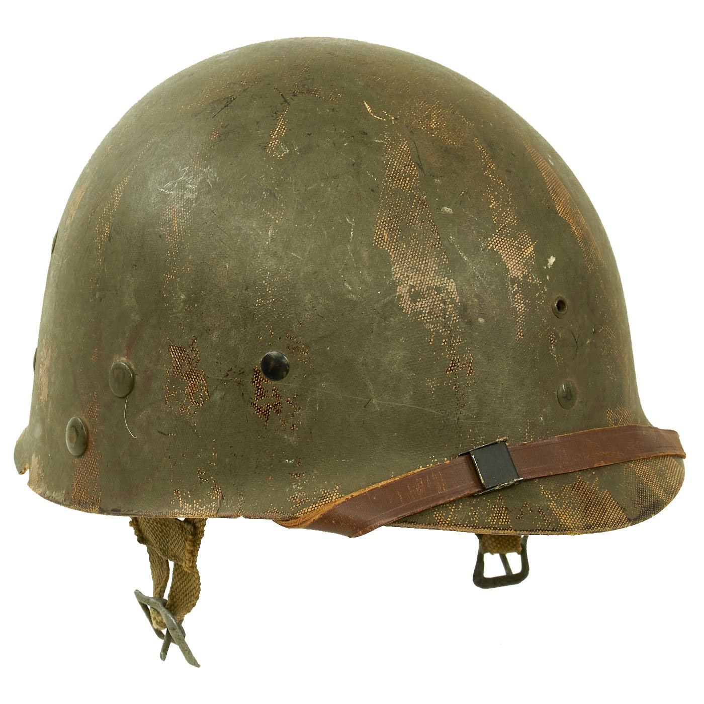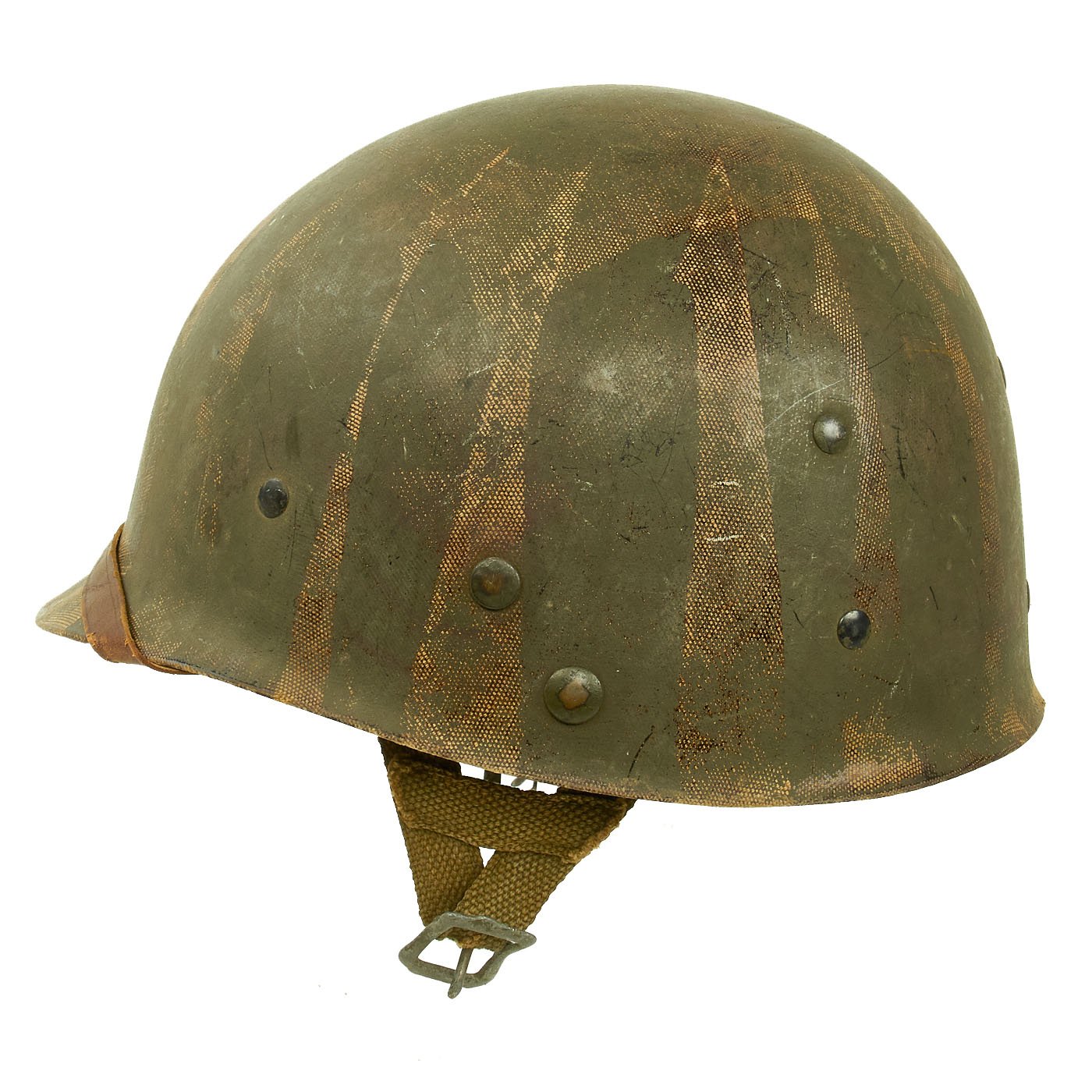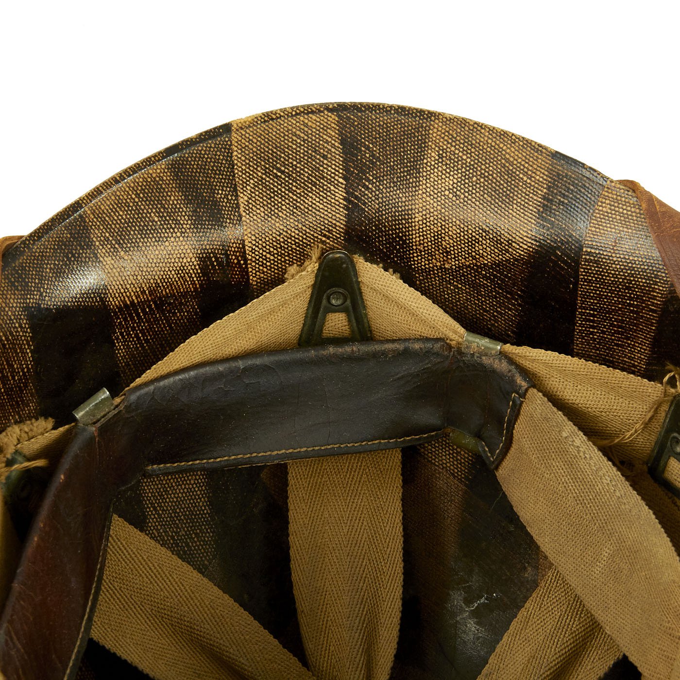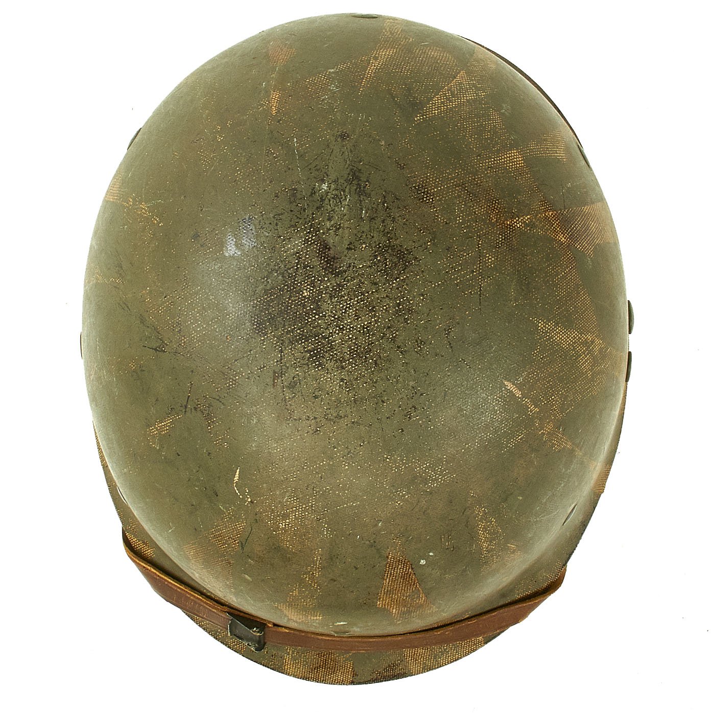 This true M1 liner be identified through the frontal eyelet hole. Other correct features include OD Green #3 cotton herringbone twill (HBT) cloth suspension liner. This HBT suspension is held tightly within the M-1 helmet liner by rivets and a series of triangular "A" washers. The three upper suspension bands are joined together with the correct tie string. This way the wearer could adjust the fit. The original suspension is definitely aged and worn, with some tears. The sweatband is present but deteriorated due to age and use. The paratrooper chin strap extensions are both complete with their cast steel buckles, and are in the correct OD Green #3, which matches the aged color of the rigging perfectly.
