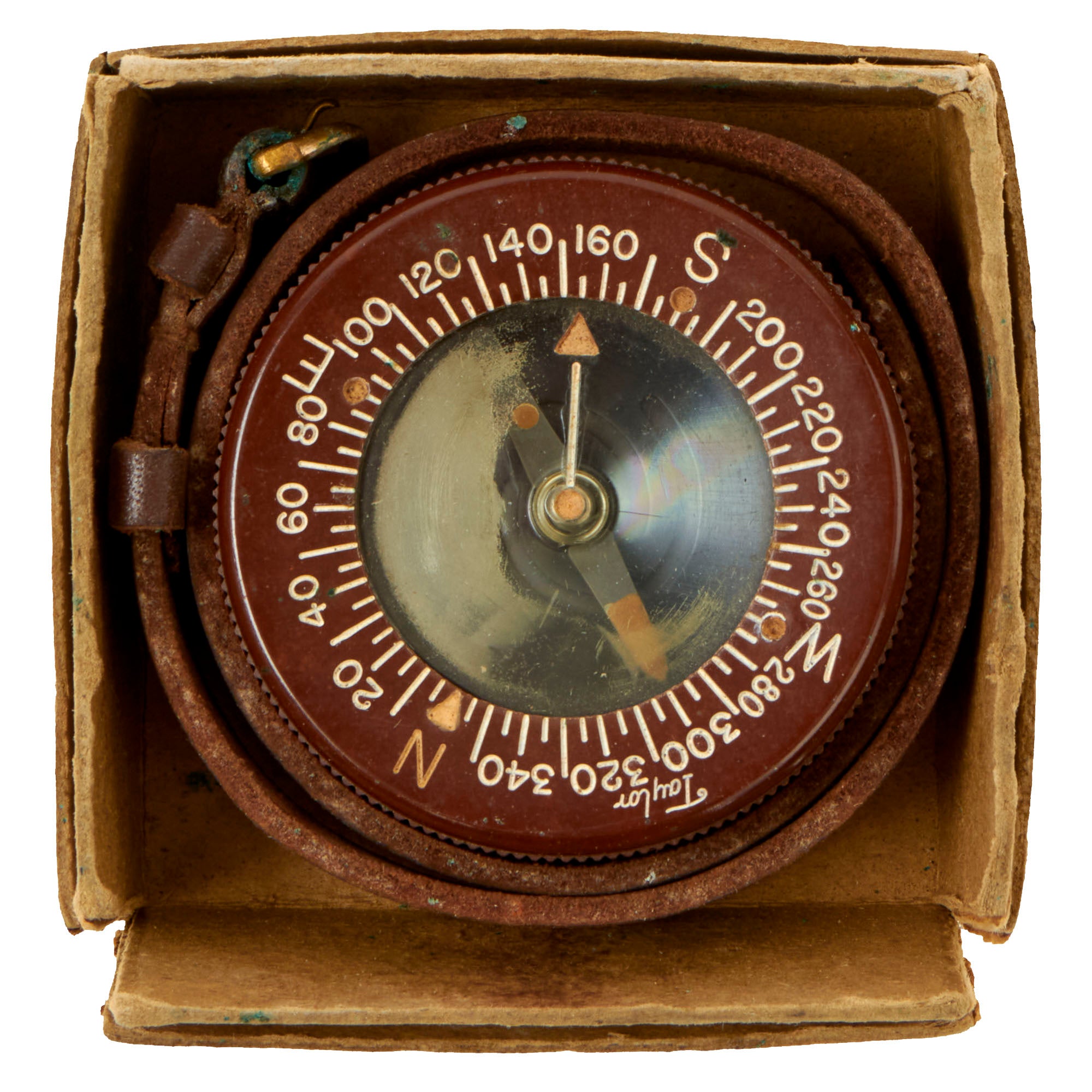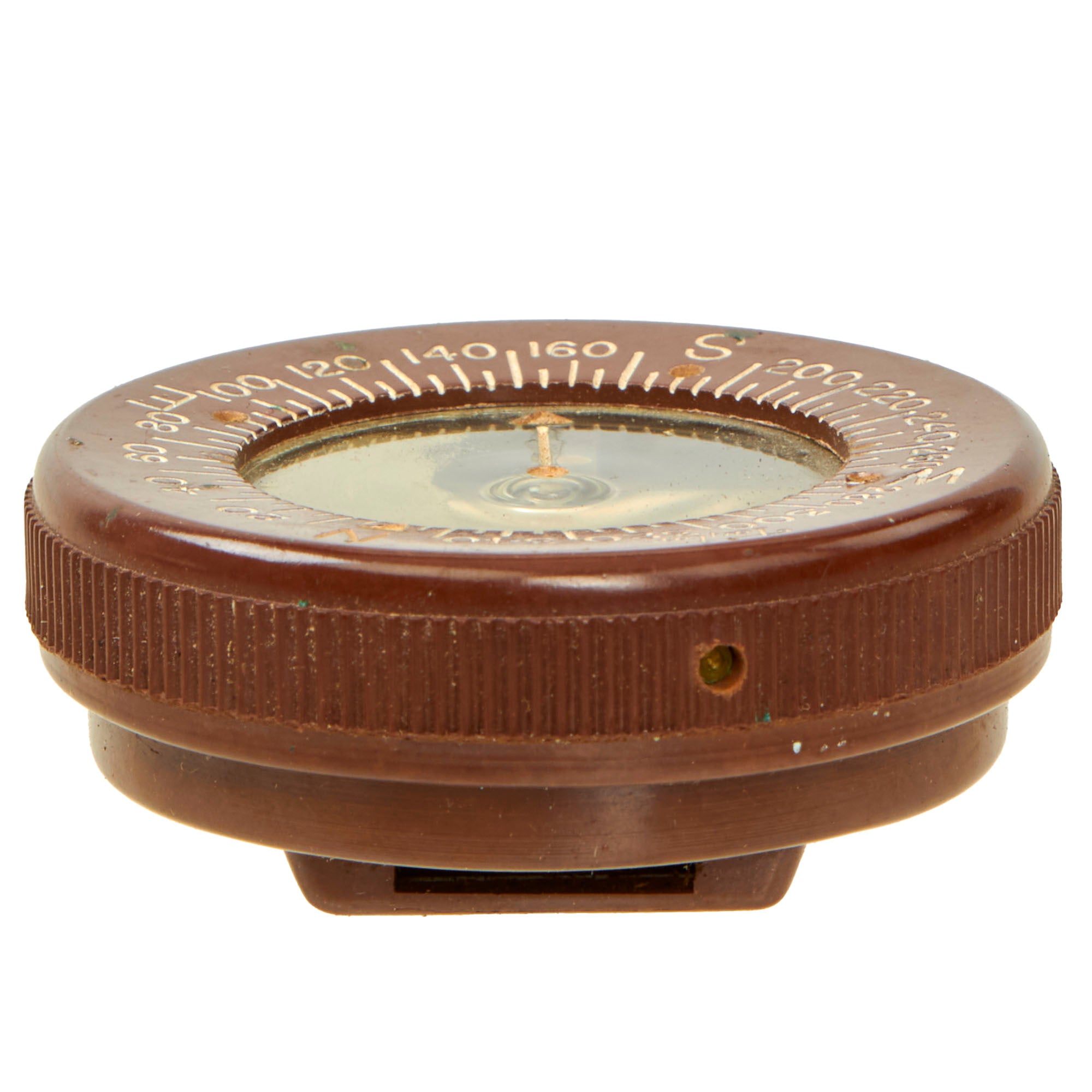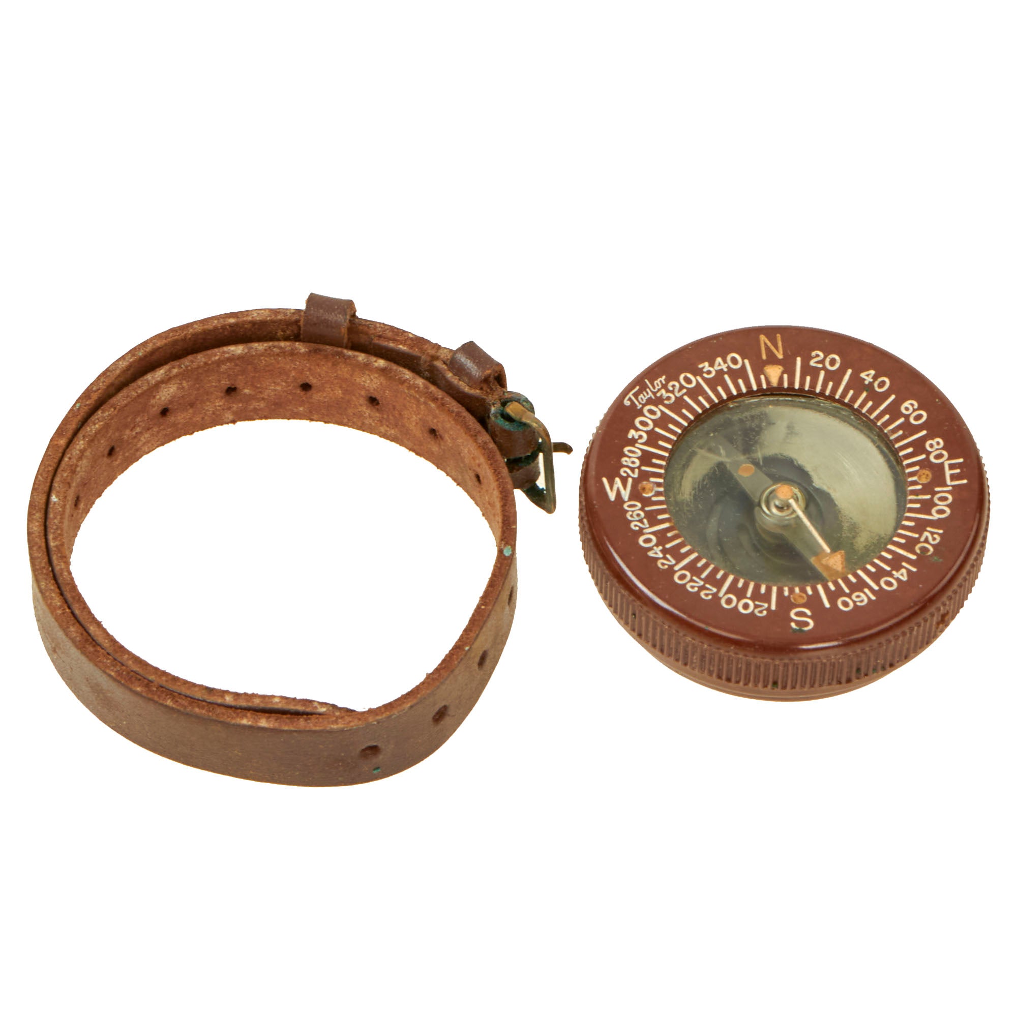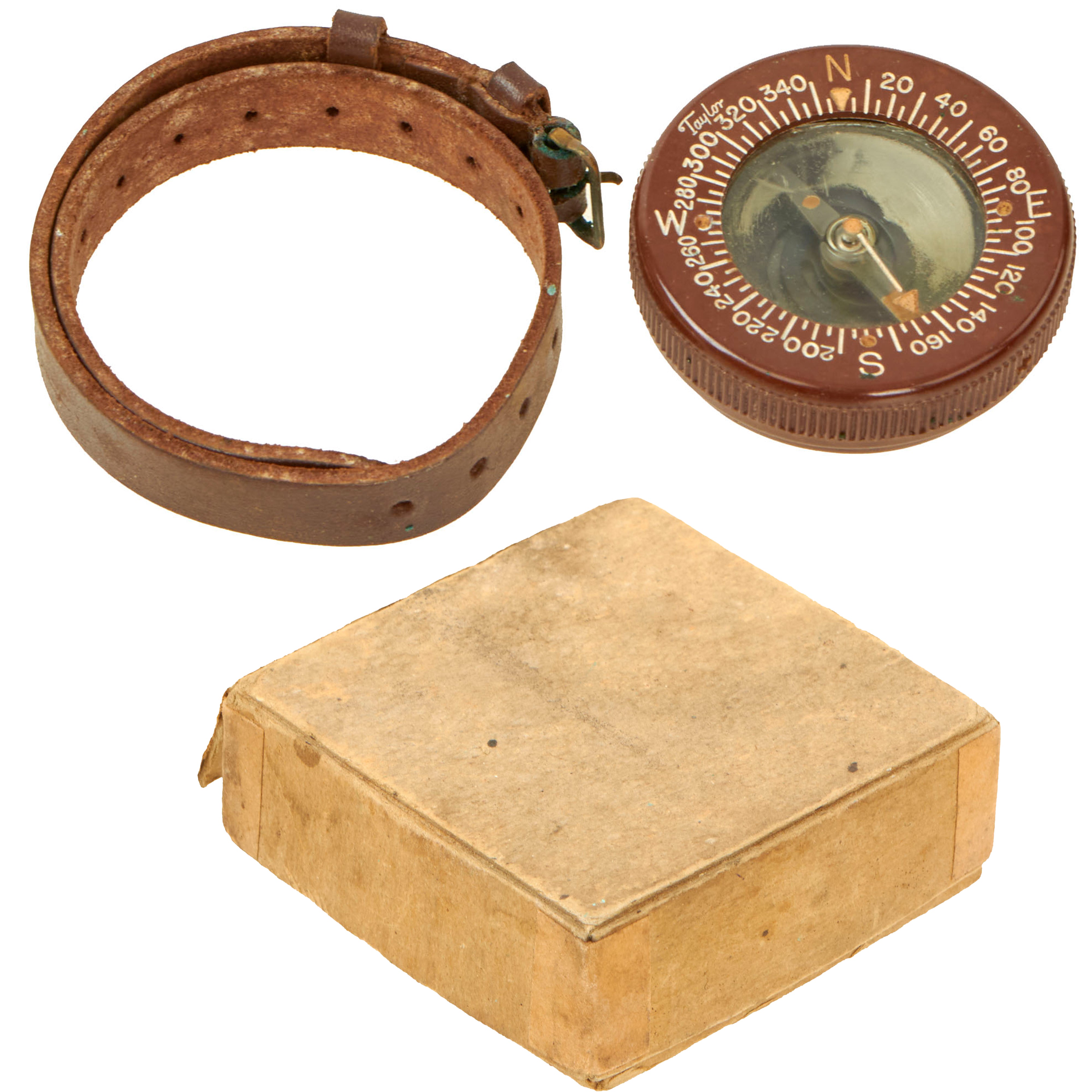 Original Item: Only One Available. This is a genuine WW2 issue wartime model wrist compass, as used by Airborne troops on D-Day. This example is still fully functional, though it has lost some of the liquid dampening fluid (usually water), and is in fair condition with the original issue leather wrist band and box. The band is in solid condition with only minor verdigris buildup. There is some residue on the interior glass but otherwise is in good shape. The corners of the box are coming apart.