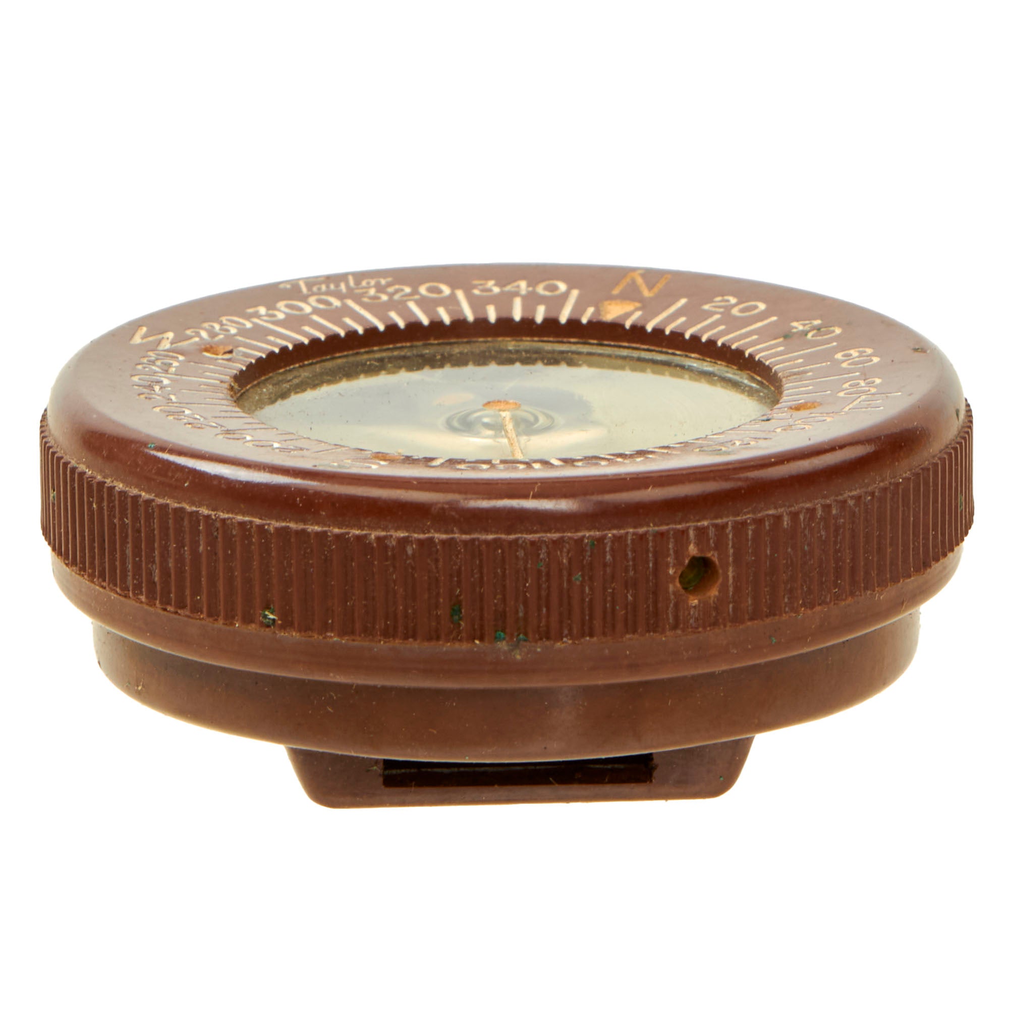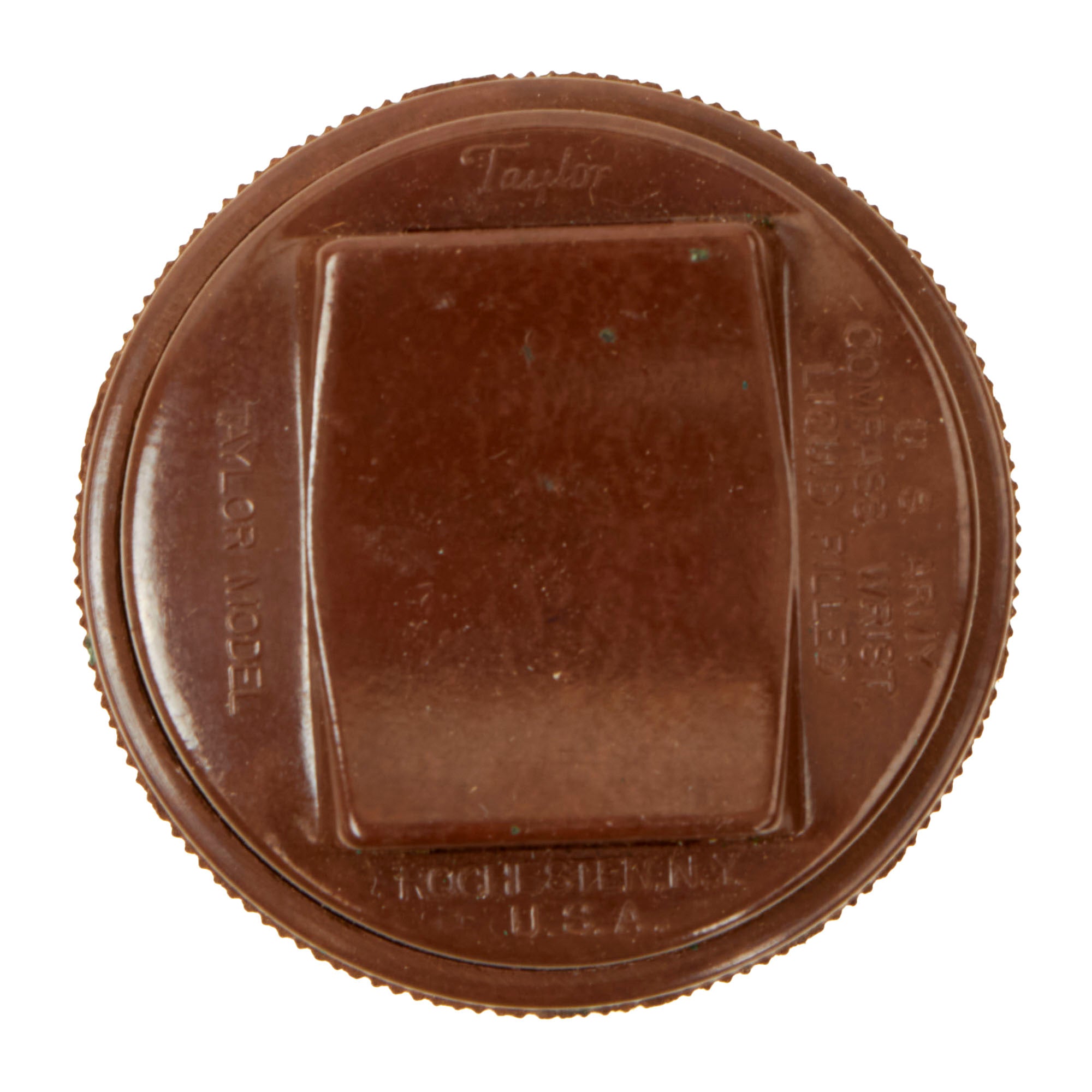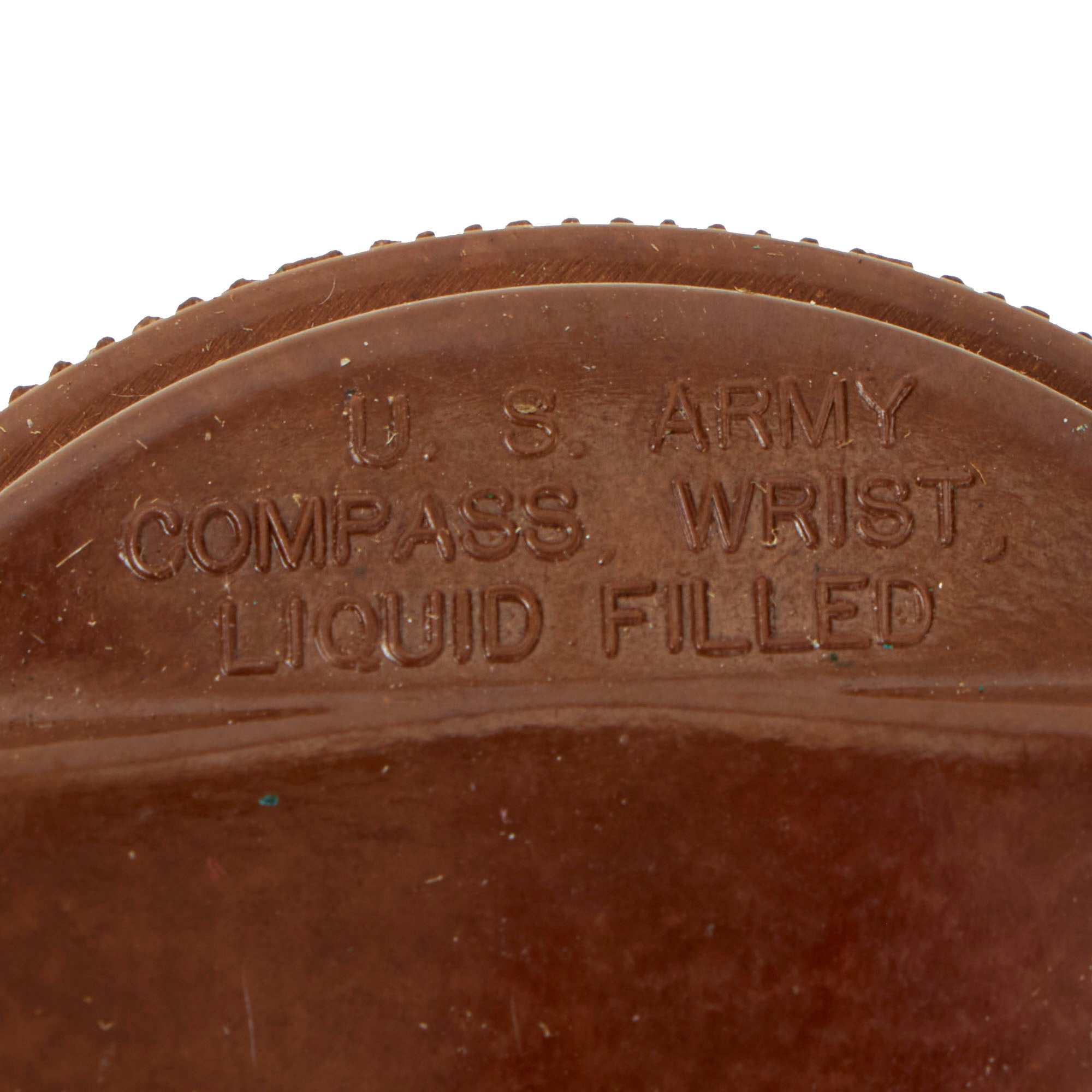 This compass, officially known as "Compass, Wrist, Liquid-filled", was made by Taylor, whose stylized logo is also on the rotating cover. The compass was usually seen worn on the wrist (duh!), but also over the sleeve, the shoulder loops, webbing, or at the ankle over the jump boots. Wrist compasses were used both by officers and enlisted men, unlike the lensatic compass, or marching compass, which was normally reserved for officers, NCO's or men on a special mission.