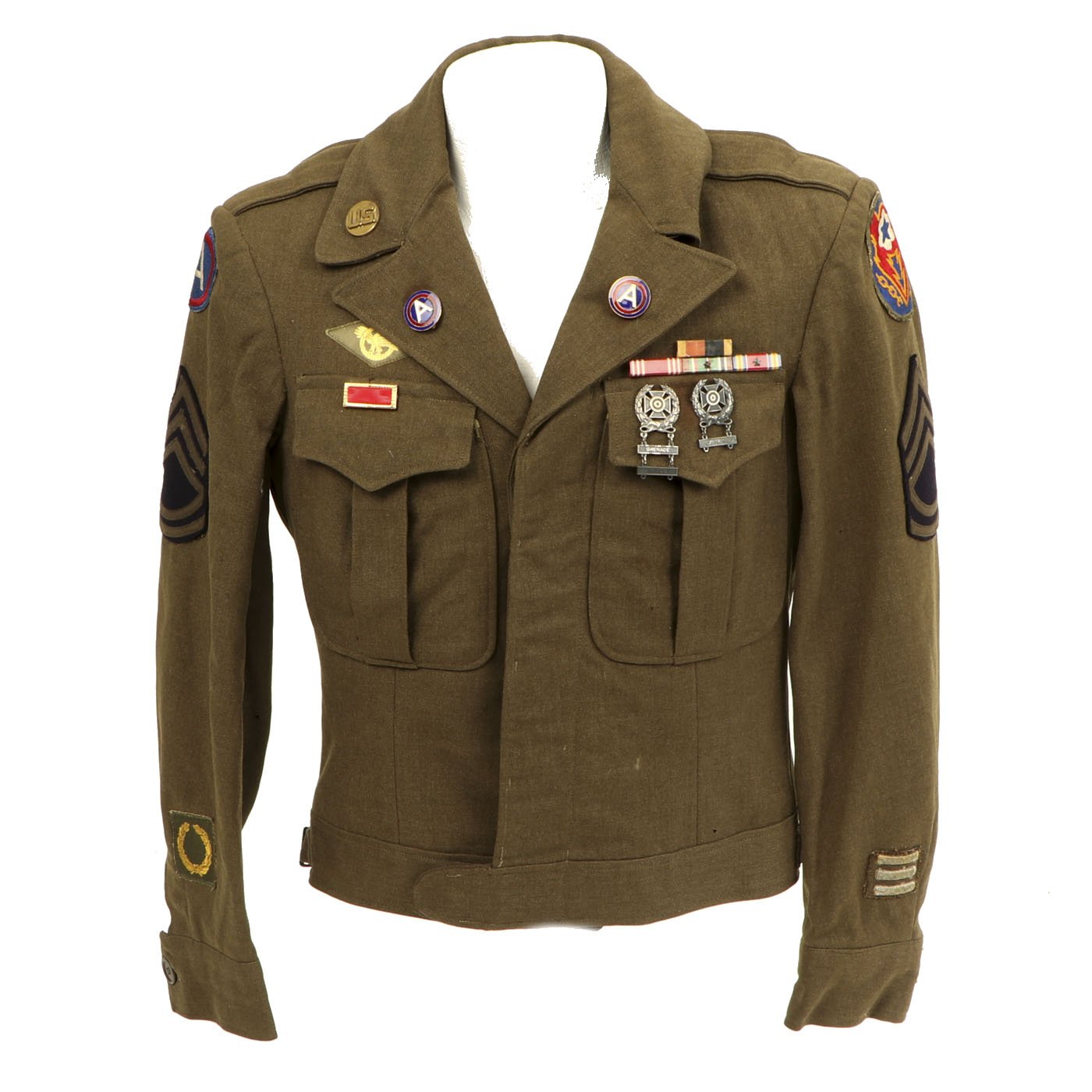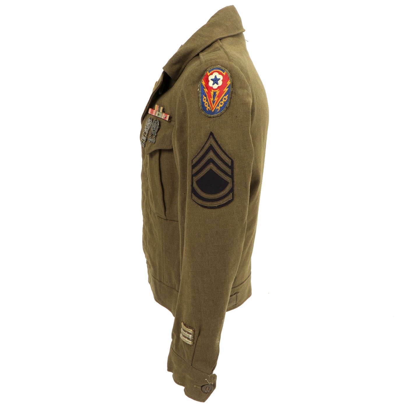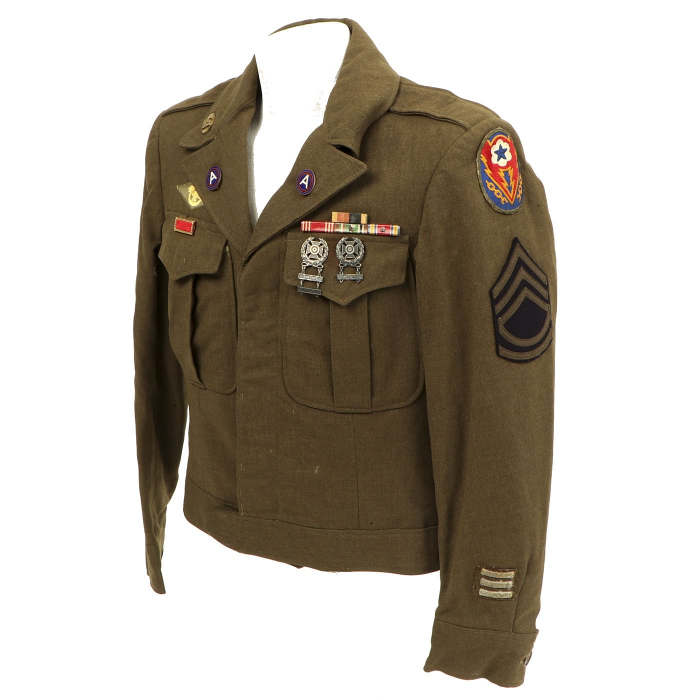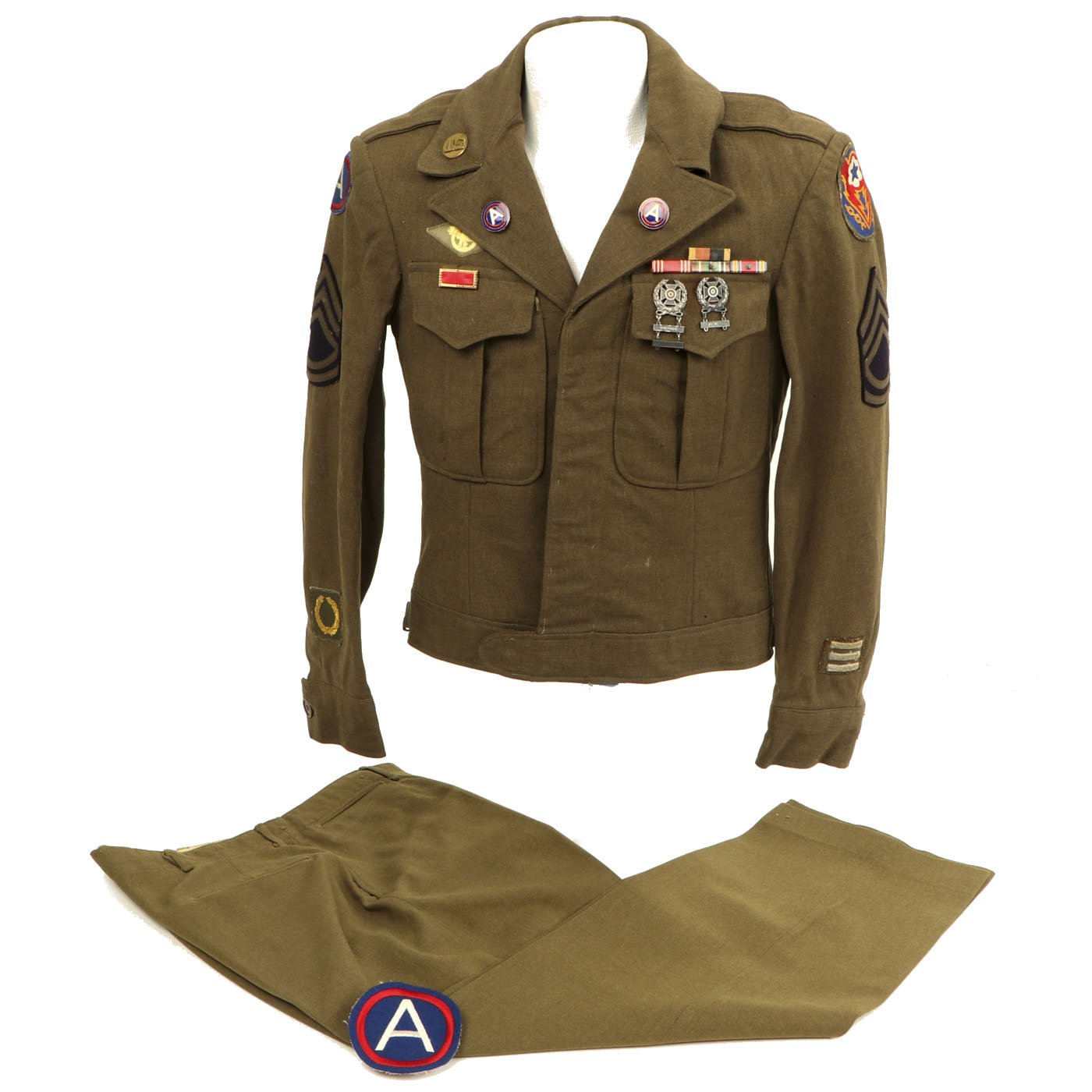 Original Item: One-of-a-kind. This is a World War Two United States General Patton's Third Army Ike jacket with pants. The jacket is named (faintly) in ink and is size 34L. it features pin back enamel Third Army Distinctive Intent Insignia pins to the collar as well as a Third Army patch to the right shoulder and a WWII ETO (European Theater of Operations) Advance Base/Advance Sector Patch to the left shoulder. Each sleeve has Technical Sergeant chevrons. The jacket has ribbon medal bars, expert badges, Ruptured duck and more. Also included are correct wool pants.