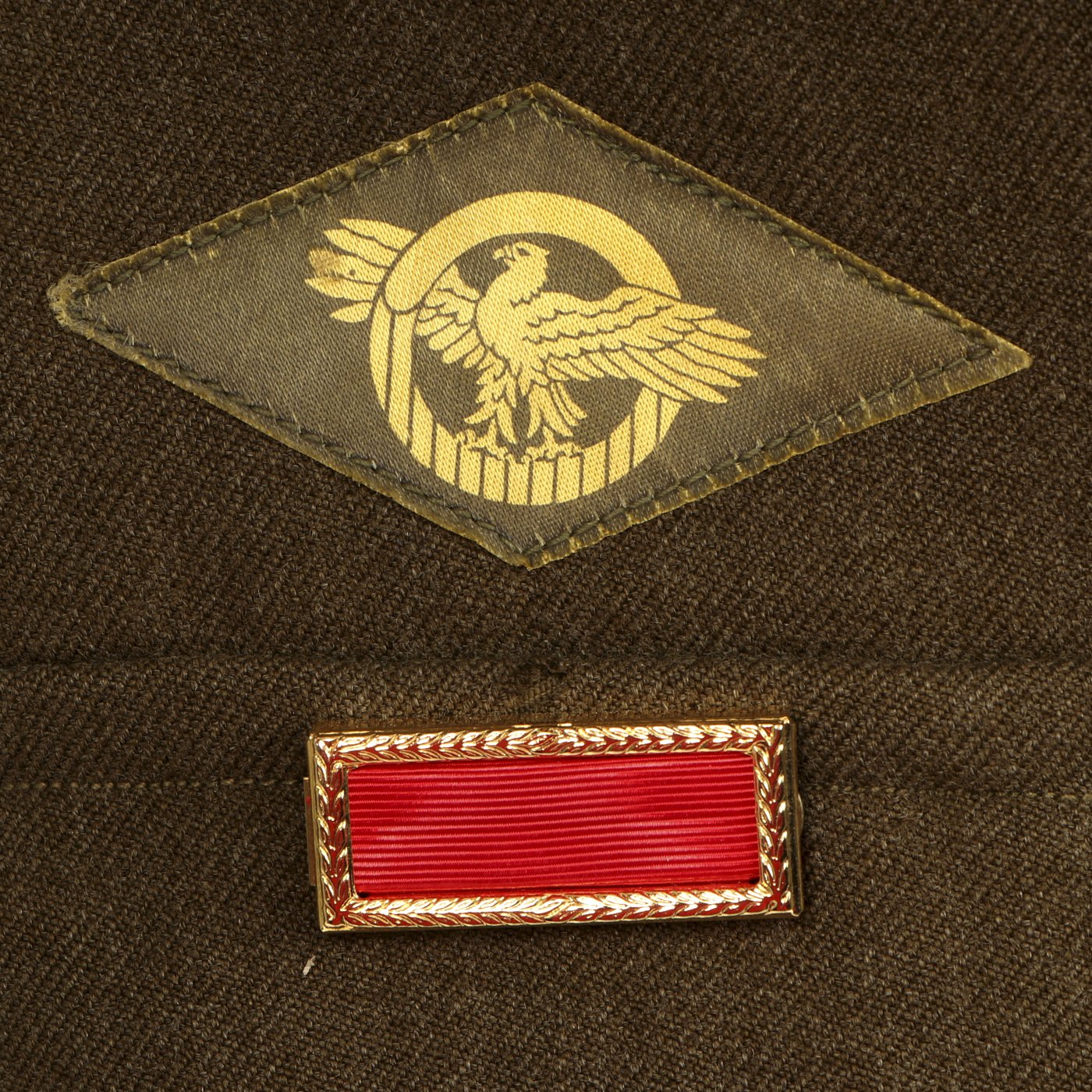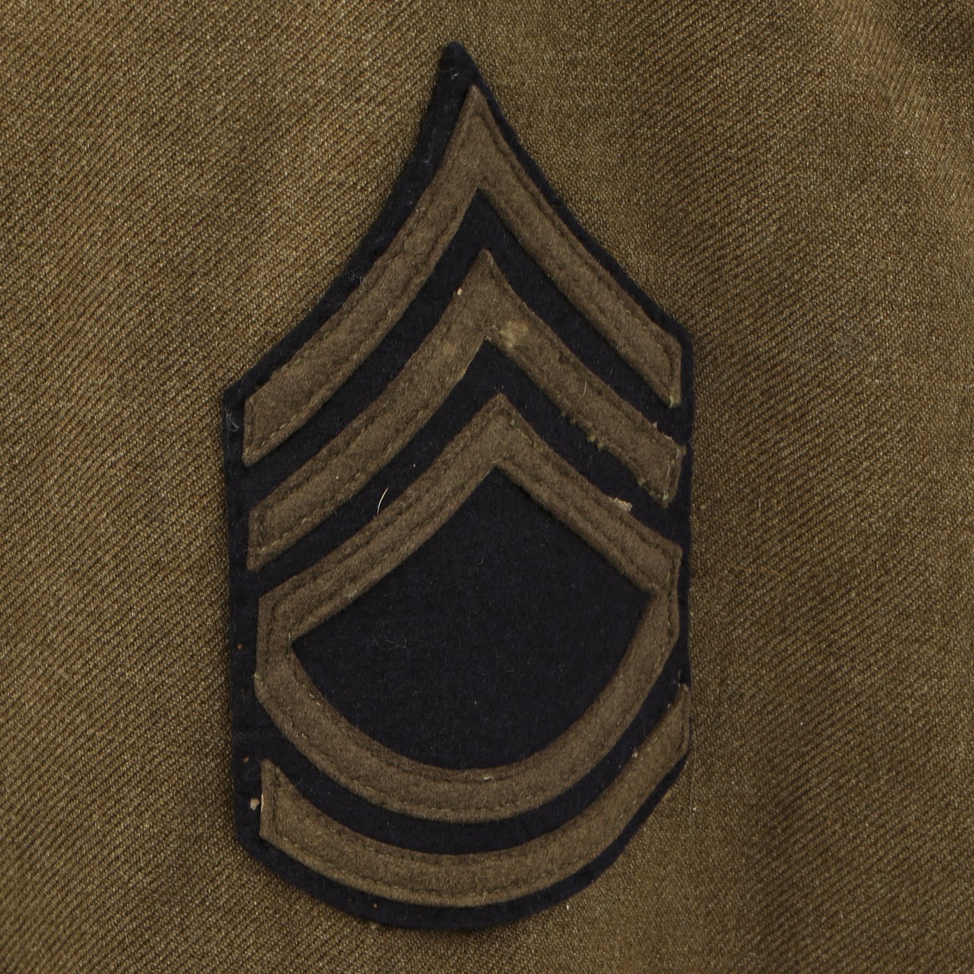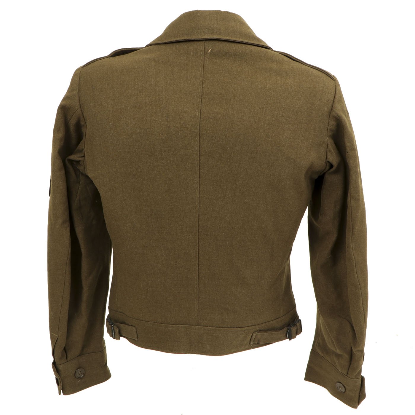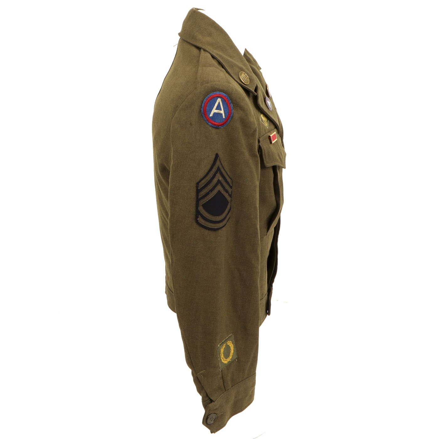 Original Item: One-of-a-kind. This is a World War Two United States General Patton's Third Army Ike jacket with pants. The jacket is named (faintly) in ink and is size 34L. it features pin back enamel Third Army Distinctive Intent Insignia pins to the collar as well as a Third Army patch to the right shoulder and a WWII ETO (European Theater of Operations) Advance Base/Advance Sector Patch to the left shoulder. Each sleeve has Technical Sergeant chevrons. The jacket has ribbon medal bars, expert badges, Ruptured duck and more. Also included are correct wool pants.
