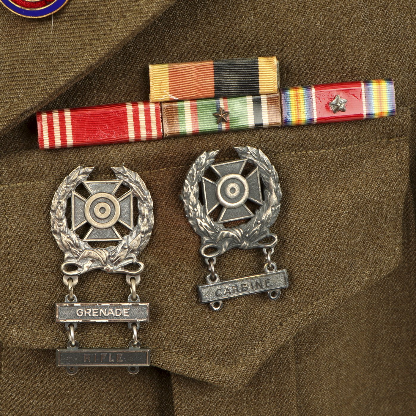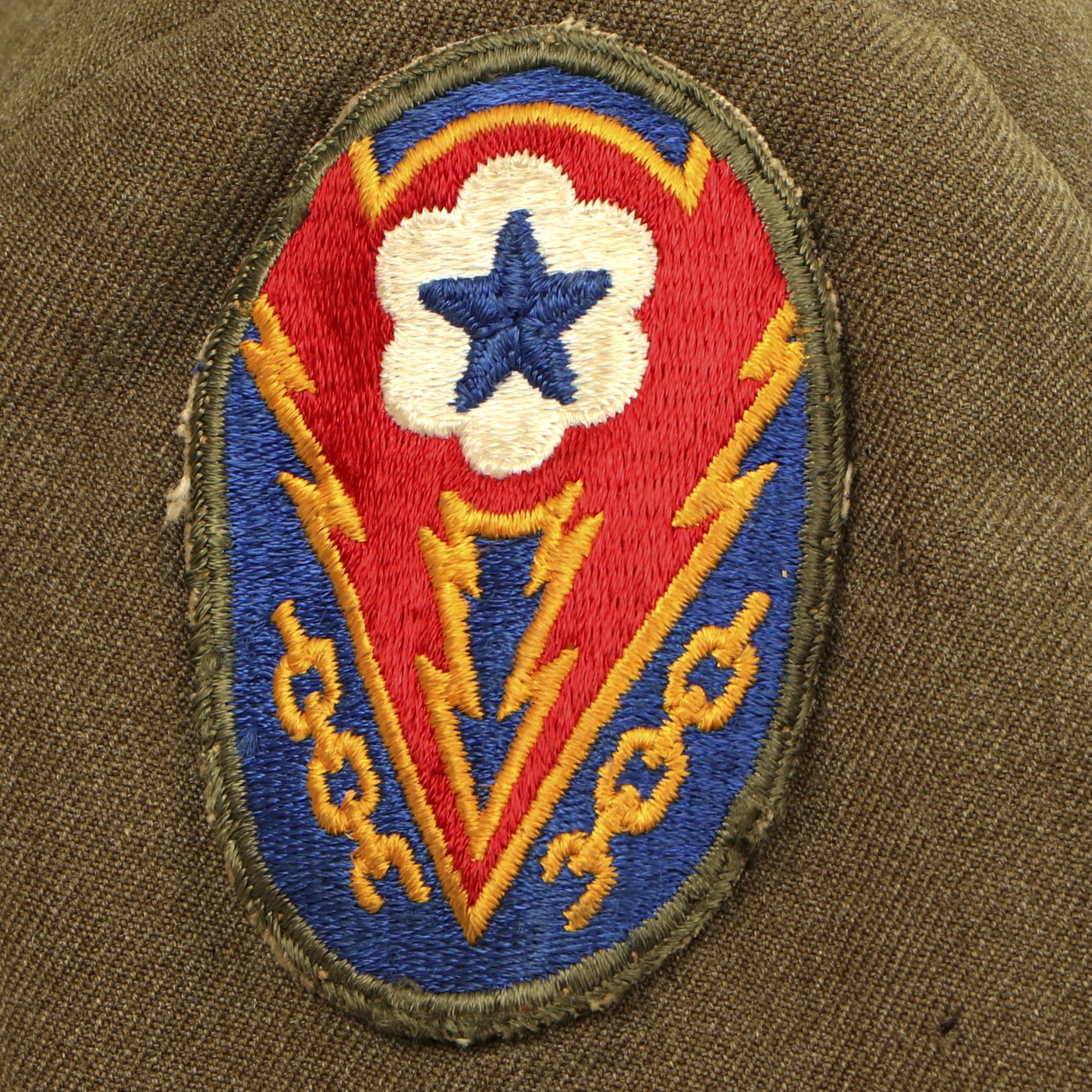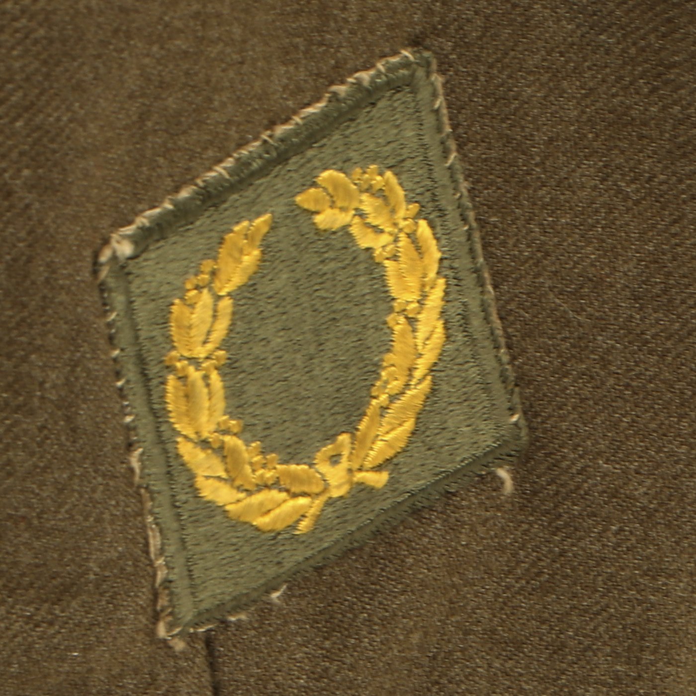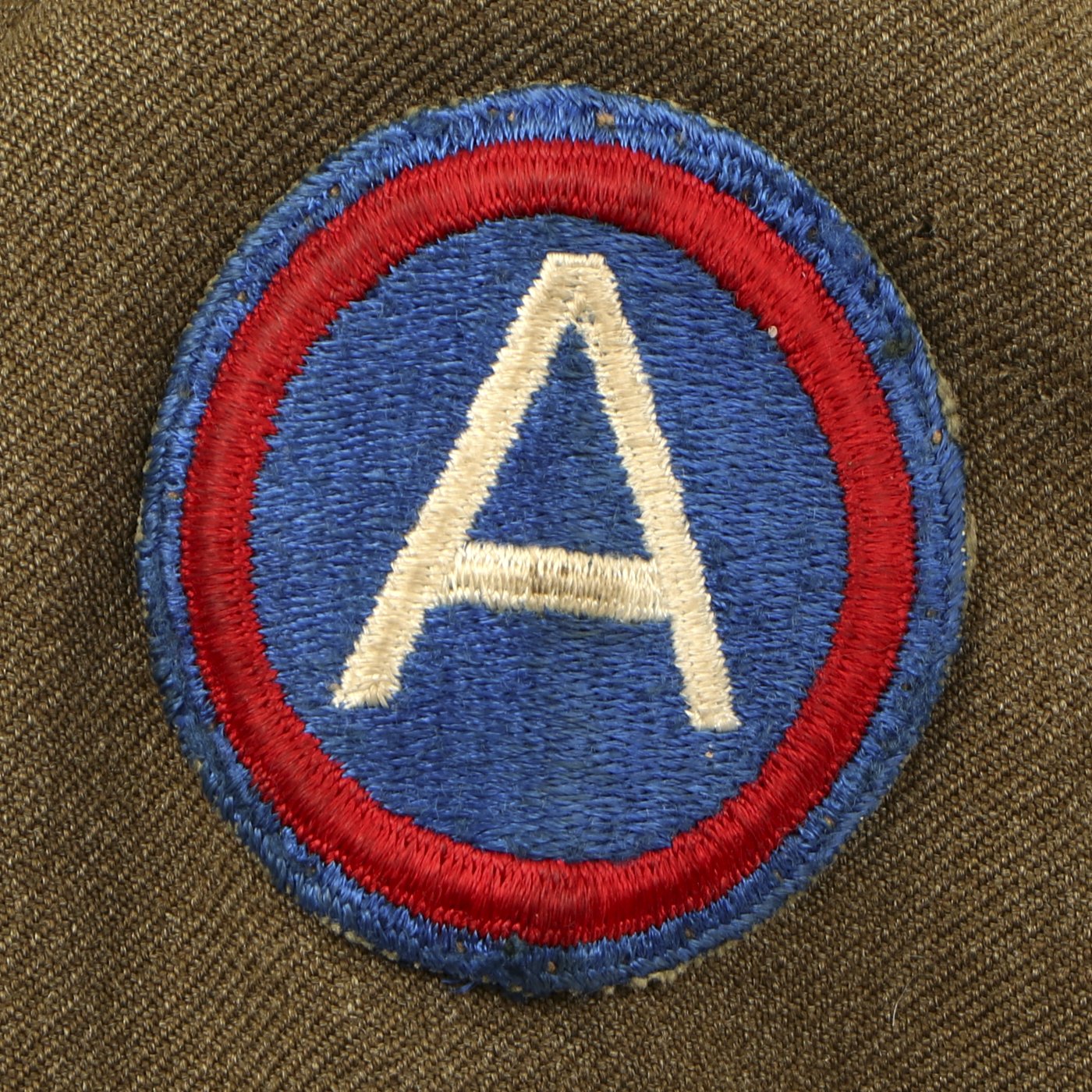 Original Item: One-of-a-kind. This is a World War Two United States General Patton's Third Army Ike jacket with pants. The jacket is named (faintly) in ink and is size 34L. it features pin back enamel Third Army Distinctive Intent Insignia pins to the collar as well as a Third Army patch to the right shoulder and a WWII ETO (European Theater of Operations) Advance Base/Advance Sector Patch to the left shoulder. Each sleeve has Technical Sergeant chevrons. The jacket has ribbon medal bars, expert badges, Ruptured duck and more. Also included are correct wool pants.