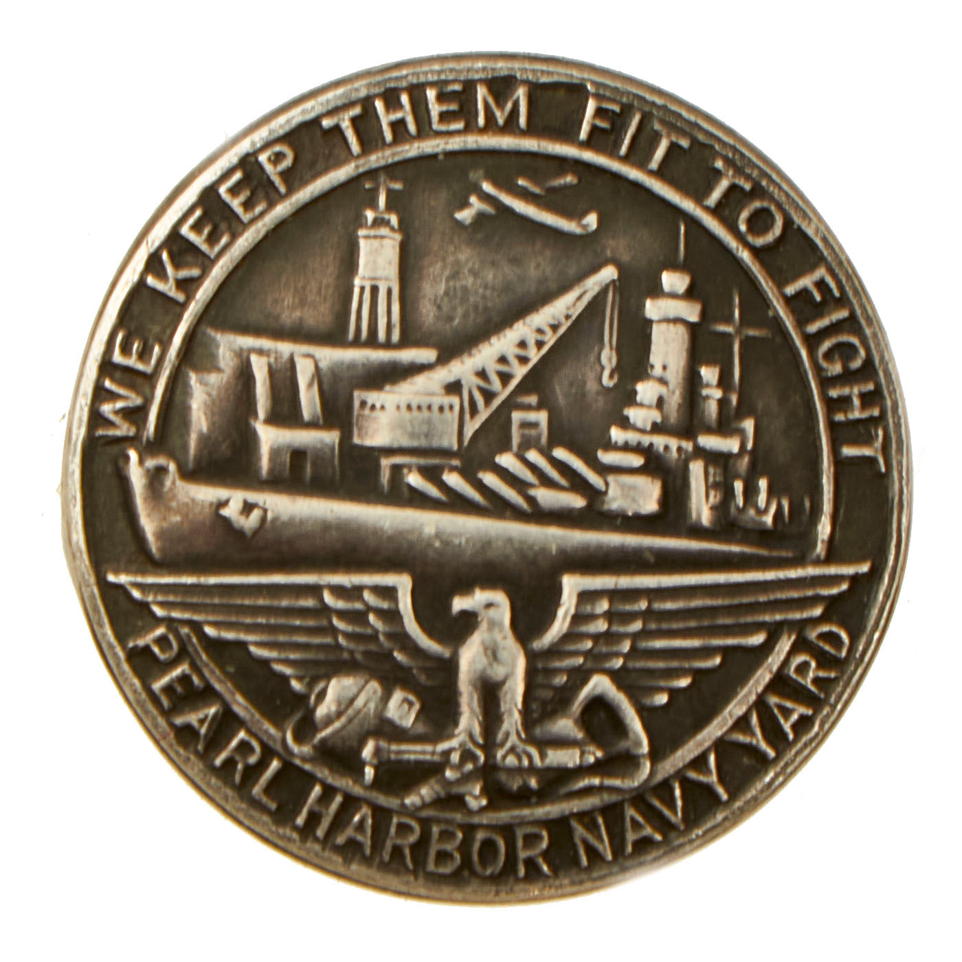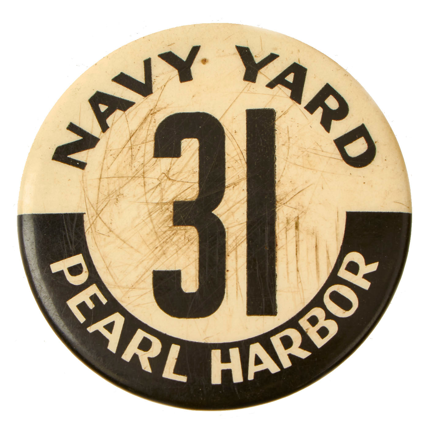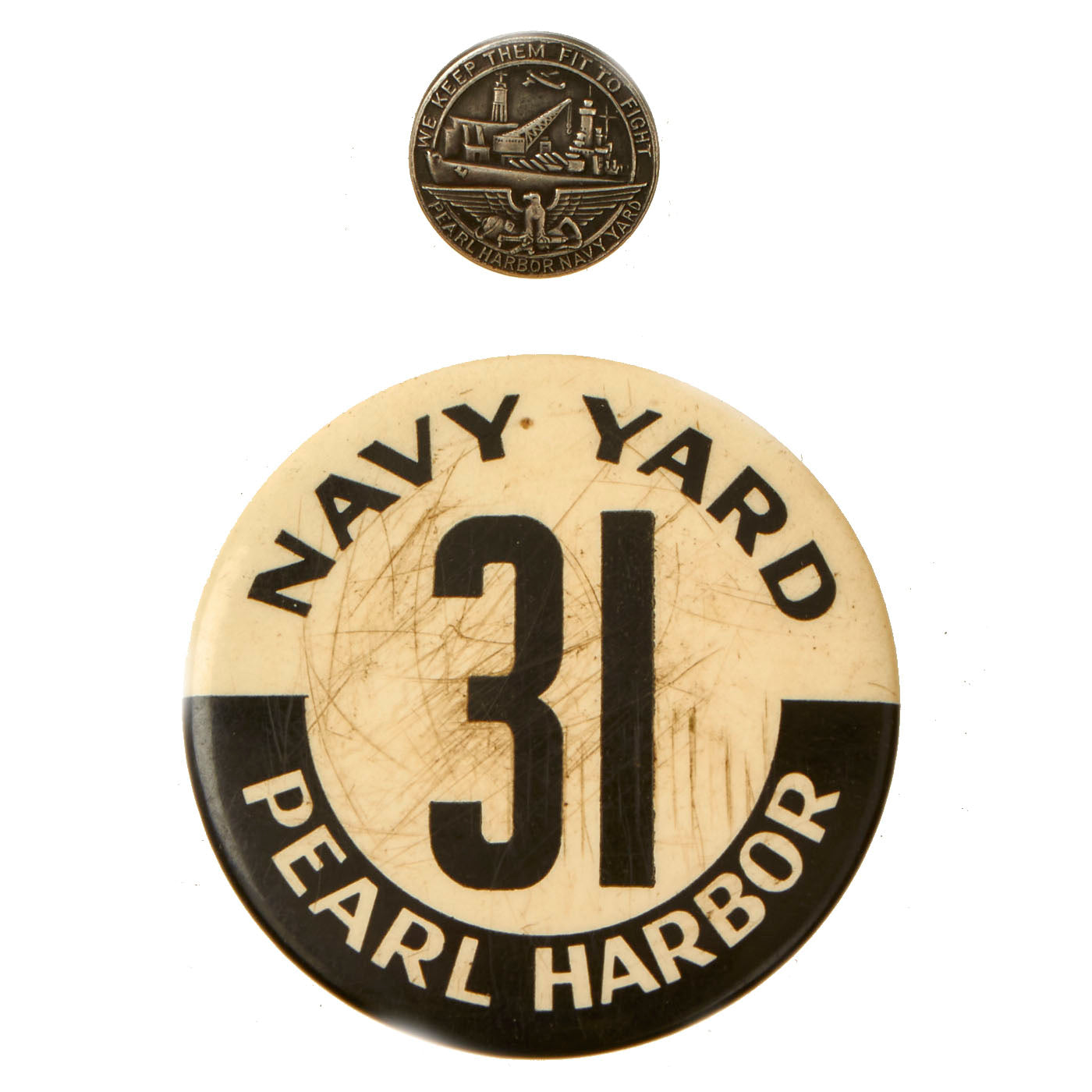 This lot includes a pair of lovely buttons from Pearl Harbor. One of the buttons measures approximately 2 ¼” in diameter and is rather simple is design. The face of the button is all white with a black “rocker” at the bottom and features the words NAVY YARD / 31 / PEARL HARBOR. The condition is excellent but there is some scratching present on the face of the button. The smaller ¾” diameter button is more or less a lapel button in appearance. This is actually quite a beautiful little button featuring the cranes, ships and aircraft that would be present during a “drydock” rest and repair. The text at the to and bottom is simple and to the point in regards to their operations; WE KEEP THEM FIT TO FIGHT / PEARL HARBOR NAVY YARD. The condition on this one is excellent with a clear image and no signs of abuse.
