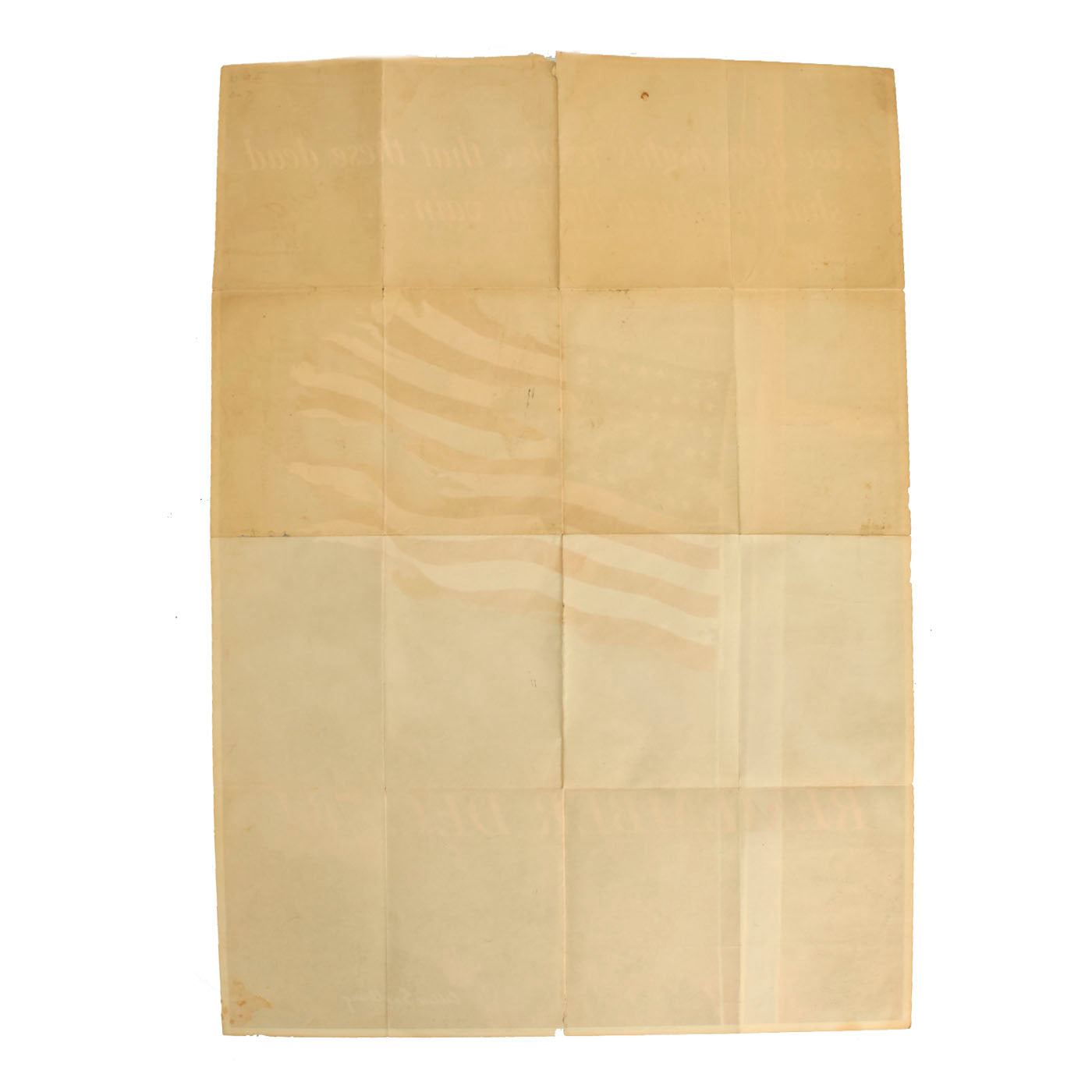 The 28” x 40” poster displays an image of a battle torn American Flag at what appears to be half mast with black smoke billowing on a blue sky. The quote featured at the top is from President Abraham Lincoln's Gettysburg Address. The quote is as follows: