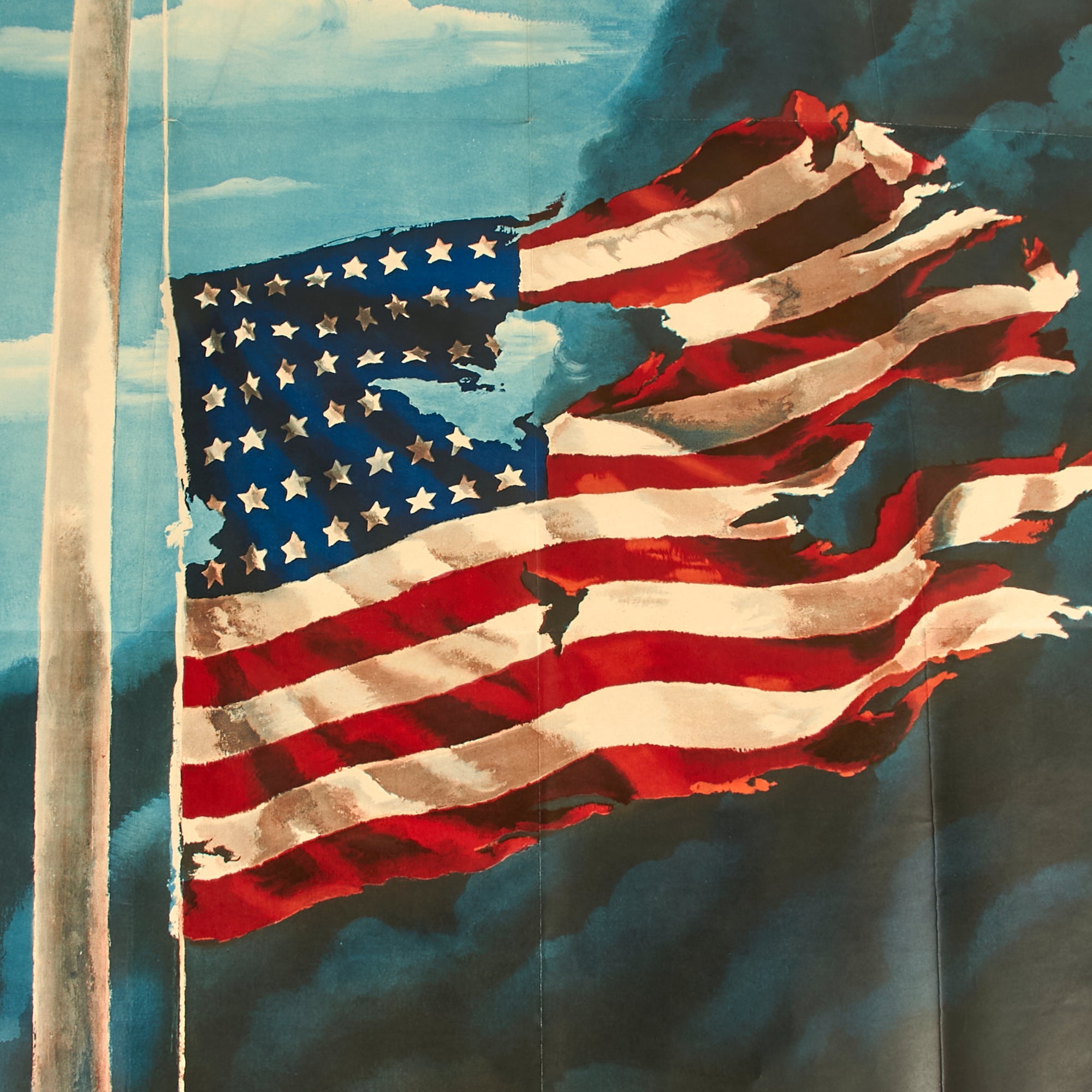 The 28” x 40” poster displays an image of a battle torn American Flag at what appears to be half mast with black smoke billowing on a blue sky. The quote featured at the top is from President Abraham Lincoln's Gettysburg Address. The quote is as follows: