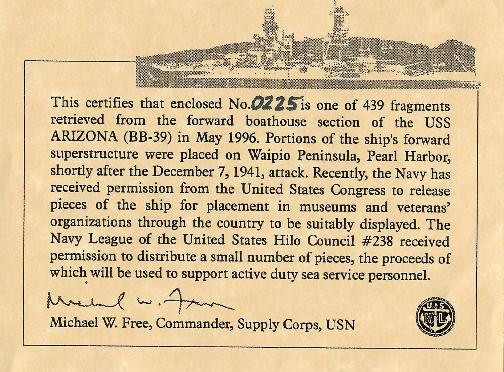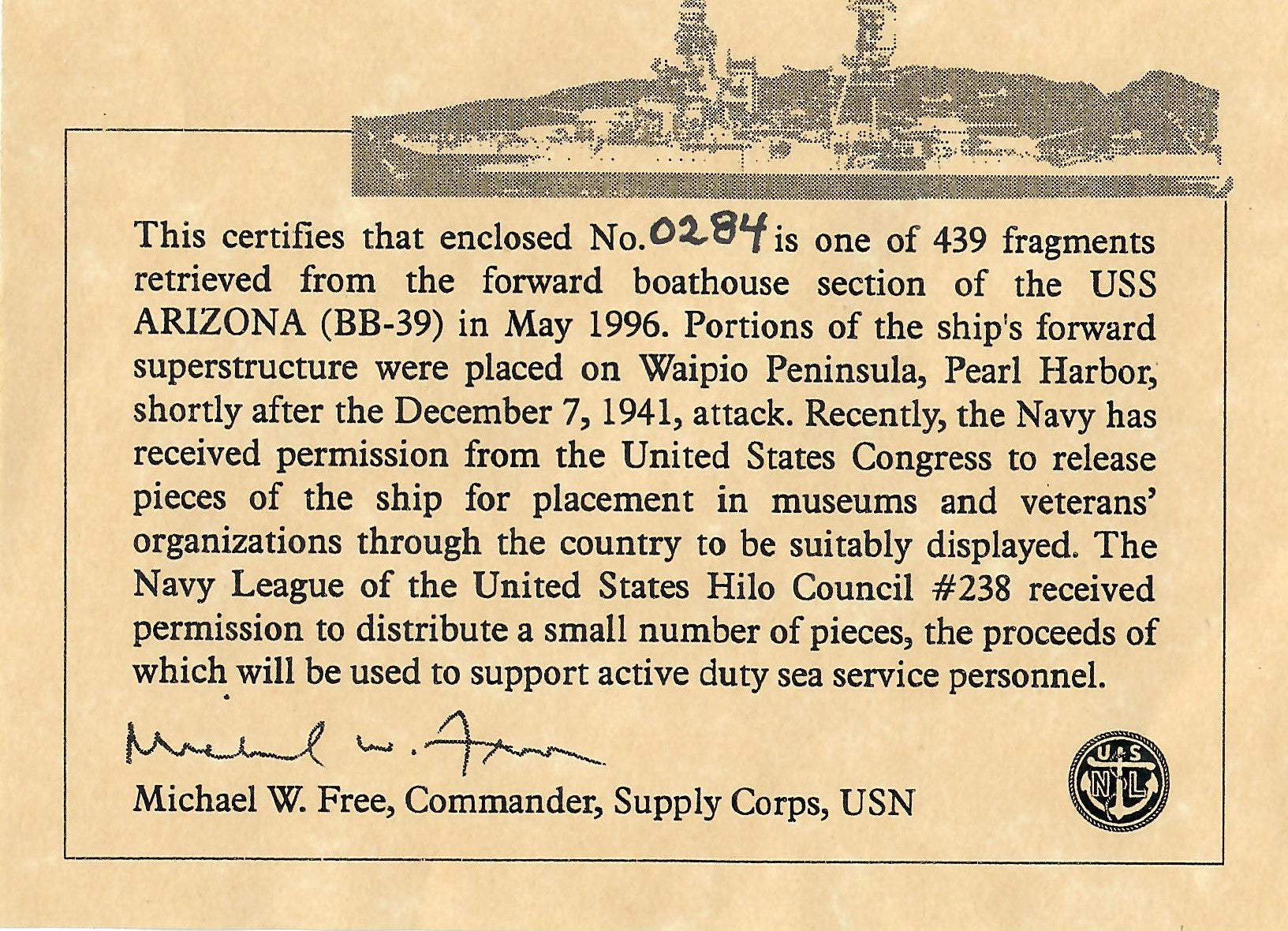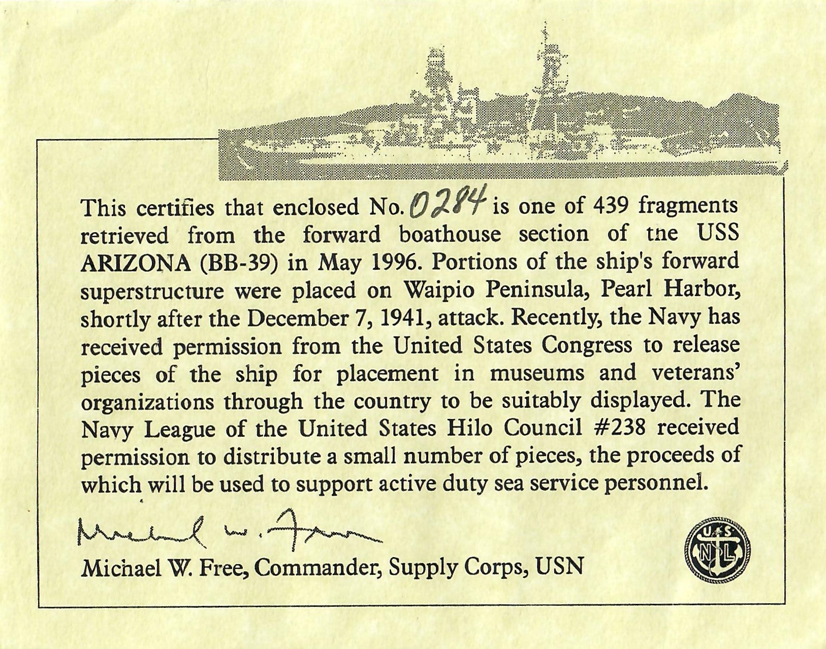 This certifies that enclosed No.#### is one of 439 fragments retrieved from the forward boathouse section of the USS ARIZONA (BB-39) in May 1996. Portions of the ship’s forward superstructure were placed on Waipio Peninsula, Pearl Harbor, shortly after the December 7, 1941, attack. Recently, the Navy has received permission from the United States Congress to release pieces pieces of the ship for placement in museums and veterans’ organizations through the country to be suitably displayed. The Navy League of the United States Hilo Council #238 received permission to distribute a small number of pieces, the proceeds of which will be used to support active duty sea service personnel.