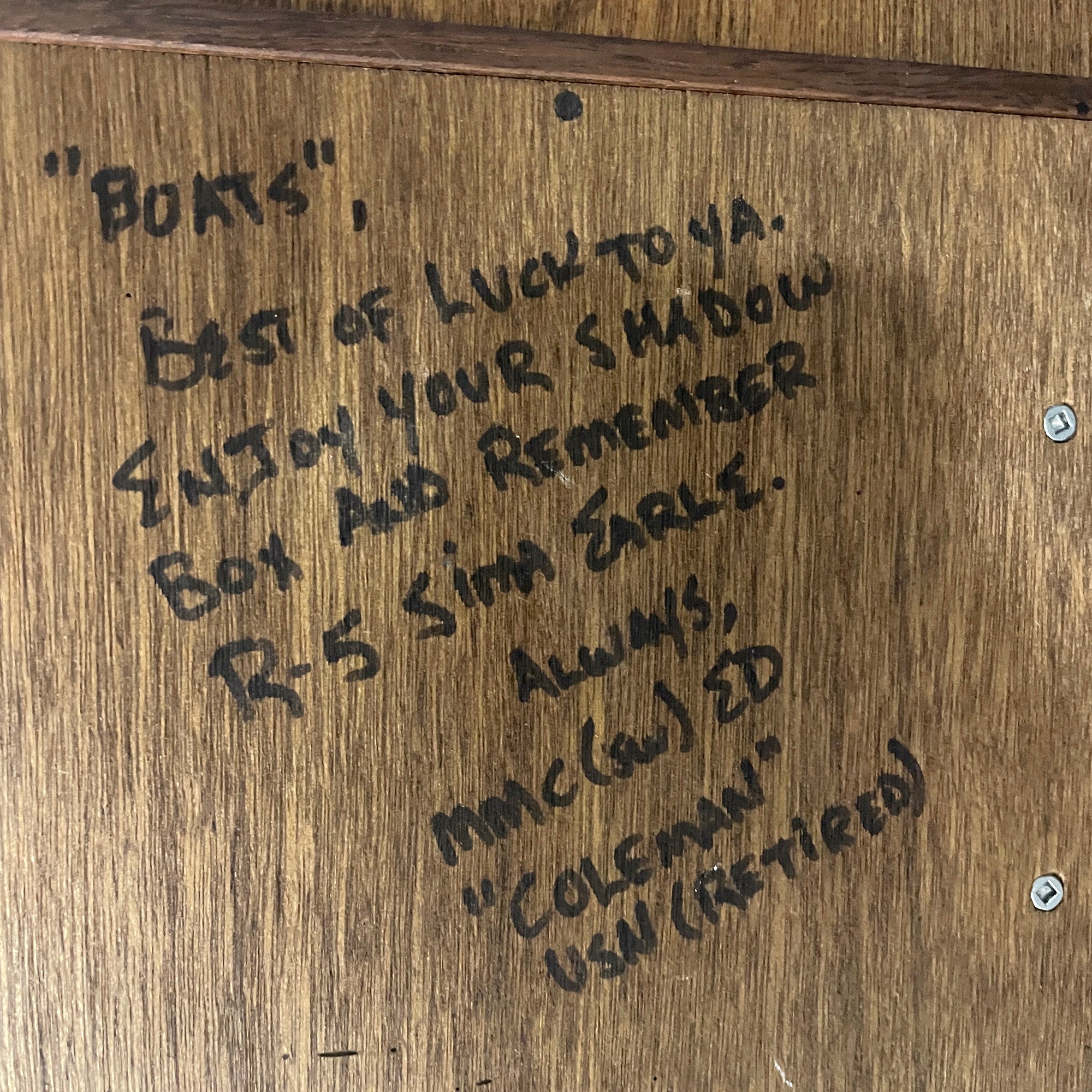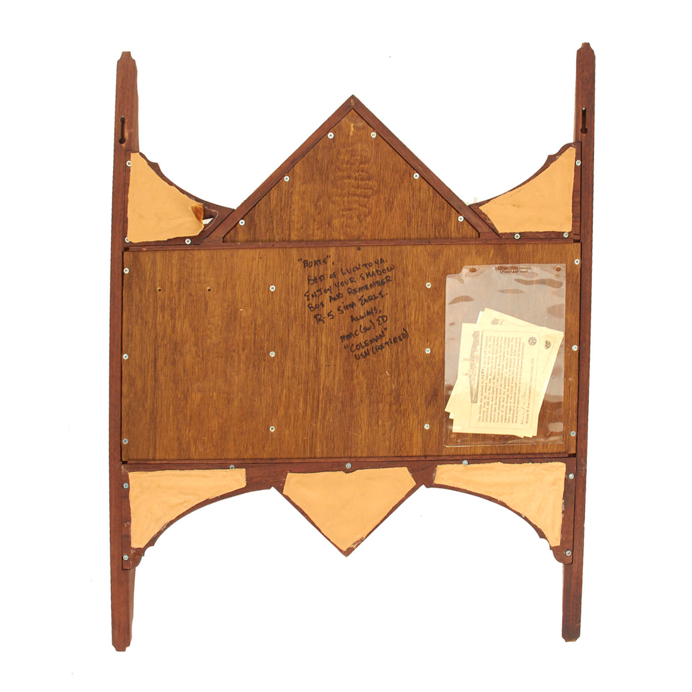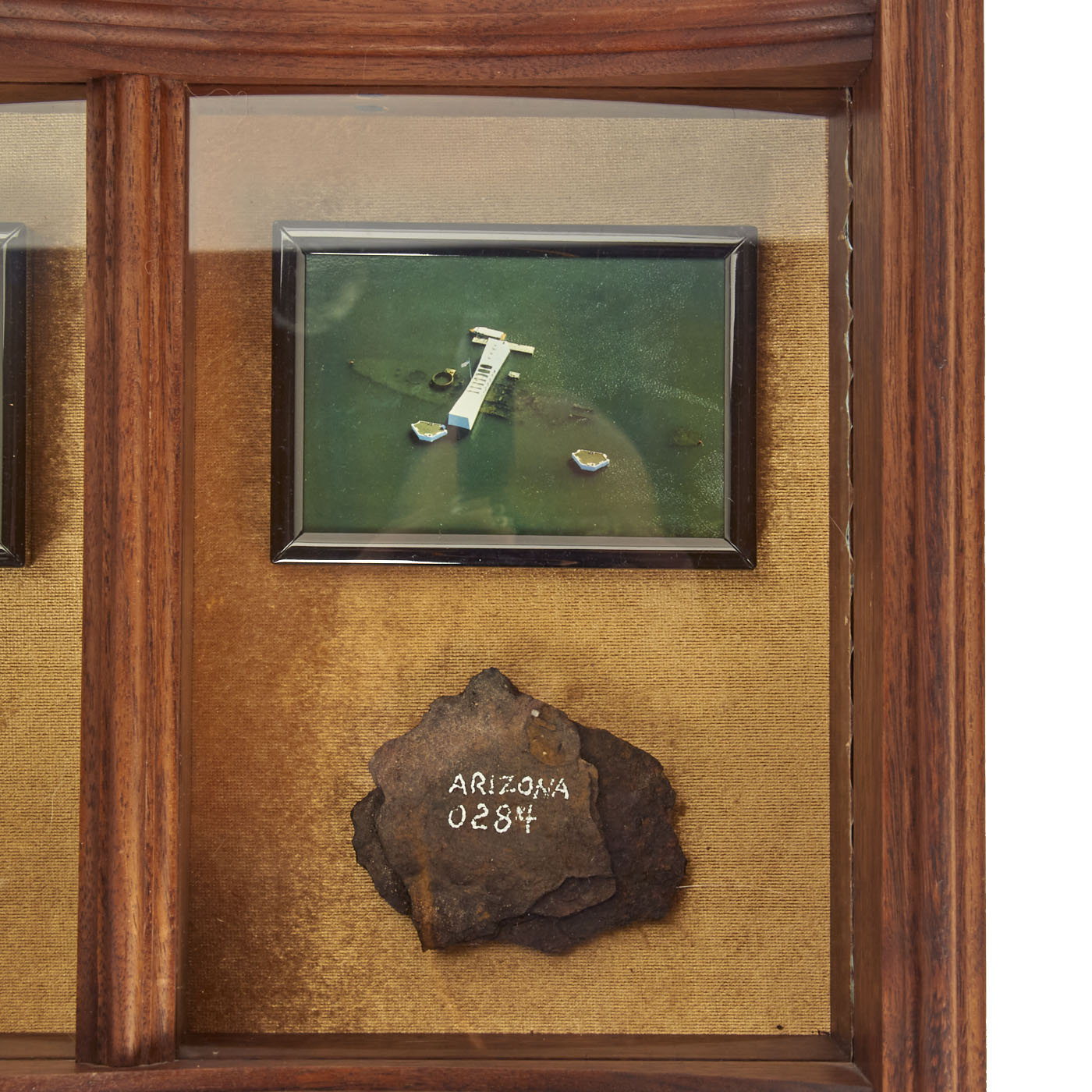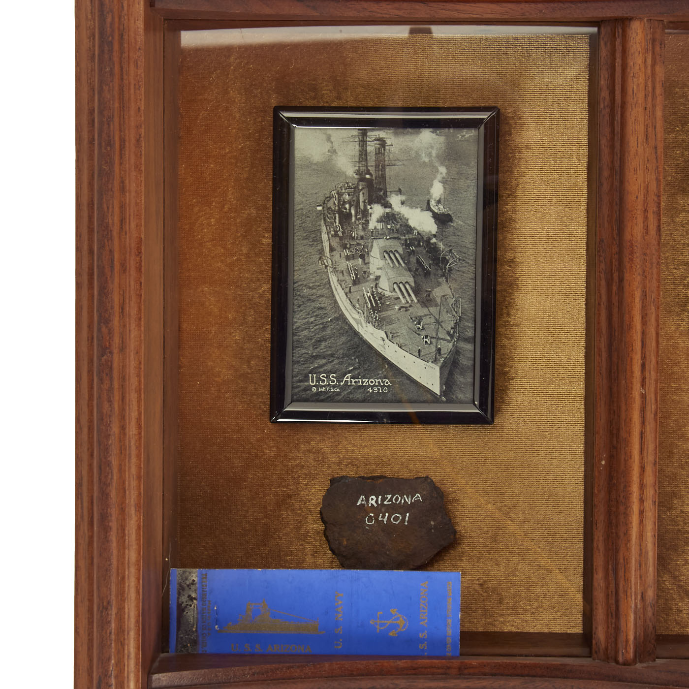 The display shadowbox was formerly part of a wardrobe of an officer on a US Naval ship. It is of Oak construction and extremely high quality. It was designed to be hung on the wall and measures 24" W x 32" H x 5" Deep. It was converted into an extremely unique and beautiful way to have had these superstructure fragments from the Arizona displayed. The fragments are each labeled with “Arizona” and their corresponding numbers (0225, 0284 and 0401). The third COA was a replacement by Commander Michael W. Free but the wrong number was written on the COA so now two of them have the number 0284.