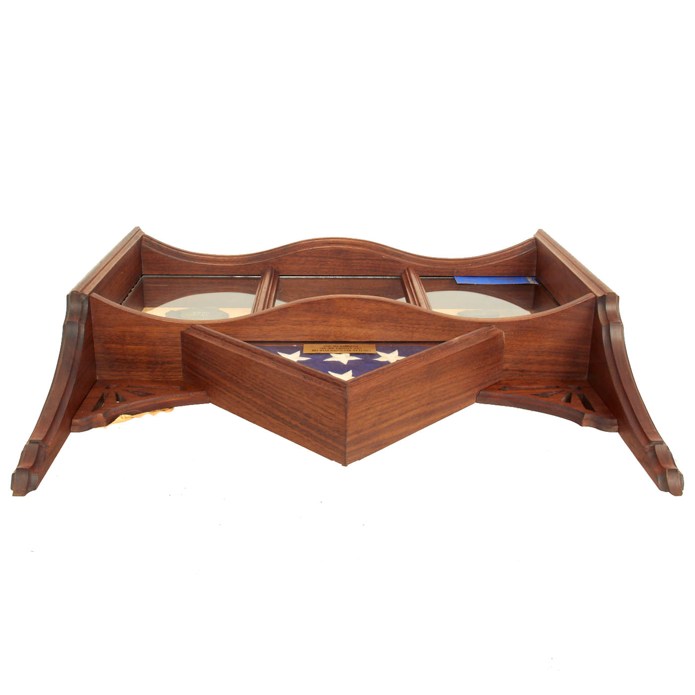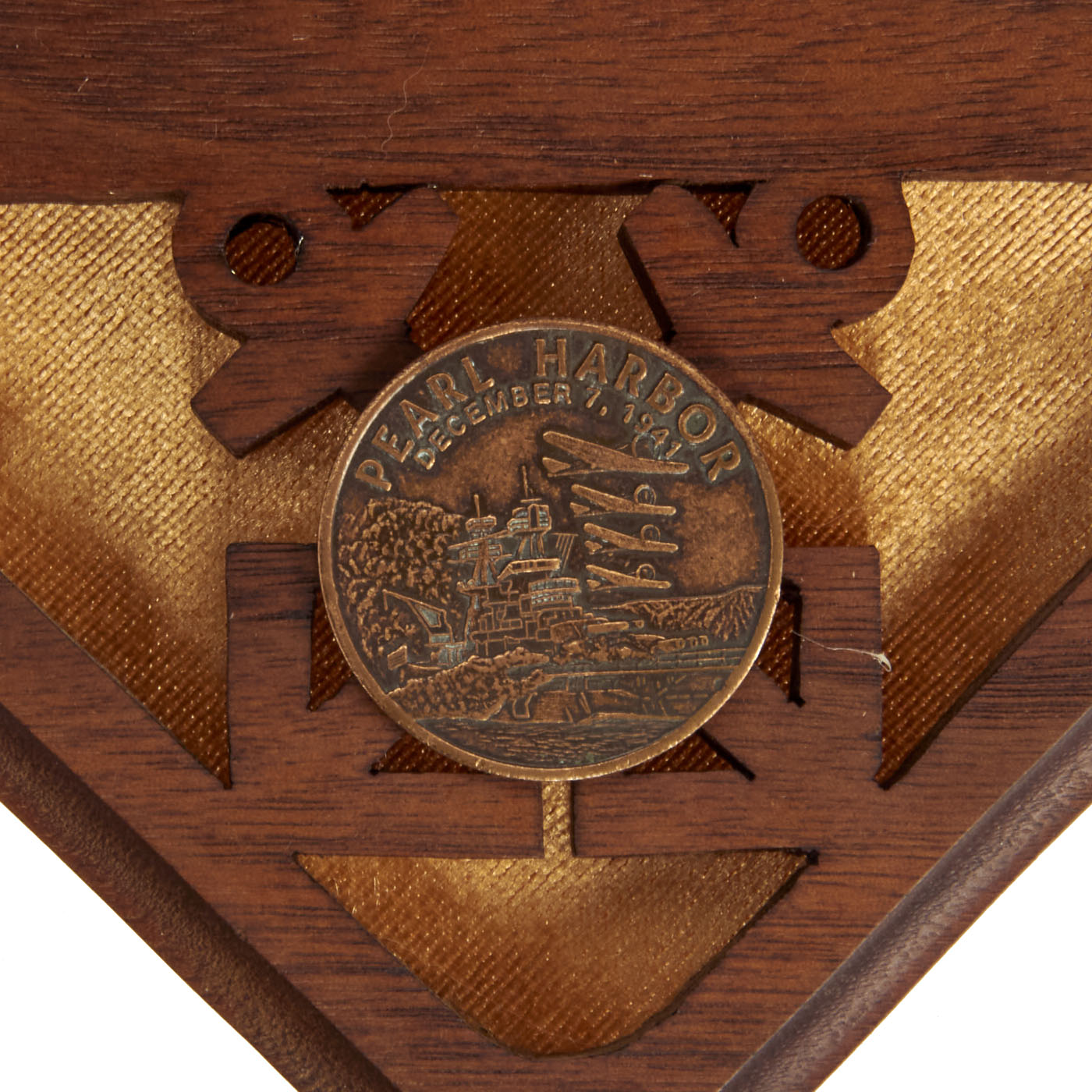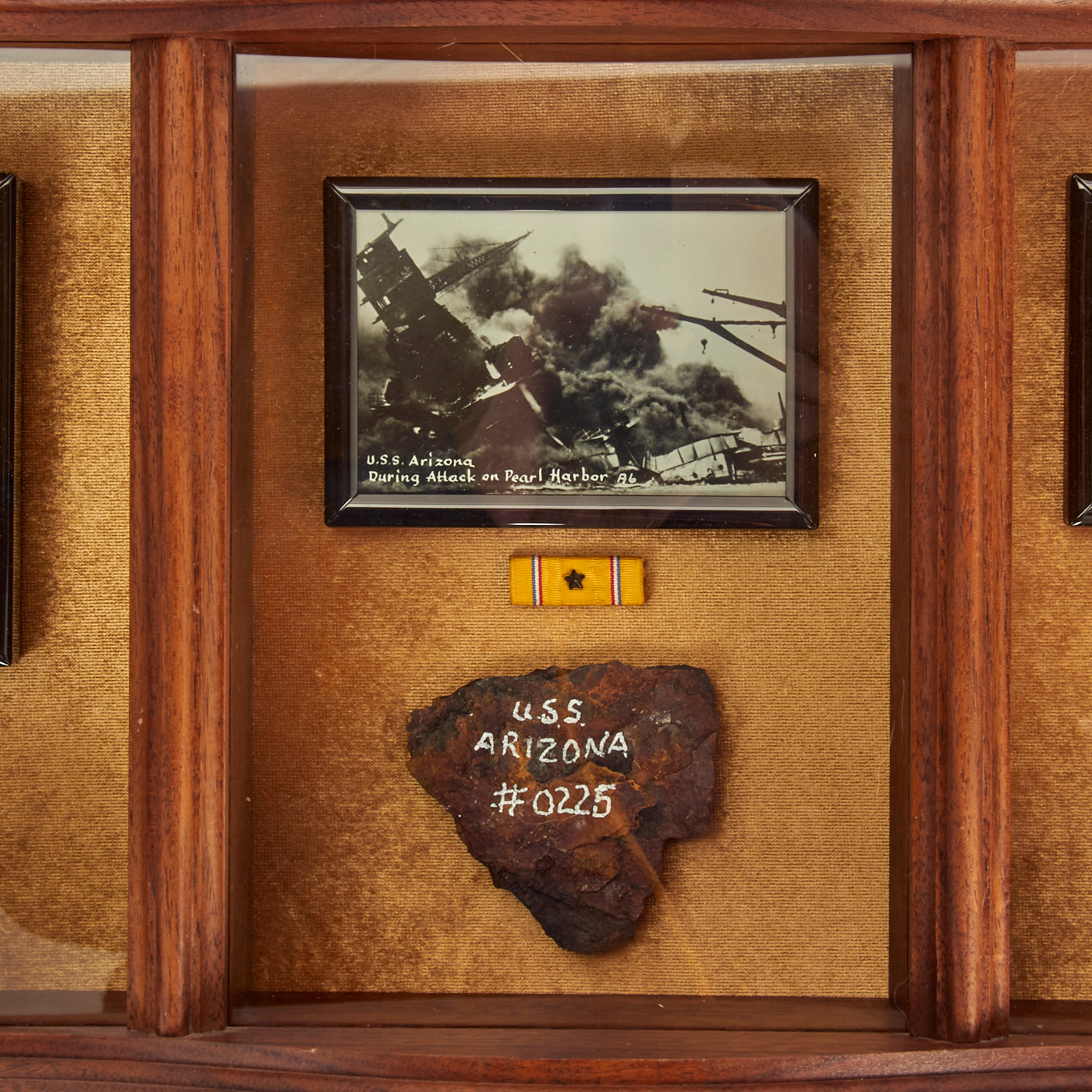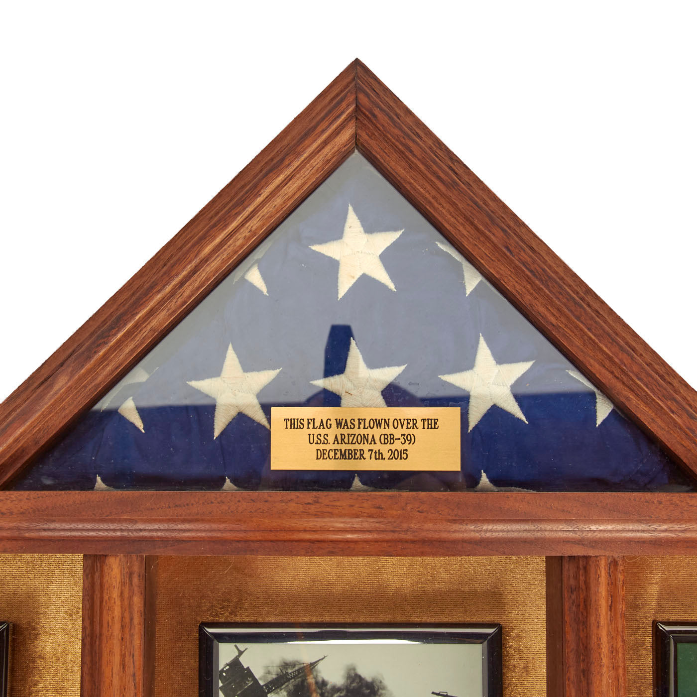 Encased inside of the shadowbox is the American flag that was flown over the USS Arizona Memorial on December 7, 2015. The USS Arizona Memorial, at Pearl Harbor in Honolulu, Hawaii, marks the resting place of 1,102 of the 1,177 sailors and Marines killed on USS Arizona during the attack on Pearl Harbor on December 7, 1941, and commemorates the events of that day. The attack on Pearl Harbor led to the United States' involvement in World War II.
