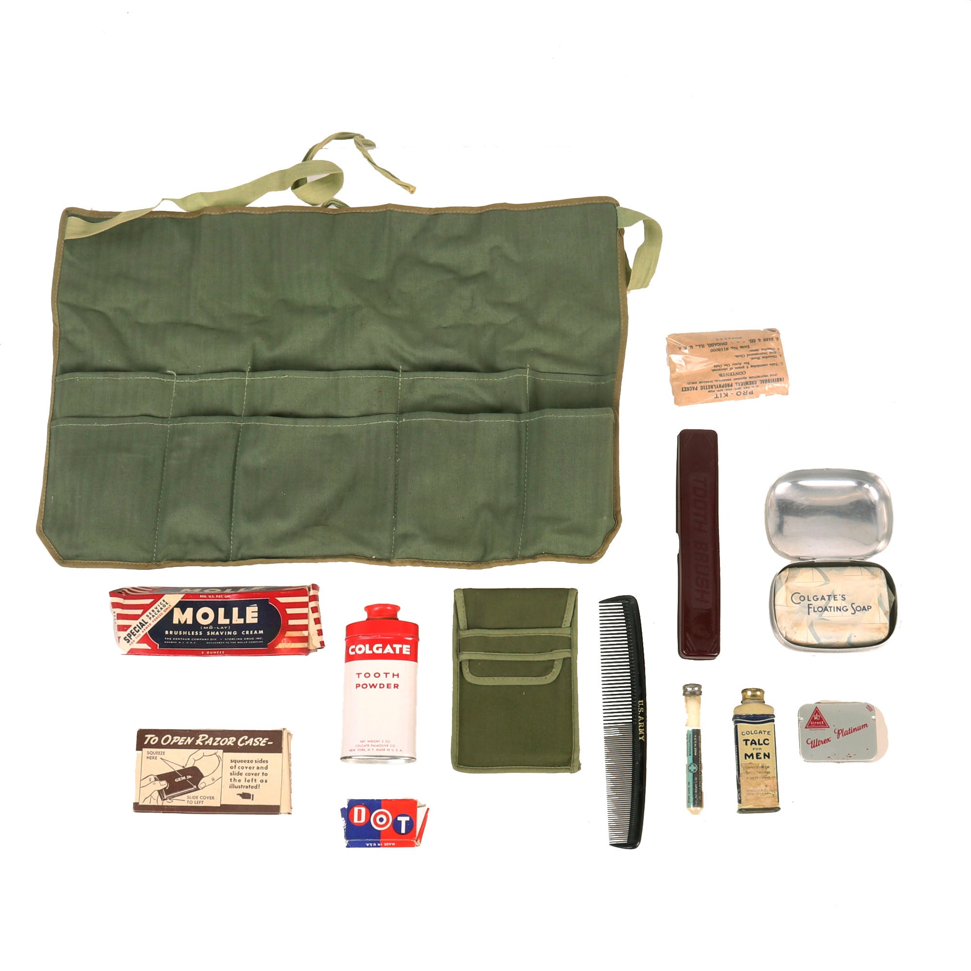This is a great lot of WWII personal effects commonly found in the kit of an American G.I. This lot has some great items that will definitely help spruce up your WWII G.I. display. This set comes in an original WWII soldier personal effects bag.