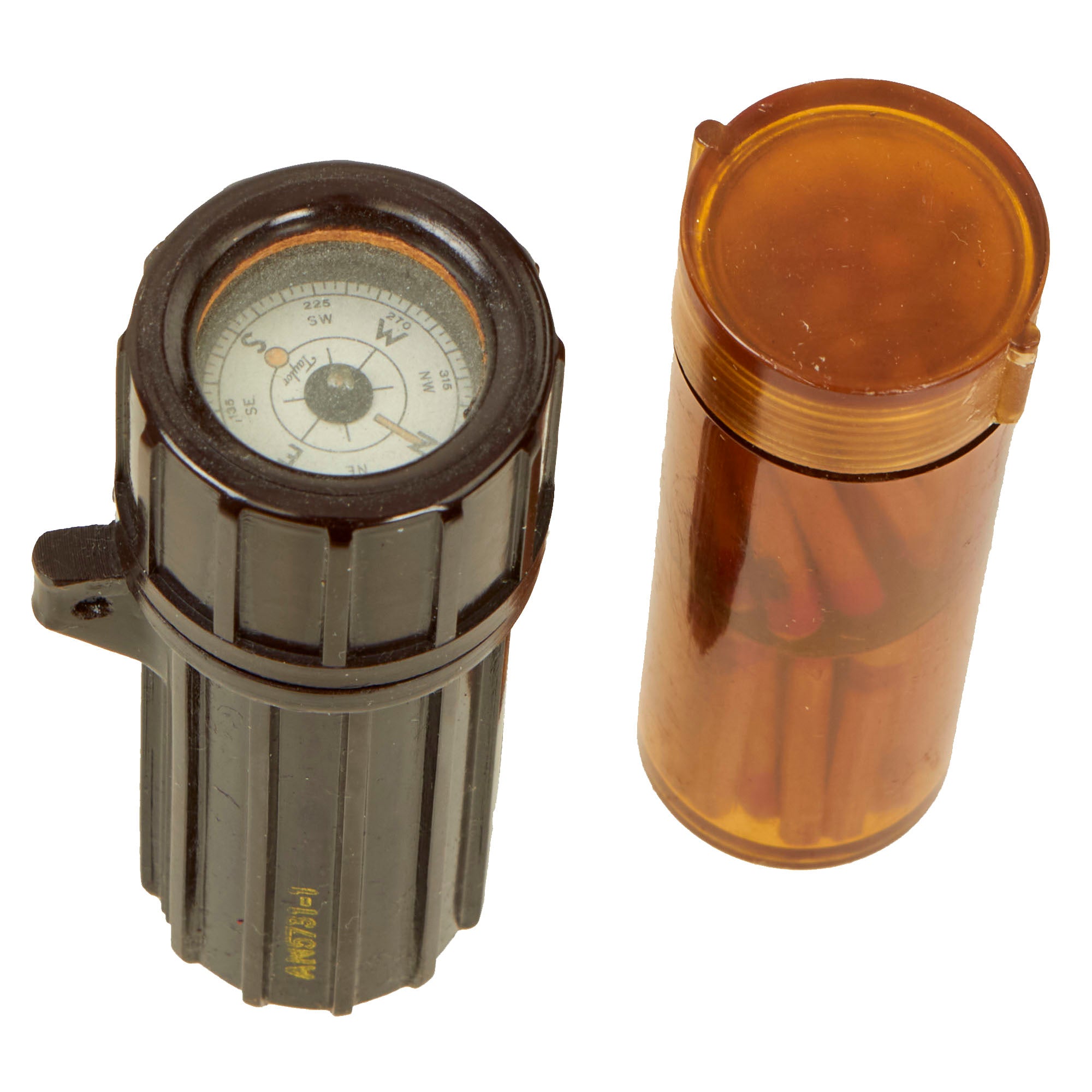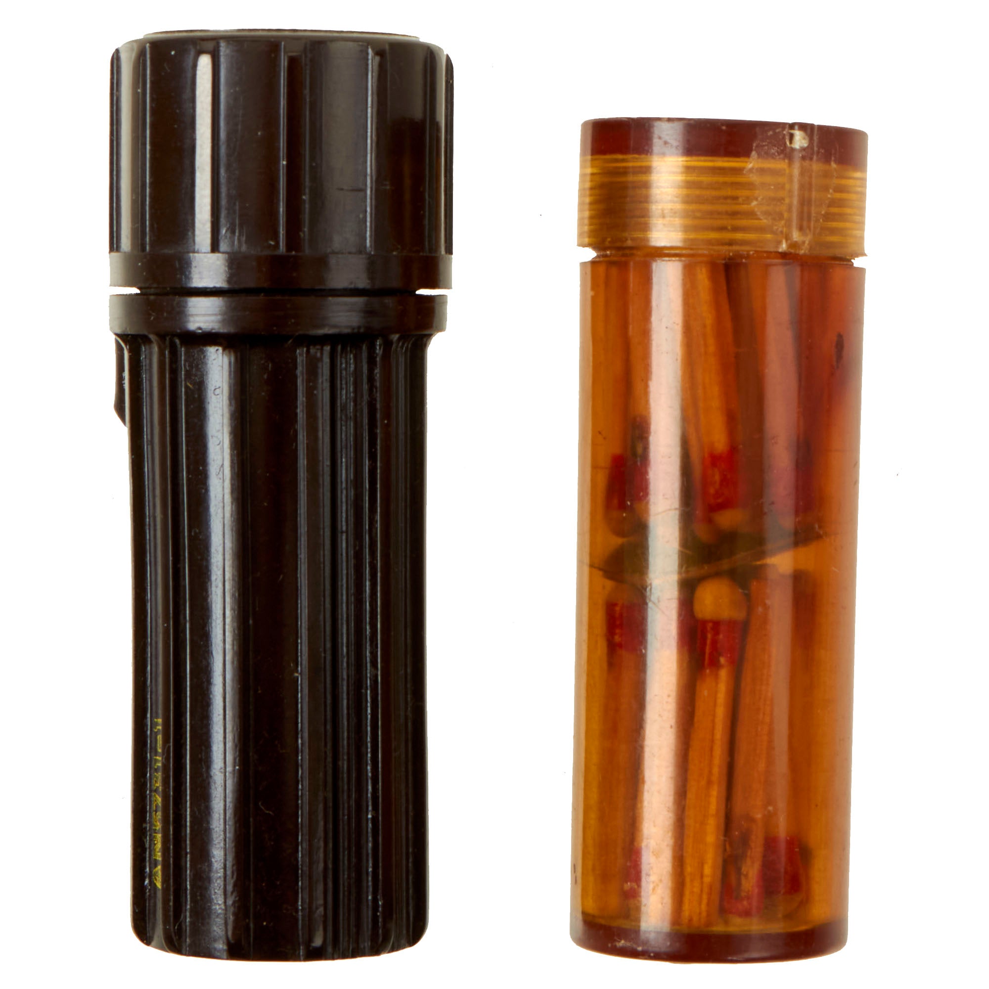 Black plastic match case/compass on lid. Matches still inside. Great set.