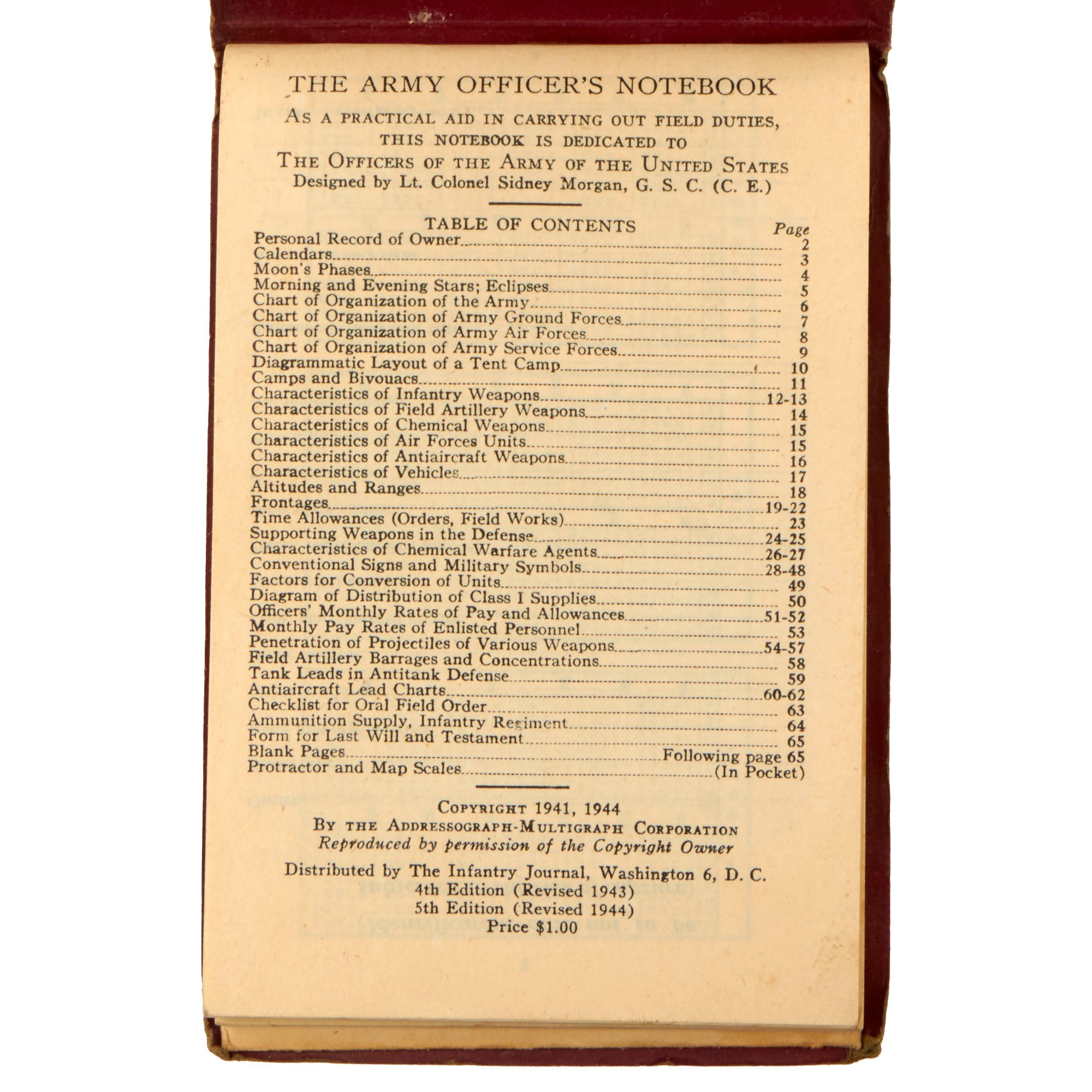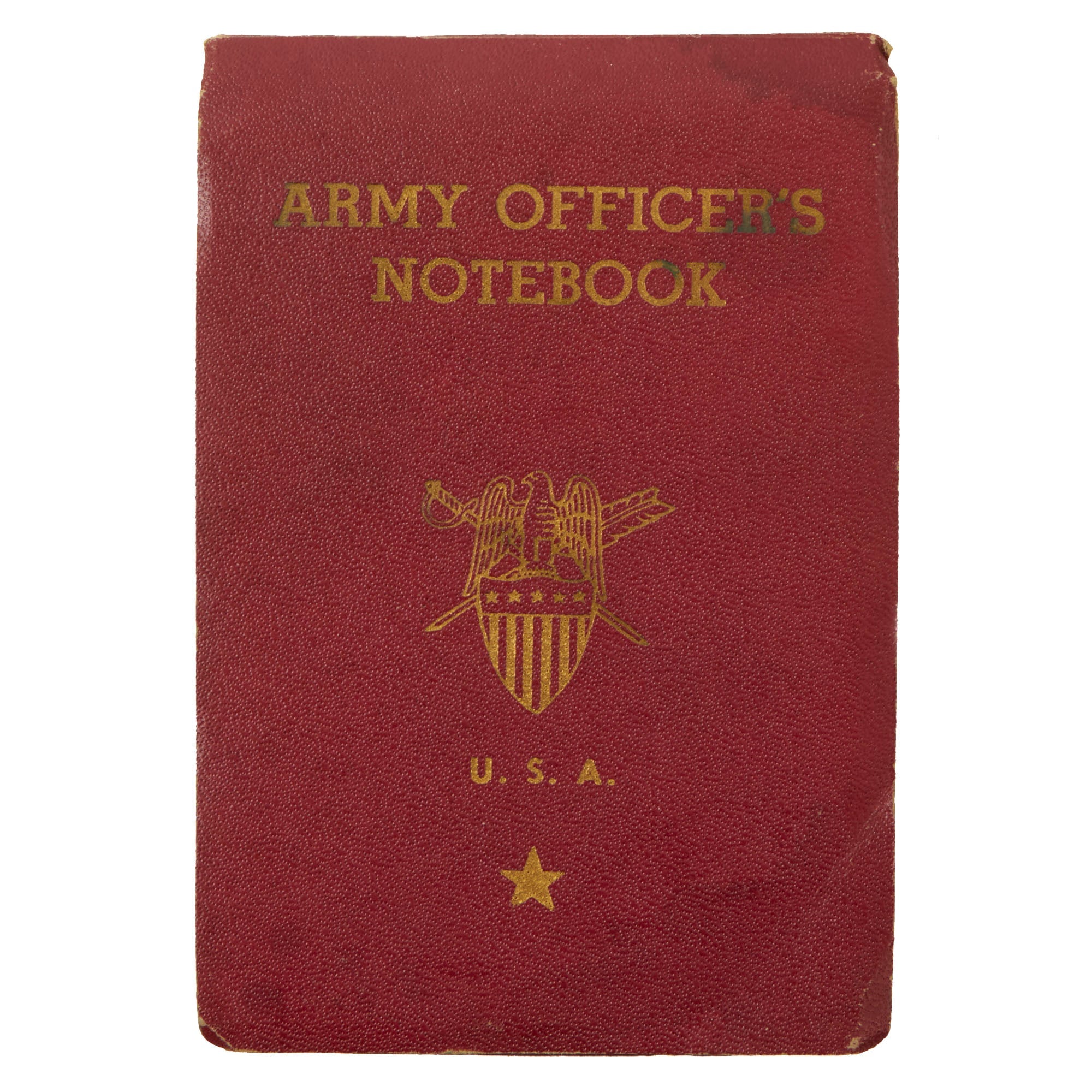 Army Officer’s notebook with writing on one page - mentions of what is needed to go overseas.