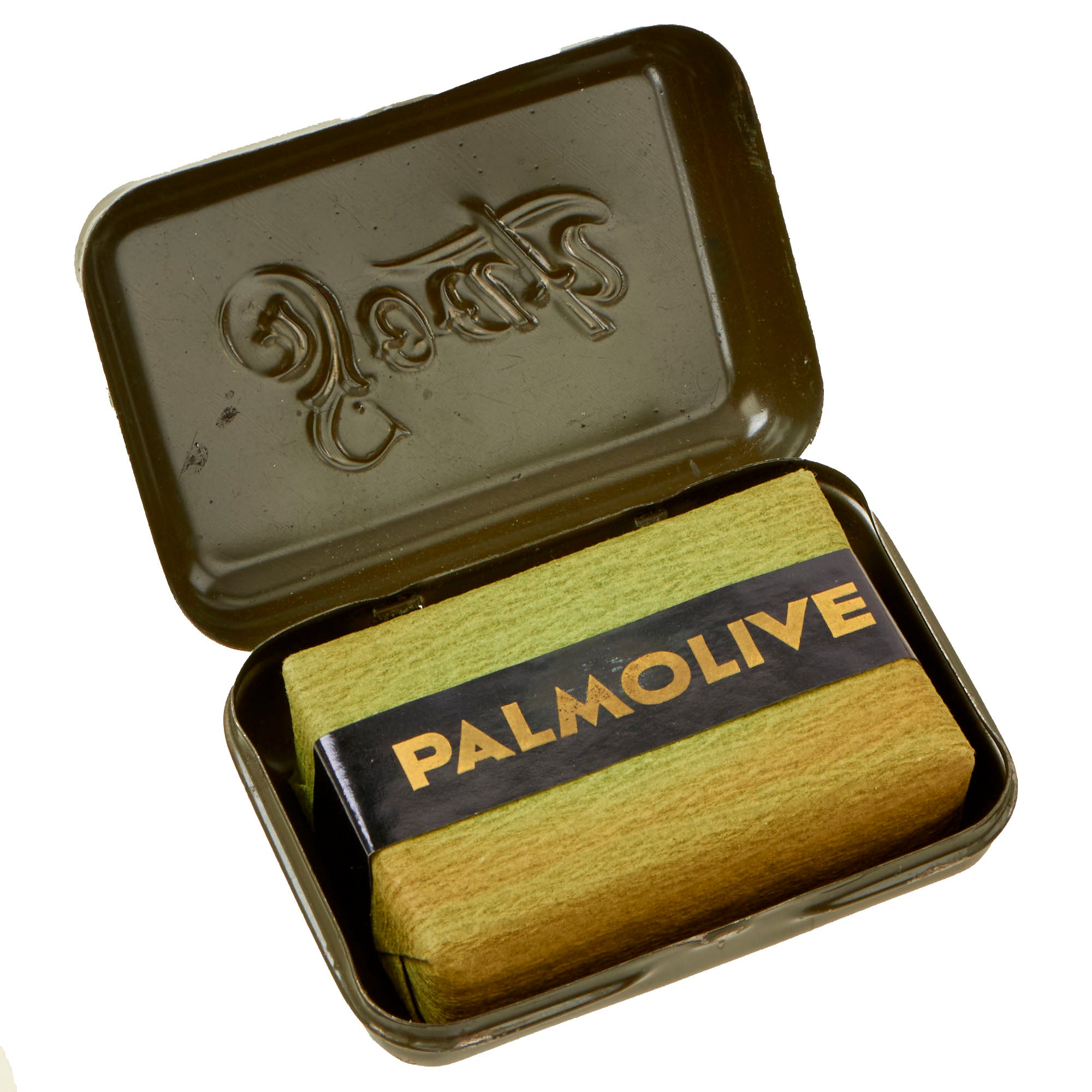 Sealed Palmolive Soap Bar with wrapping and sticker in Metal Soap tin. Great shape and never opened.