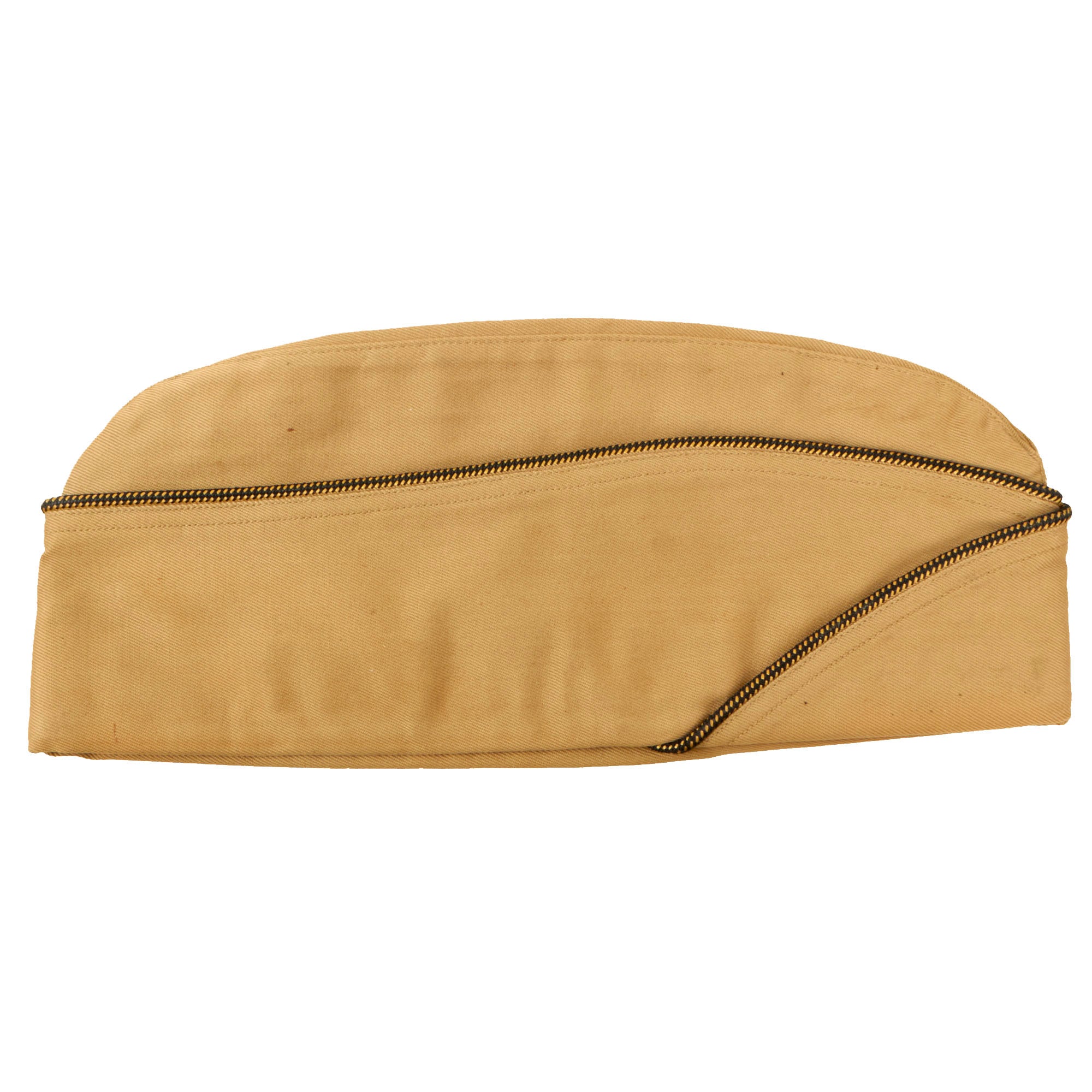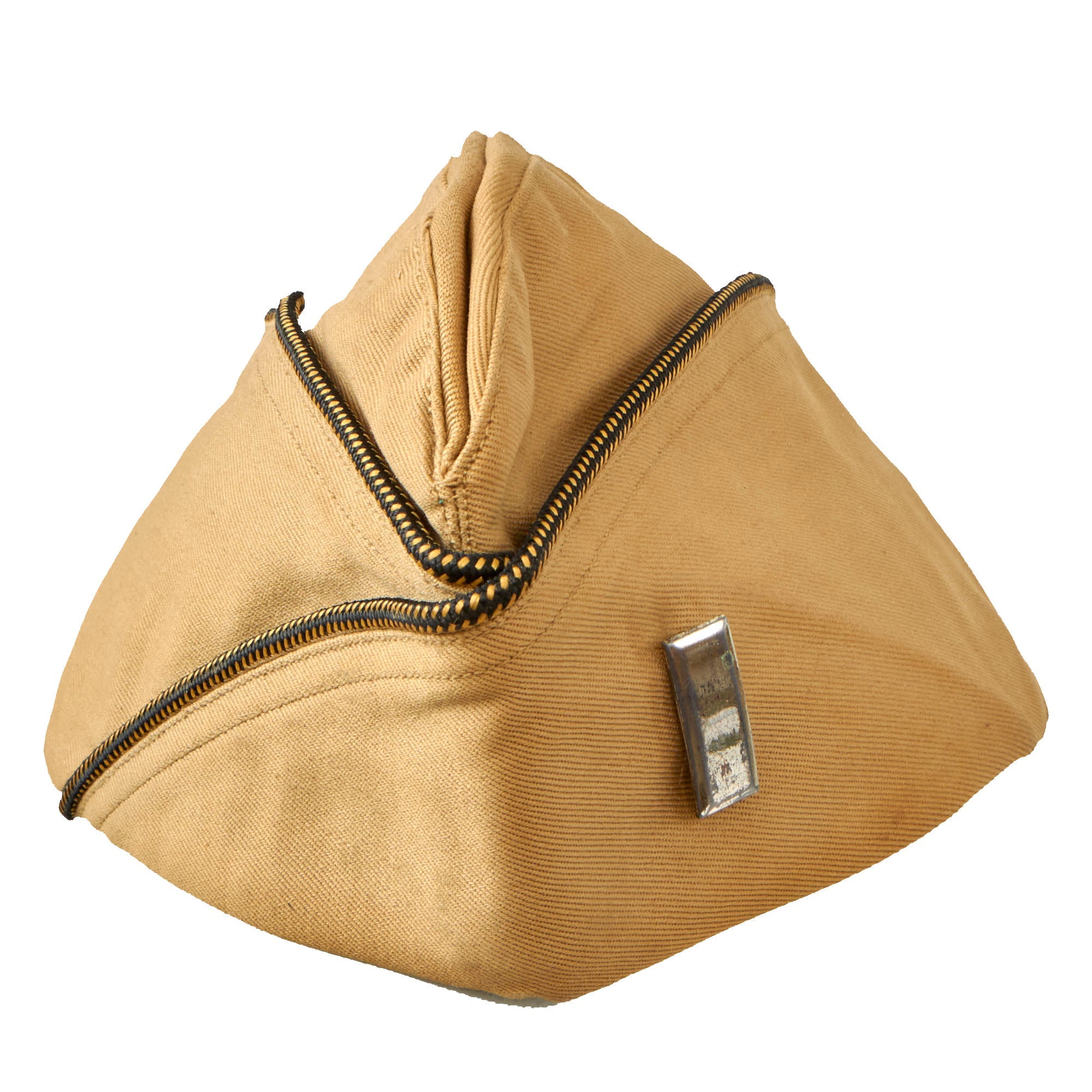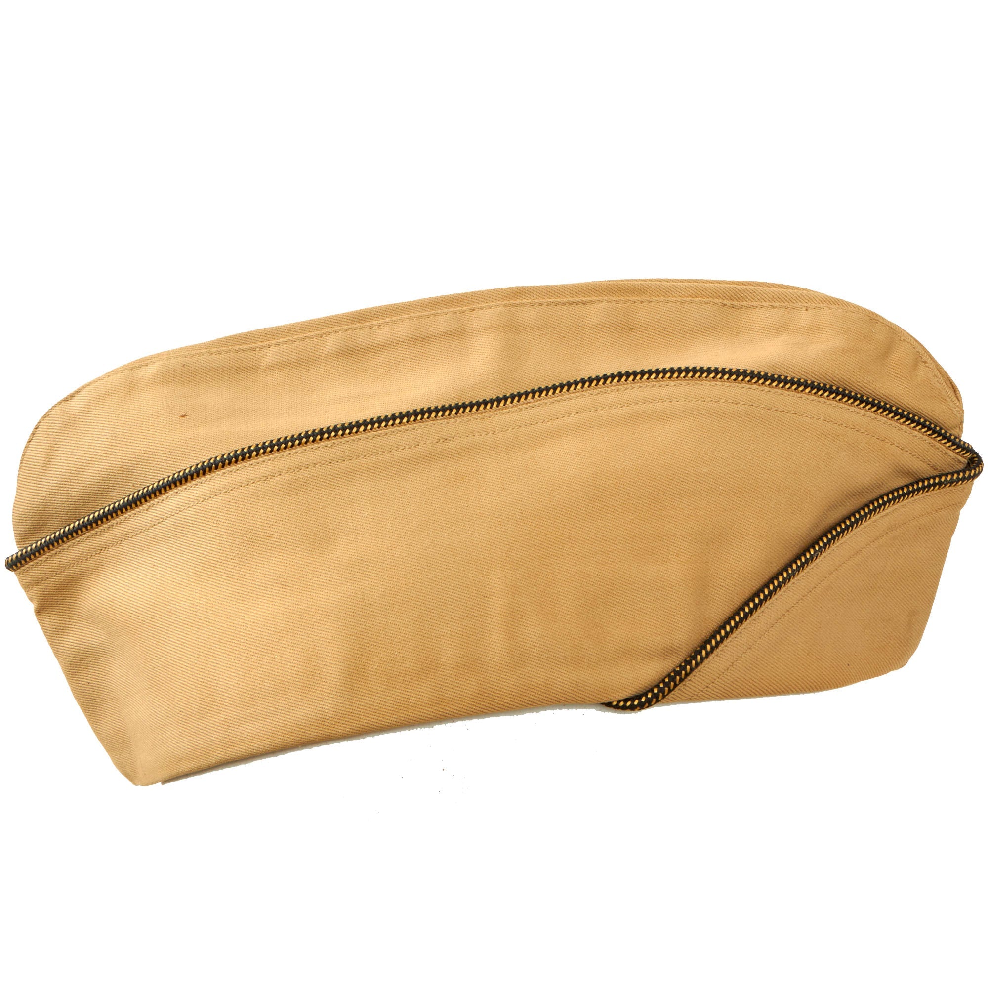 Officer’s tan overseas cap with black and gold piping, 1st Lieutenant bar. Size 7¼.