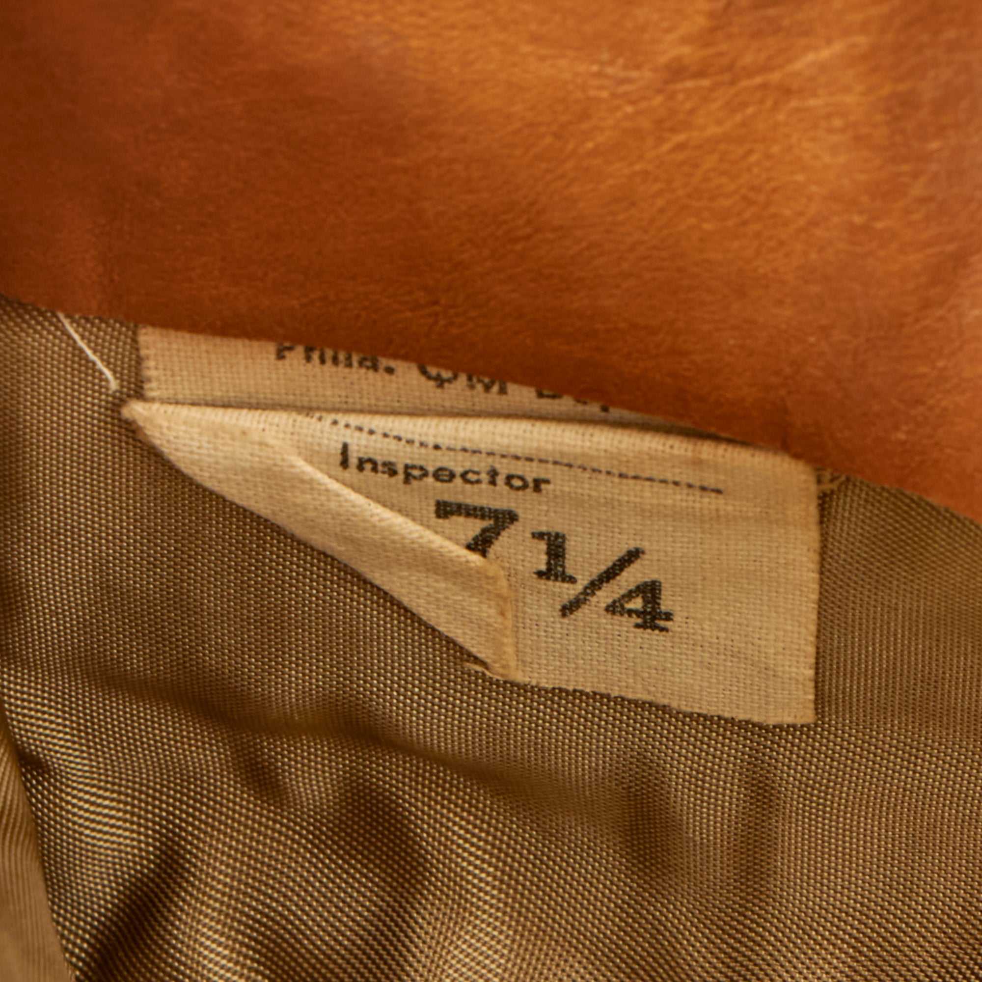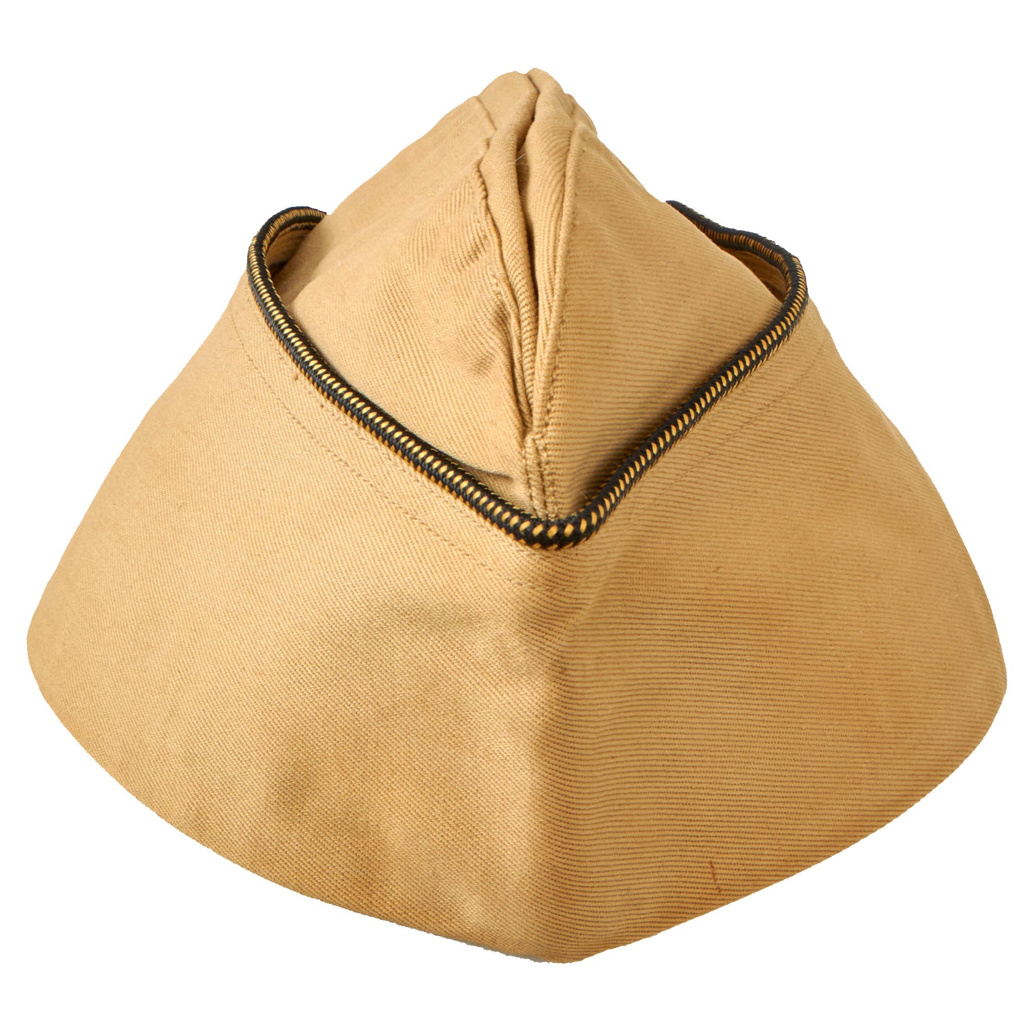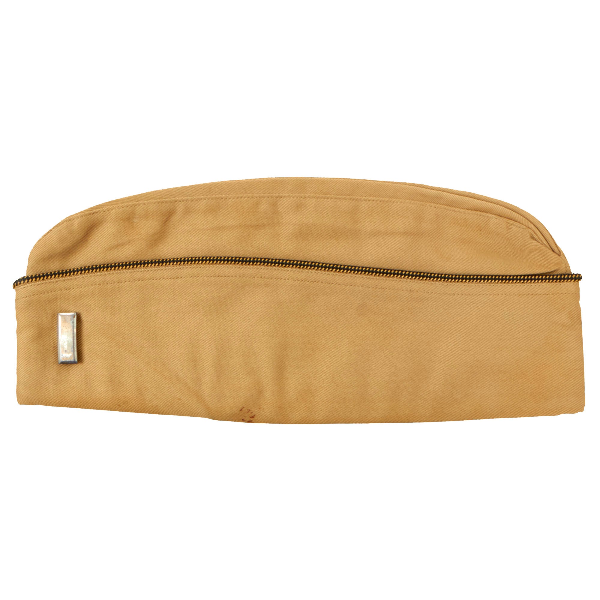 Officer’s tan overseas cap with black and gold piping, 1st Lieutenant bar. Size 7¼.