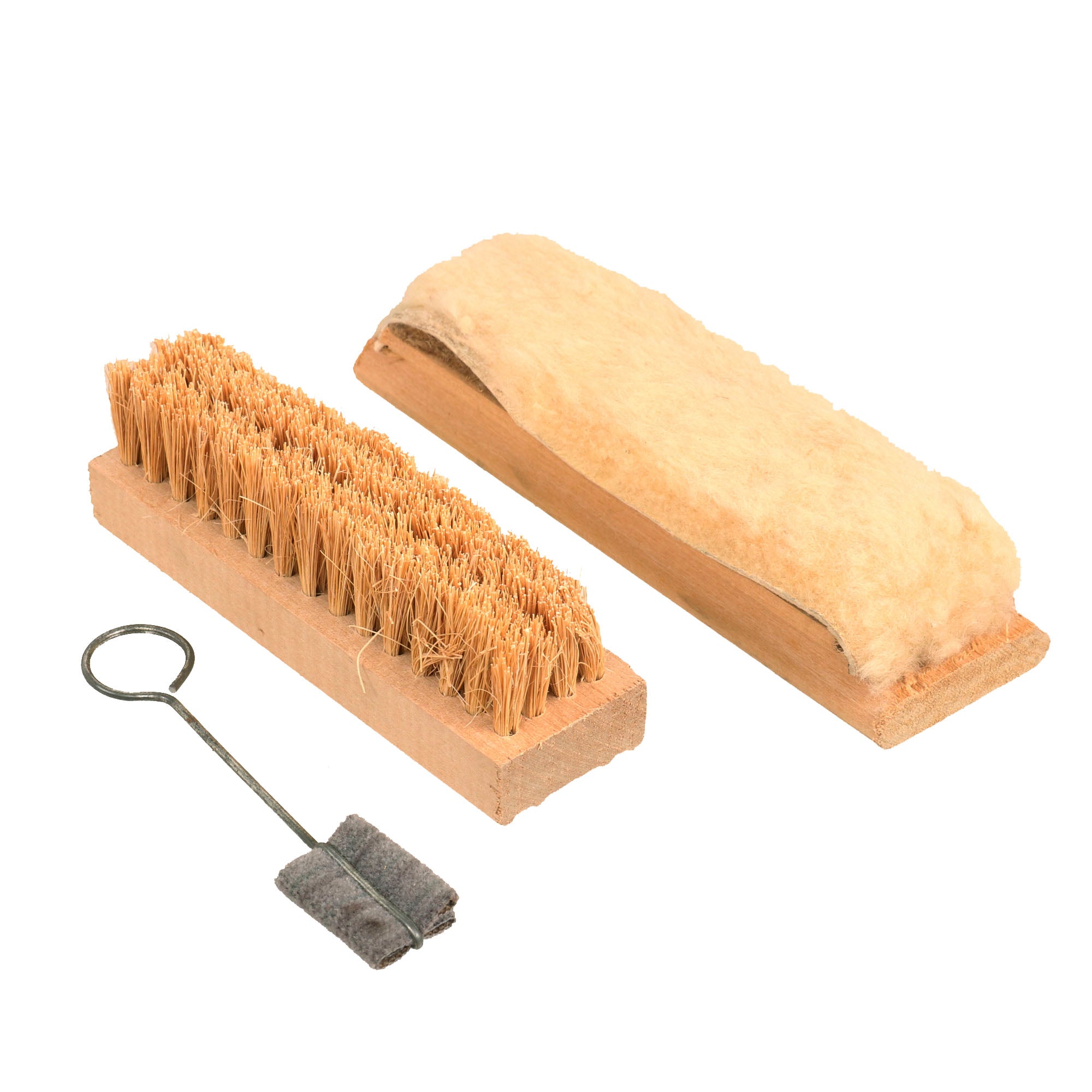 -Extra shoe shining supplies including two brushes, a rolled up sheet of cotton, extra shoelaces, and a small metal wire for cleaning.