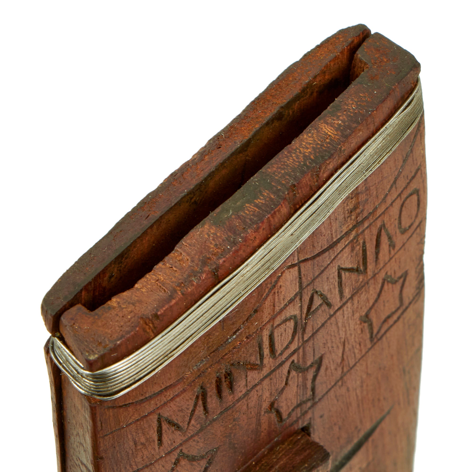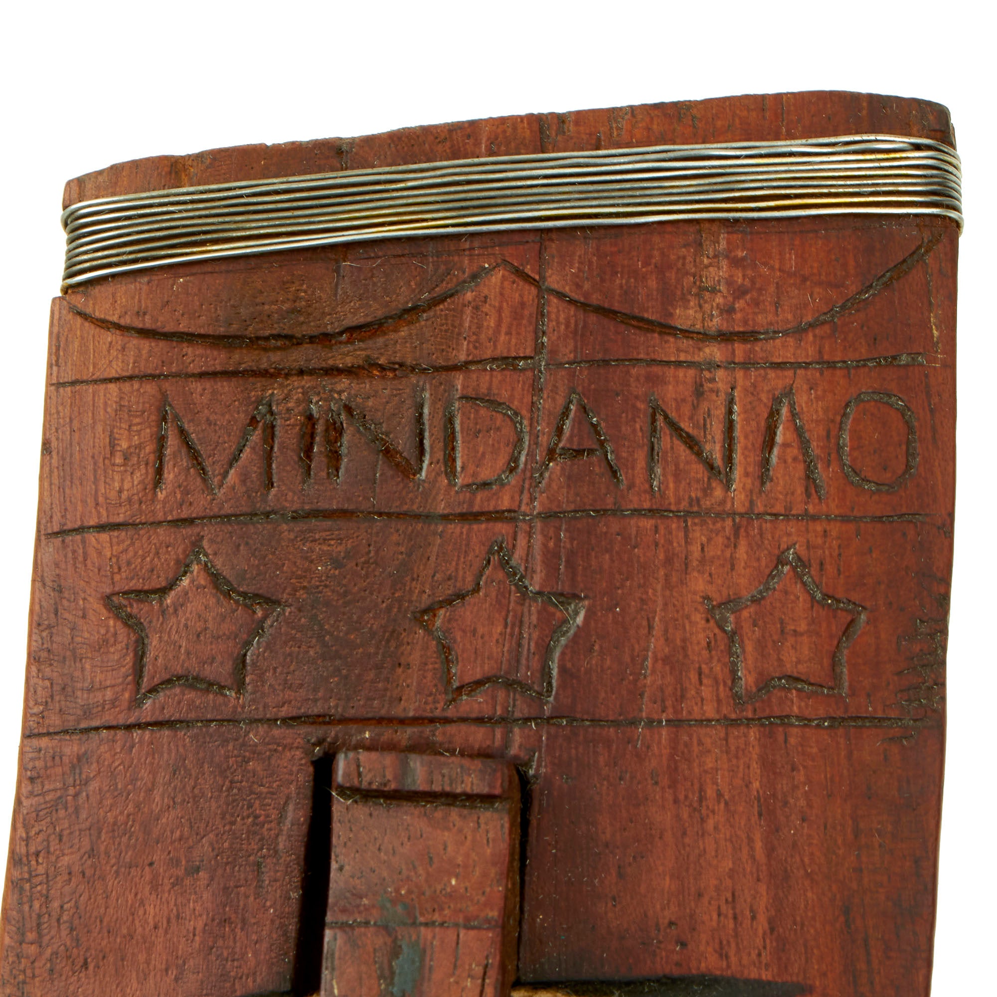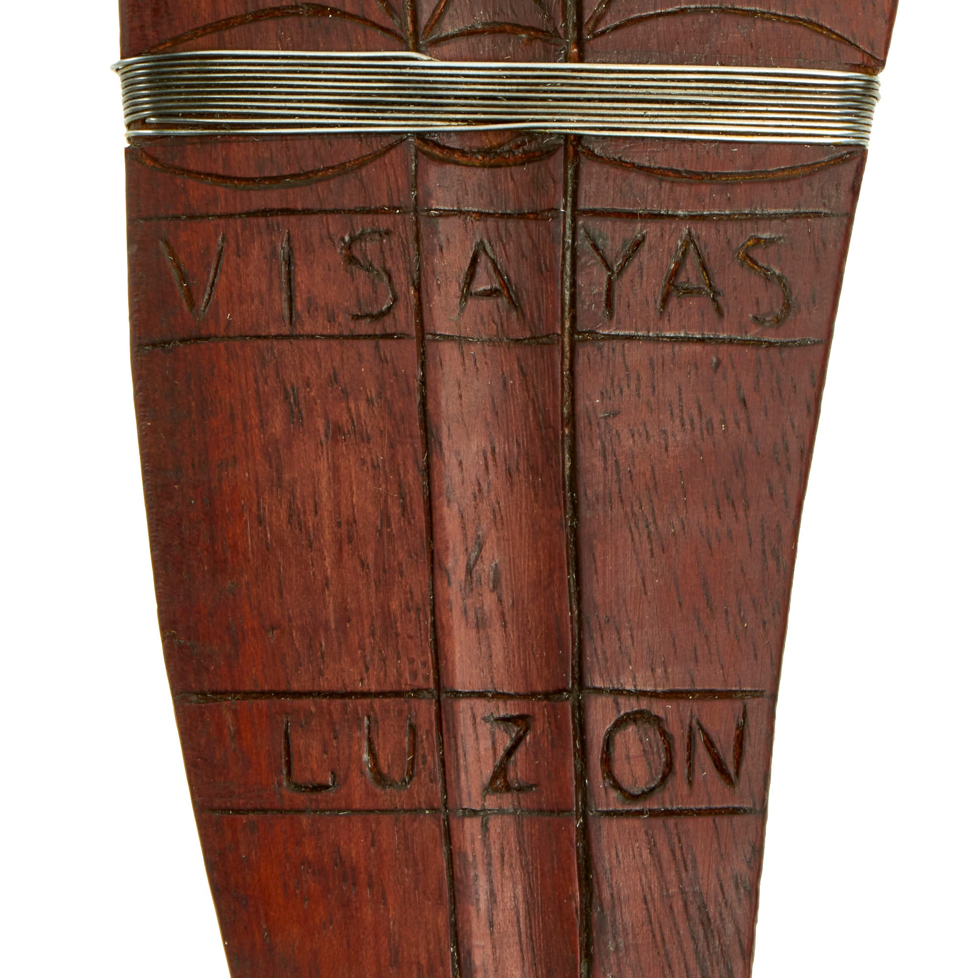 This is a rather large example of the “combat” bolo/bowie and it does show signs of use and still retains a nice edge. The carved wood handle has deep ridges carved into it and has the appearance of being “stacked” much like the leather washers on most fighting knives of the period. The scabbard is all wood and consists of 2 pieces of carved wood, once held together with wire. Carved into the scabbard ia MINDANAO, VISAYAS and LUZON.