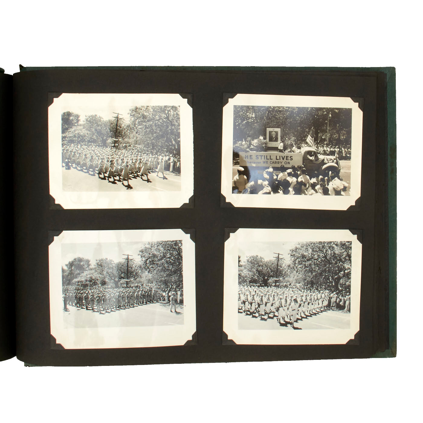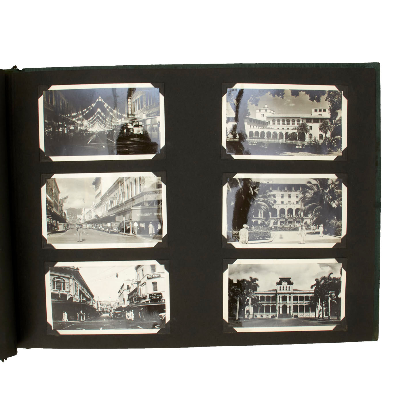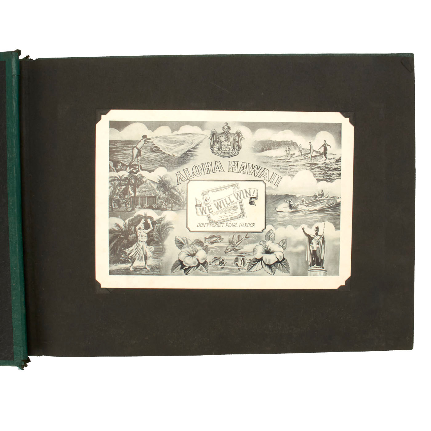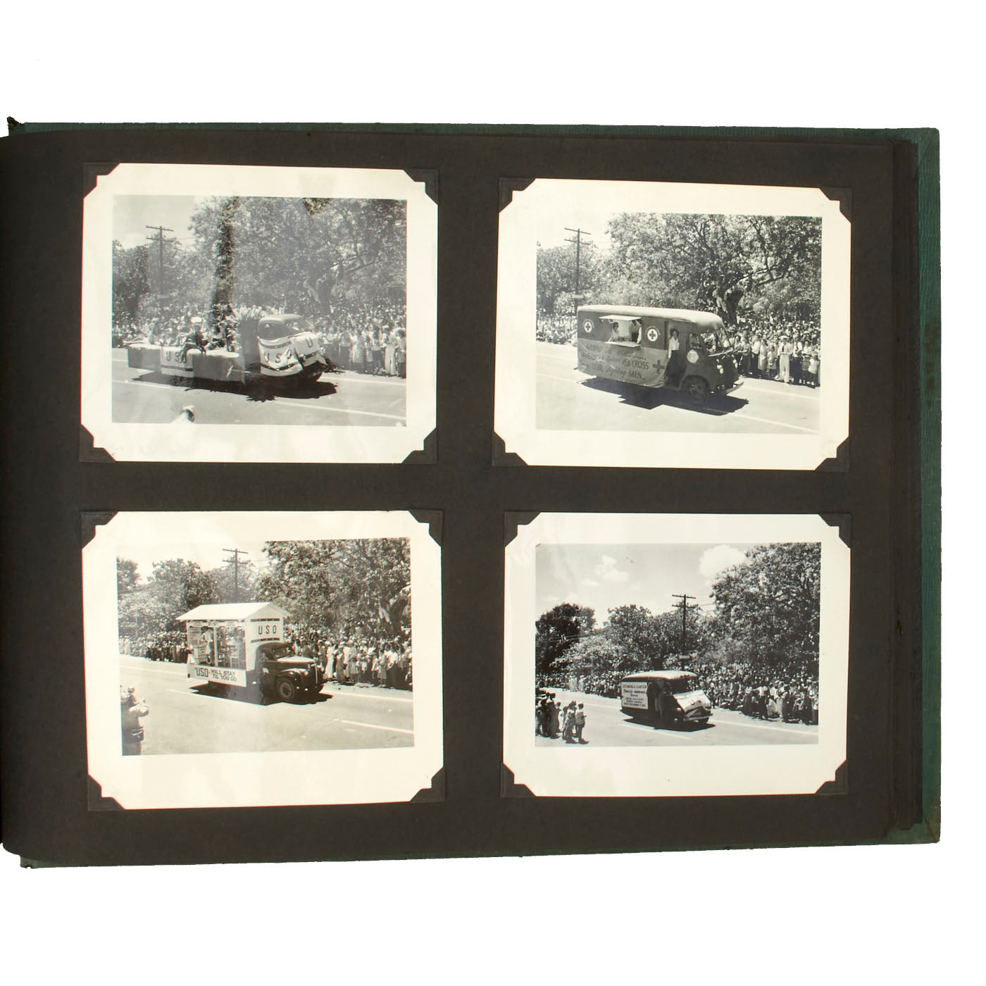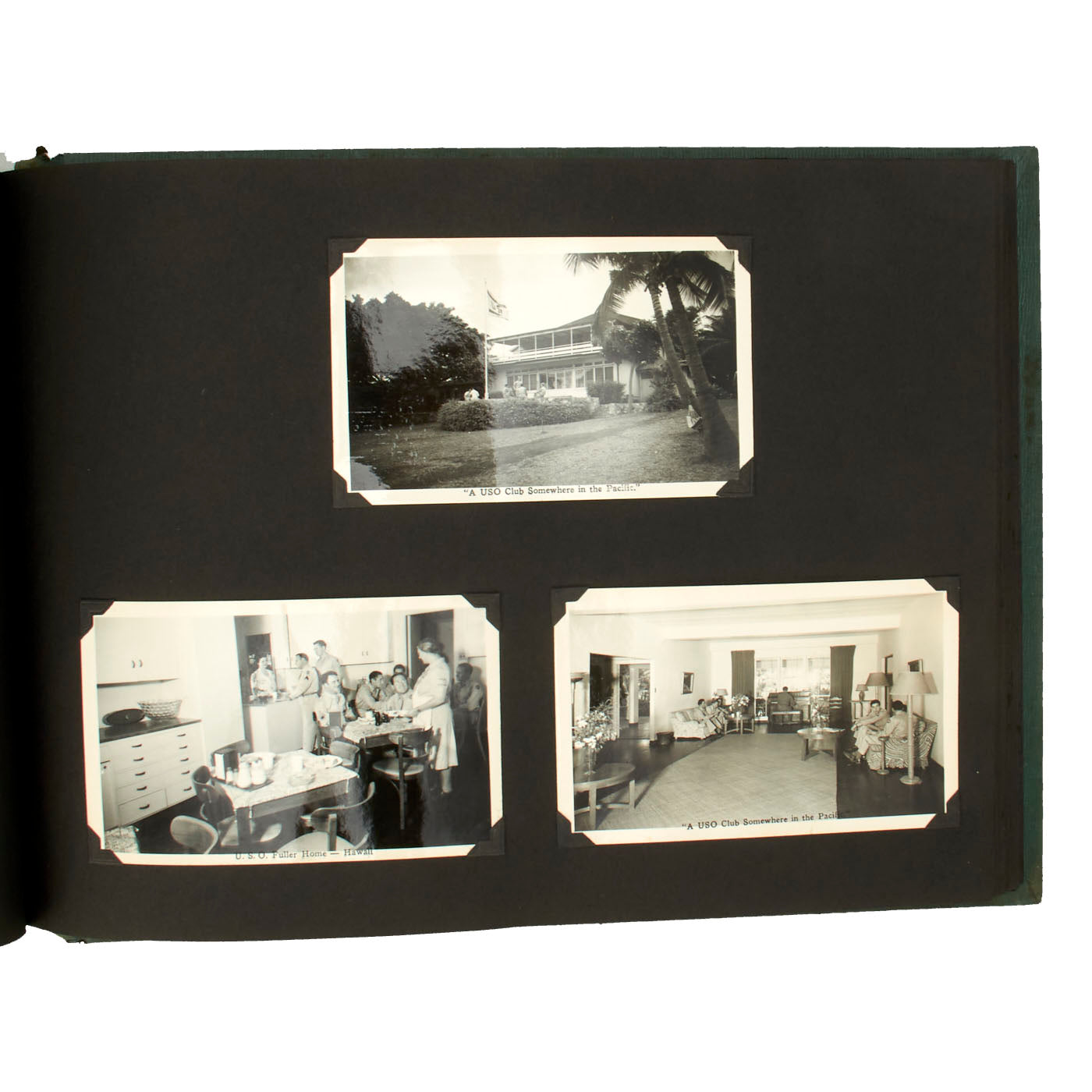 Most of the pictures featured in this album have a date range from 1945-46 and show great examples of what war time as well as post war time Hawaii was like. There are pictures of the aftermath of the Japanese attack at Pearl Harbor on December 7, 1941 as well as various images with the famed phrase “Remember Pearl Harbor” on them. It was hard not to remember Pearl Harbor because that attack affected every American in all corners of the globe. The pictures also show what island life was like, as well as the local inhabitants' life was like. Even in 1945, Hawaii was still a widely popular tourist destination, and these pictures show that. There are some beautiful shots of inside USO clubs and enlisted clubs, showing US Service Men and Women enjoying much needed rest and relaxation. There are pictures of island life, USO parades and even a picture of the newspaper printed when Germany surrendered, ending the war in Europe!