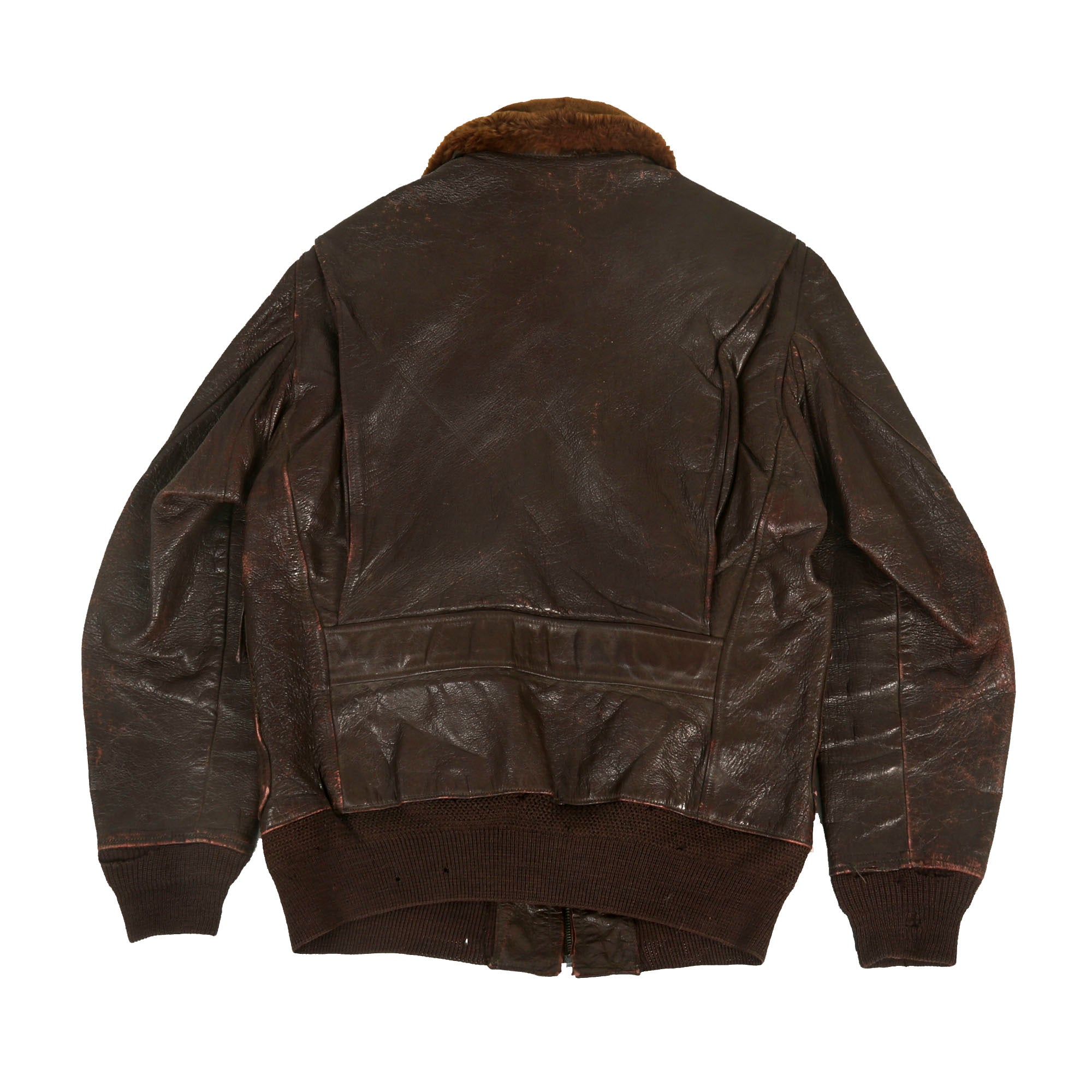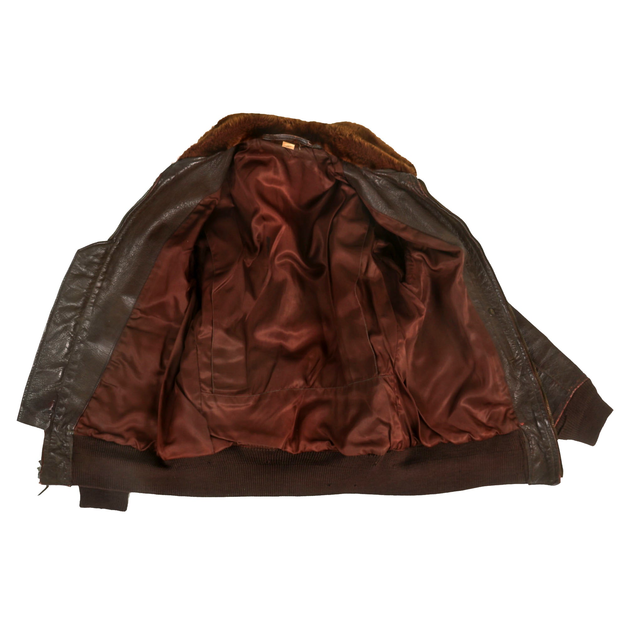 The jacket is well worn and without extensive damage. This was definitely service worn and not left behind for missions. The leather is somewhat stiff, but not brittle, the knit cuffs and waist are in good condition but does have minor holes and moth nips present. There is no data label present.