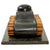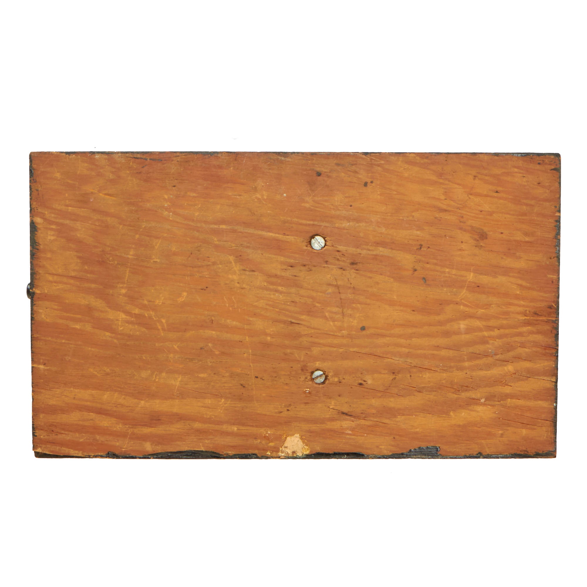 The black-painted wood & brass tank sits on a wood base measuring 7½ x 12¾”. At the front of the base is a plaque bearing Camp Washington. The tank itself has a wood body with brass caterpillar tracks. The very top piece of the tank rotates to change the year displayed directly below it, with 1945, 1946, 1947, 1948, 1949, and 1950. 1945 is worn down and only 45 is visible, but the rest of the years look great. The gun barrel can be lifted up and pushed down to cycle through the calendar year, with a slot on the left displaying the days, 1-31, and the right slot displaying the month abbreviation, and pushing down when it’s at 31 will change the month. The barrel is very delicate, so please use caution when handling it. A small wheel on the right side of the tank allows the cycling of the day of the week.