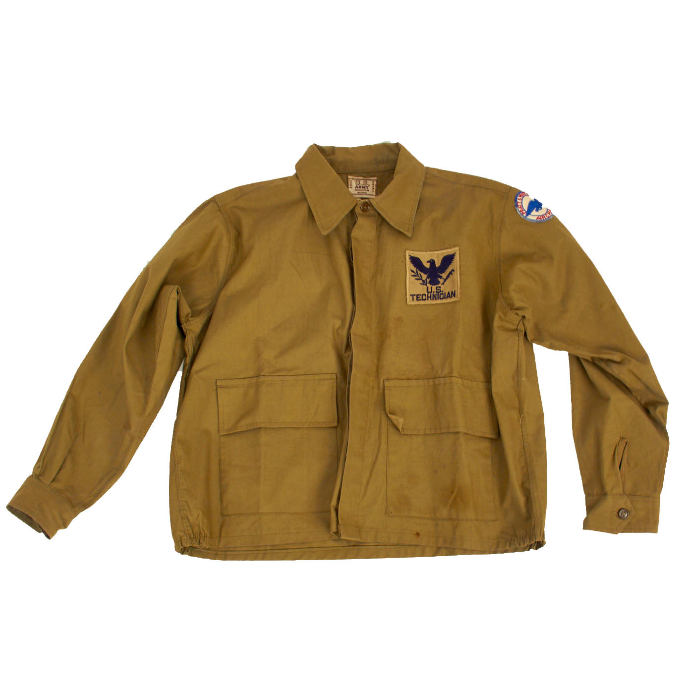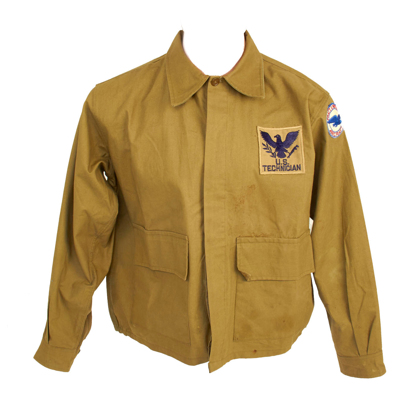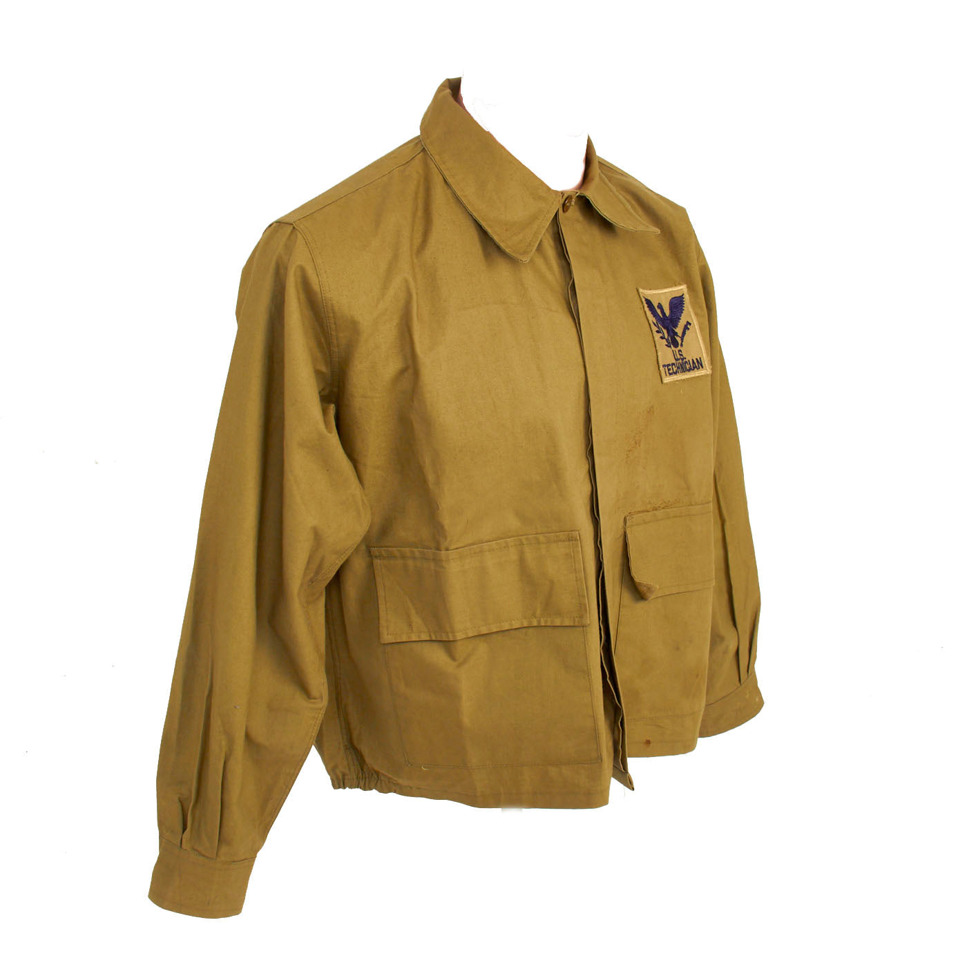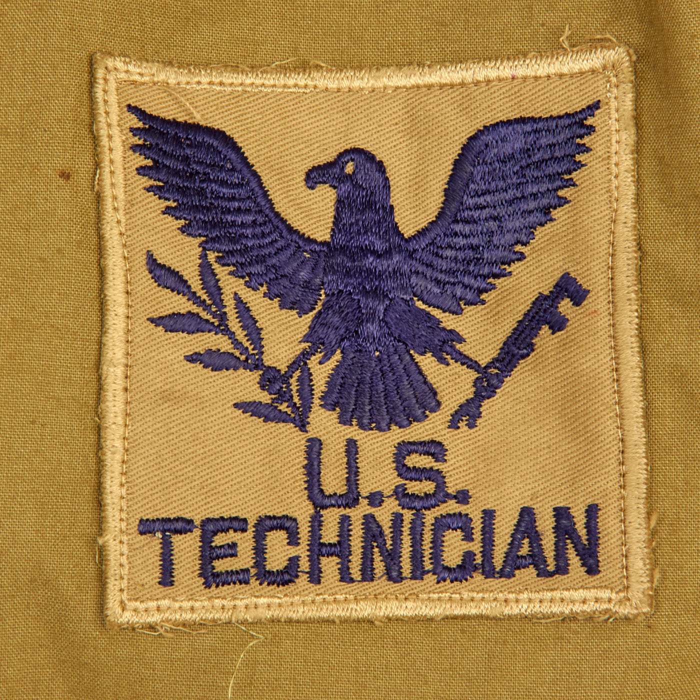 This jacket would have more than likely been worn by one of those 40,000 employed by the company during the war. The jacket is in very good condition and does show signs of use and wear, but has no significant damage present. The left shoulder features the Pratt and Whitney “eagle” logo roundel. The front left has a square U.S. TECHNICIAN patch, identifying the employee.