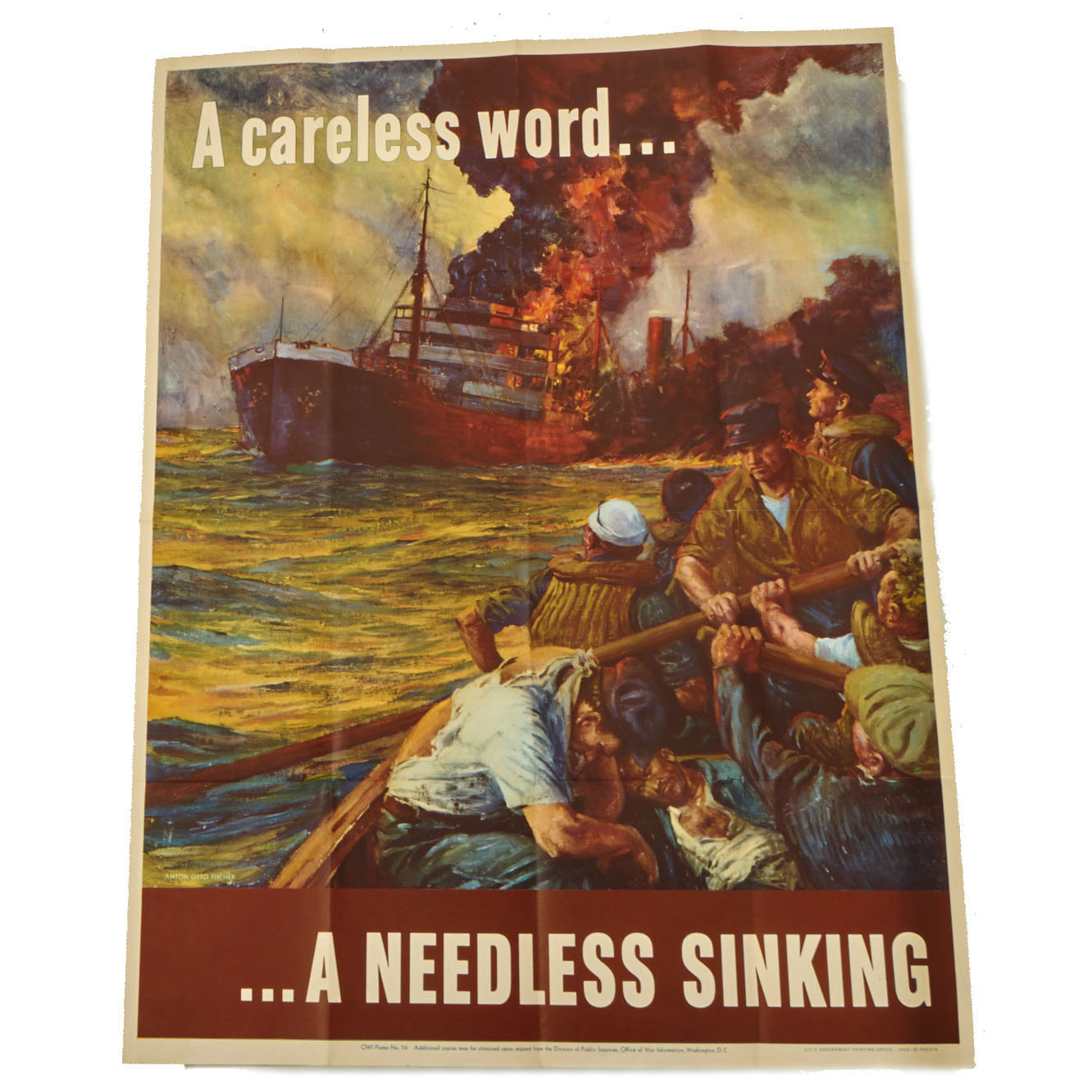 Original Item: Only One Available. During WWII, the government commissioned propaganda posters to teach American citizens and soldiers that careless speech could endanger national security. Any American with knowledge of troop movements, military equipment, or any other information that might prove useful to the enemy was encouraged to keep quiet. To remind all Americans of their duty, the Office of War Information (OWI) commissioned artists to create propaganda posters. The posters were hung in public places and widely reprinted. They used imagery that tugged at heartstrings, invoked fear, and appealed to a sense of patriotism.