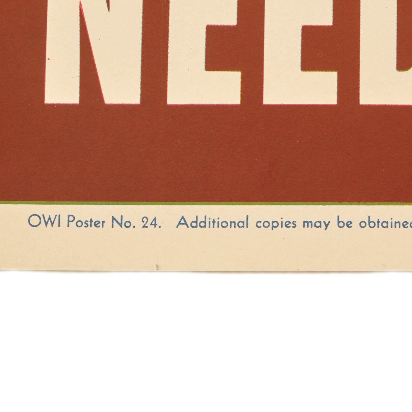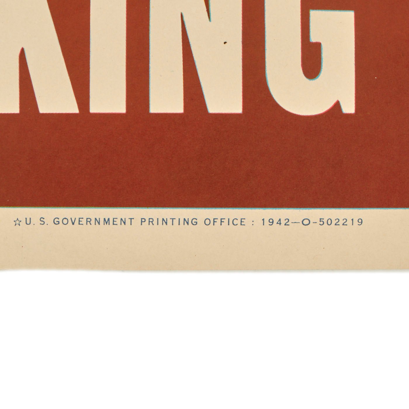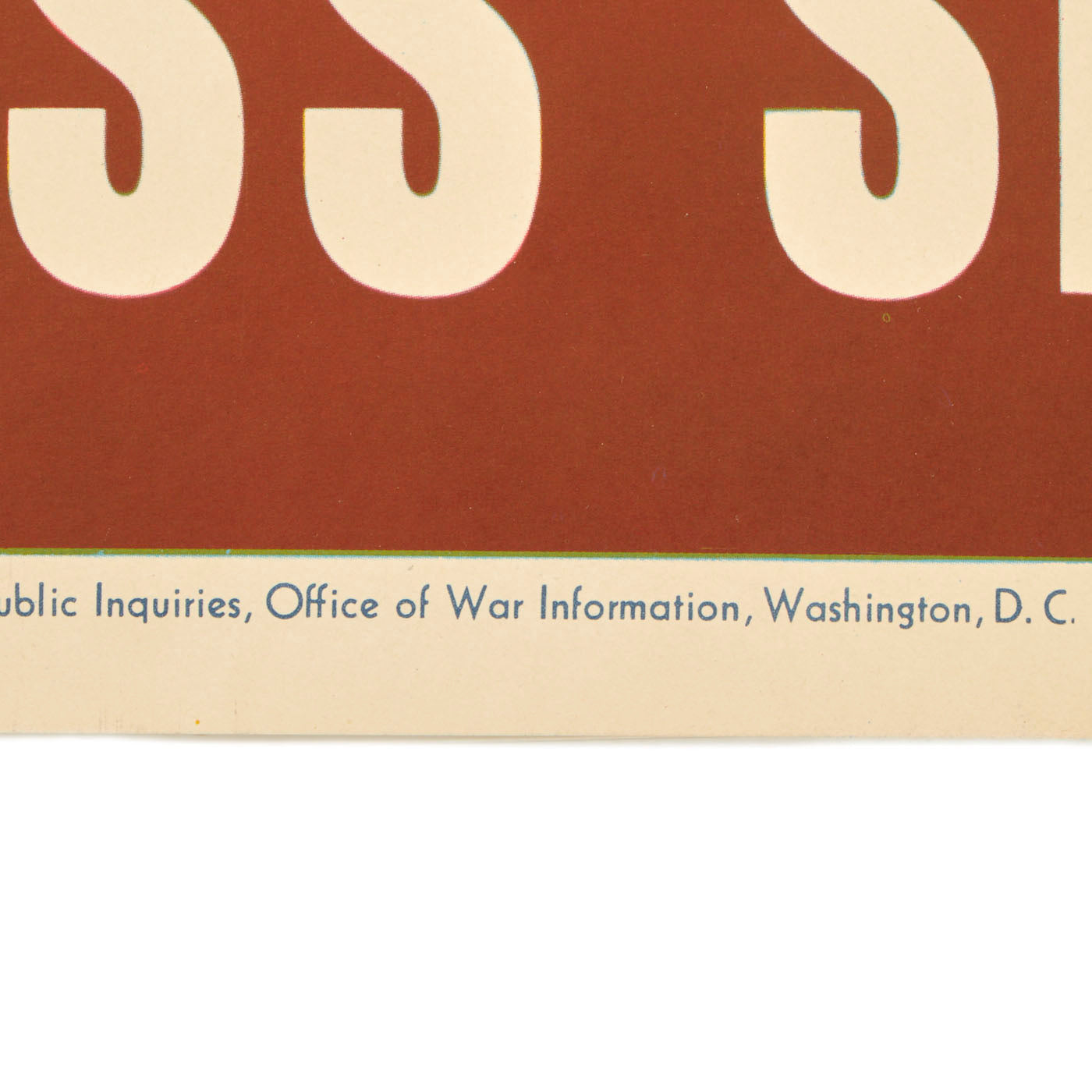 The poster appears to have never been issued out and still has its original “factory” folds that were made when being issued out. The bottom border of the poster is marked: "OWI Poster No. 24. Additional copies may be obtained upon request from the Division of Public Inquiries, Office of War Information, Washington, D.C." and "U.S. Government Printing Office: 1942-O-502219."
